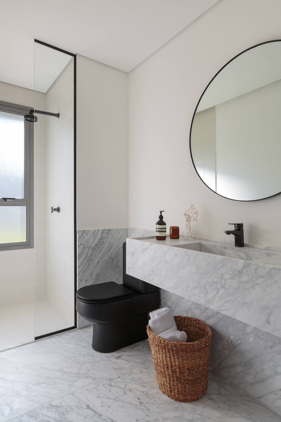 Suite 01: Suite 01 was designed for a young adult who prefers sober colors and lots of comfort. The entire closure of the cabinets is made of glass, allowing a visual expansion of the space and partially revealing the interior of these volumes. The wooden headboard has two sconces for indirect lighting and loose side tables for support. On the wall in front of the bed, we have a bench that will work on a daily basis as a home office and also a television. In the bathroom, Carrara Venatino marble was chosen as the coating, in addition to green ceramics.