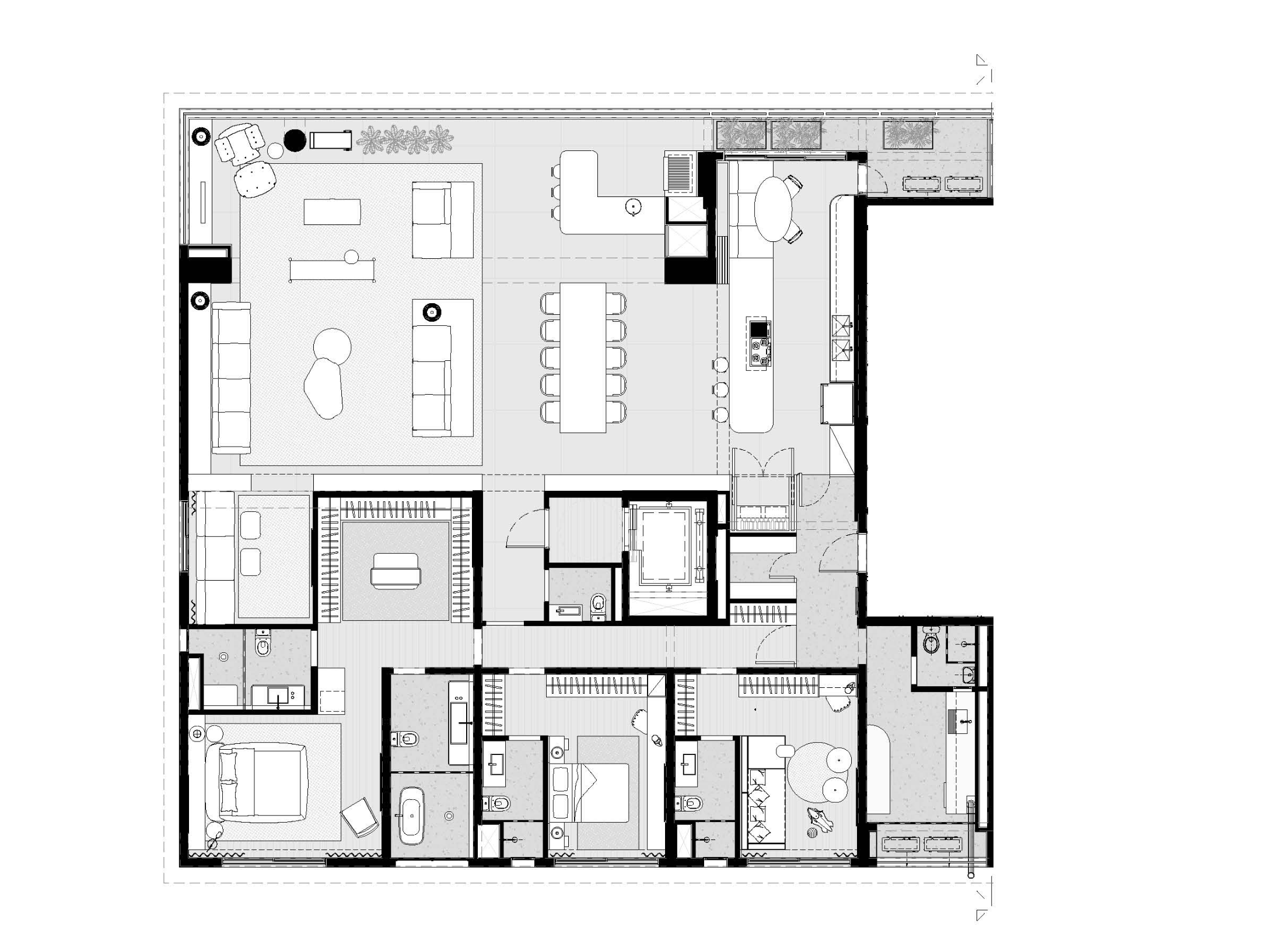 The general concept of this Interior Design took into consideration some initial conditions, such as the architectural project with its materiality and mood (pure lines, wooden surfaces, green vegetation and stone). This would allow the apartment to be a proper extension of the whole experience provided by the Casa Alto de Pinheiros building. The lifestyle of a family of four (a couple with 2 kids of different ages) was also taken into account, along with the common habit of welcoming friends for events at home; Activities such as receiving, working, studying, relaxing, sleeping and cooking are all considered as essential dynamics in contemporary living, and were here absorbed for the design of environments.