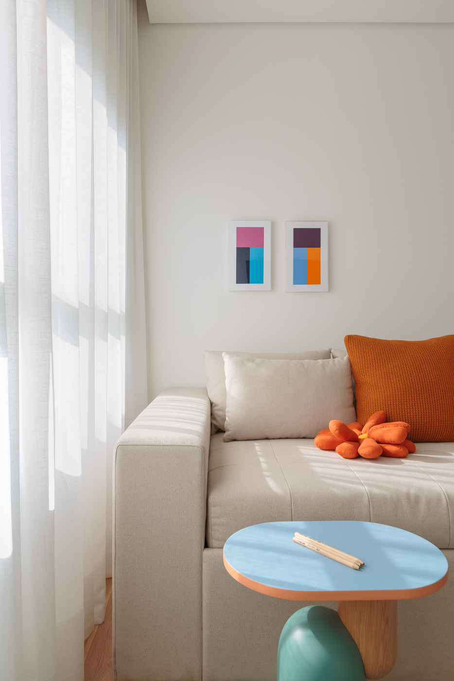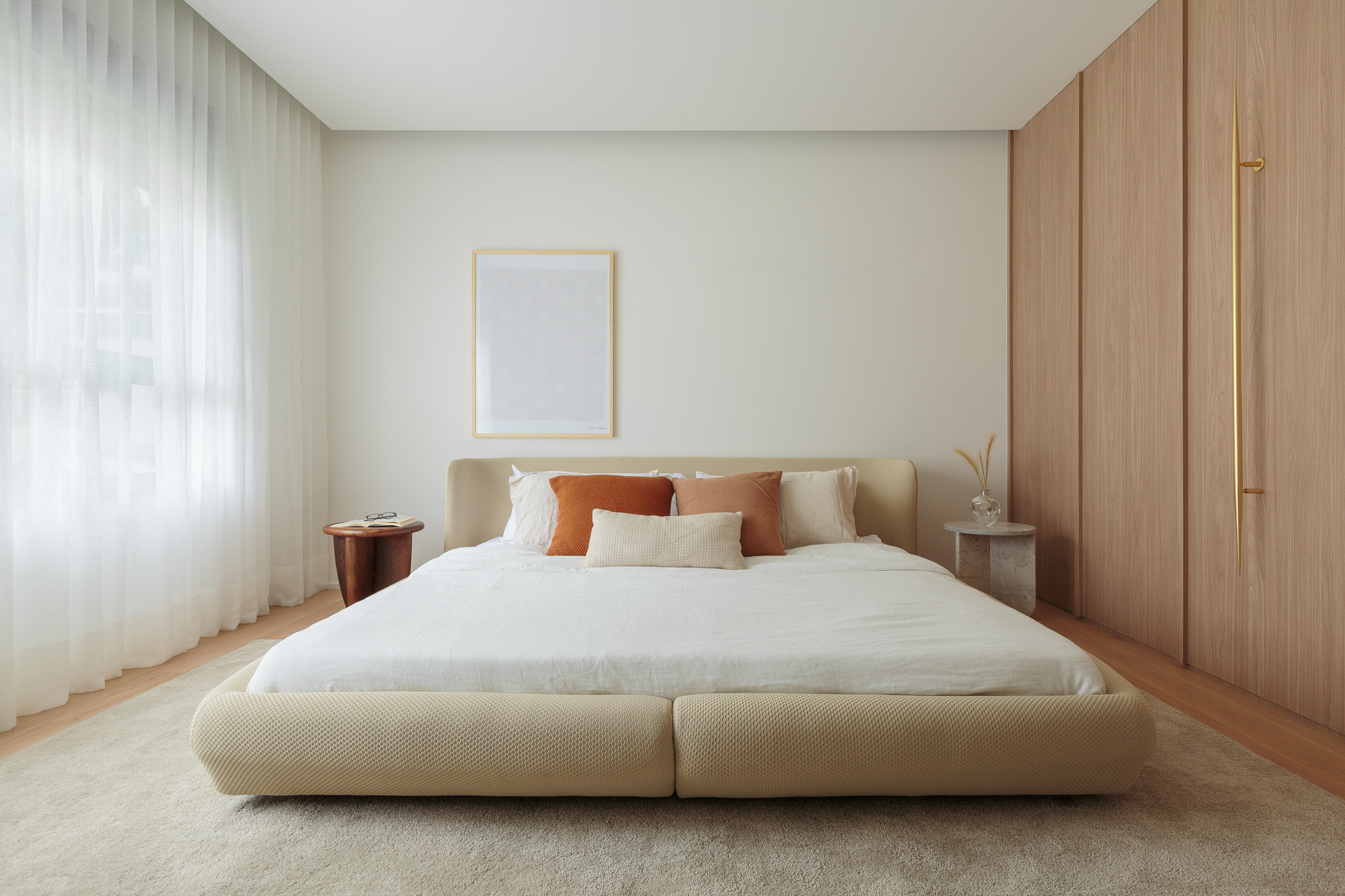 The social area prioritizes the integration of spaces and uses, as it is distributed as a single large space, where the kitchen can be closed or opened in order to create different moments. In addition to the view, the major protagonist is the bookcase that outlines the entire perimeter of the room, ensuring visual continuity. The balcony is integrated into the living room, serving as a gourmet space where family events can take place. Equipped with a barbecue and an island, this space also connects with the living and dining areas. In addition, a large counter is placed in the division between the kitchen and the living room, with the possibility of closing it through doors, thus creating an environment with more privacy and organization. The living room is even more spacious and has plenty of comfortable seating for meetings with friends, as well as a wine cellar displaying the couple's wine collection. Next to the living room – and as if it were inside the bookcase – there is the home theater, where it is possible to have private and cozy cinema sessions. Both in this environment and throughout the rest of the apartment, there was a precise curatorial work of furniture and design for the composition of spaces.