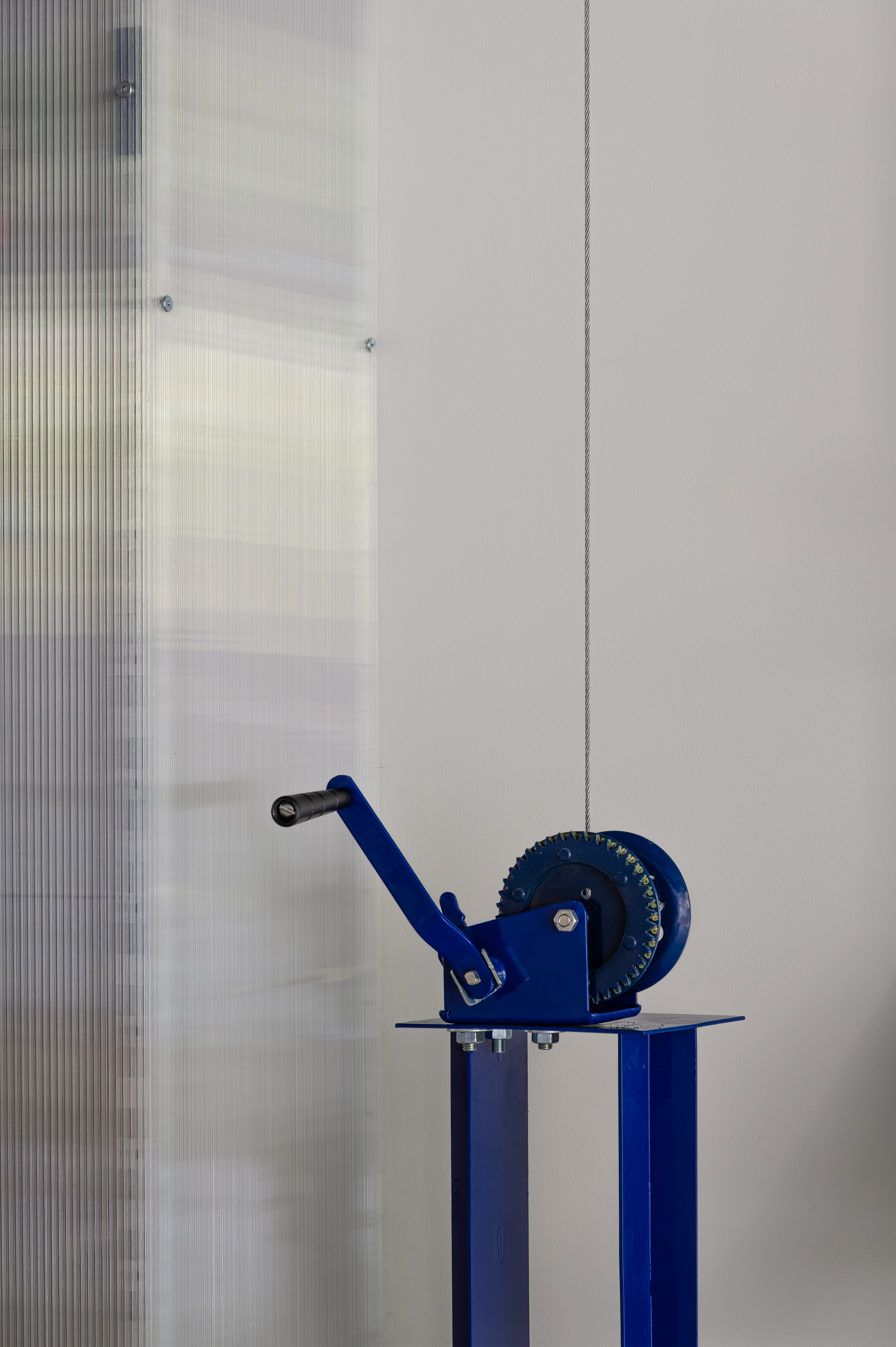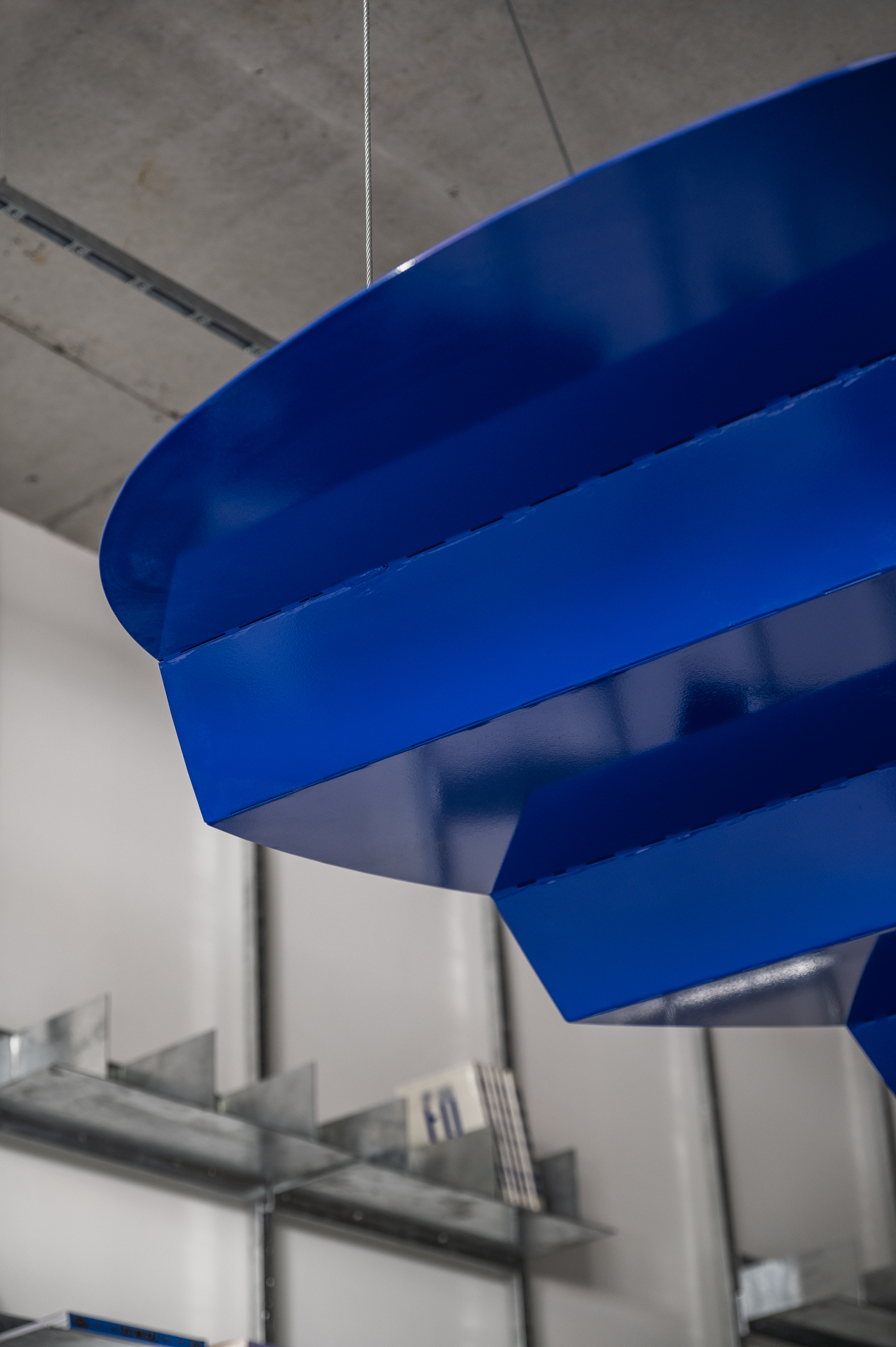 The Readellion bookstore offers a selection of design-oriented books and magazines. The 44 sq.m space is designed to be easily reorganized based on the constantly changing and expanding content. The middle of the space there's a custom-designed suspended island that can be raised by a pulley to create room for presentations or book club meetings. During working hours, it serves as a display for new releases. The side walls feature an adjustable system of pillars with custom-designed shelves for books and merchandise. The storage stand, following the same structural system, is finished with cellular polycarbonate to gently separate the main area from the back office. The exhibition surfaces are made of galvanized steel as well as painted "readellion blue" panels to emphasize the displayed content.