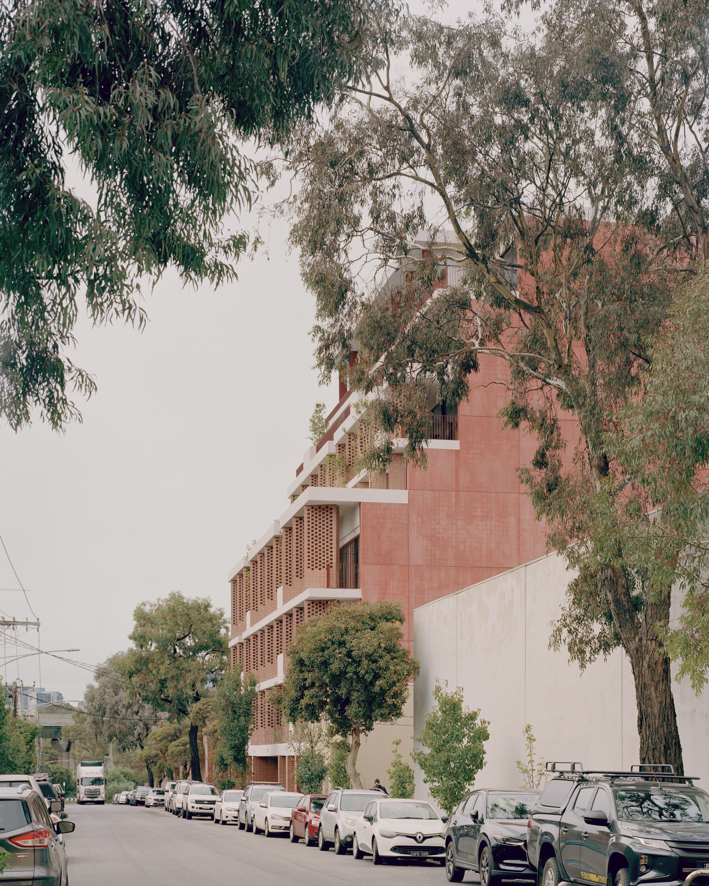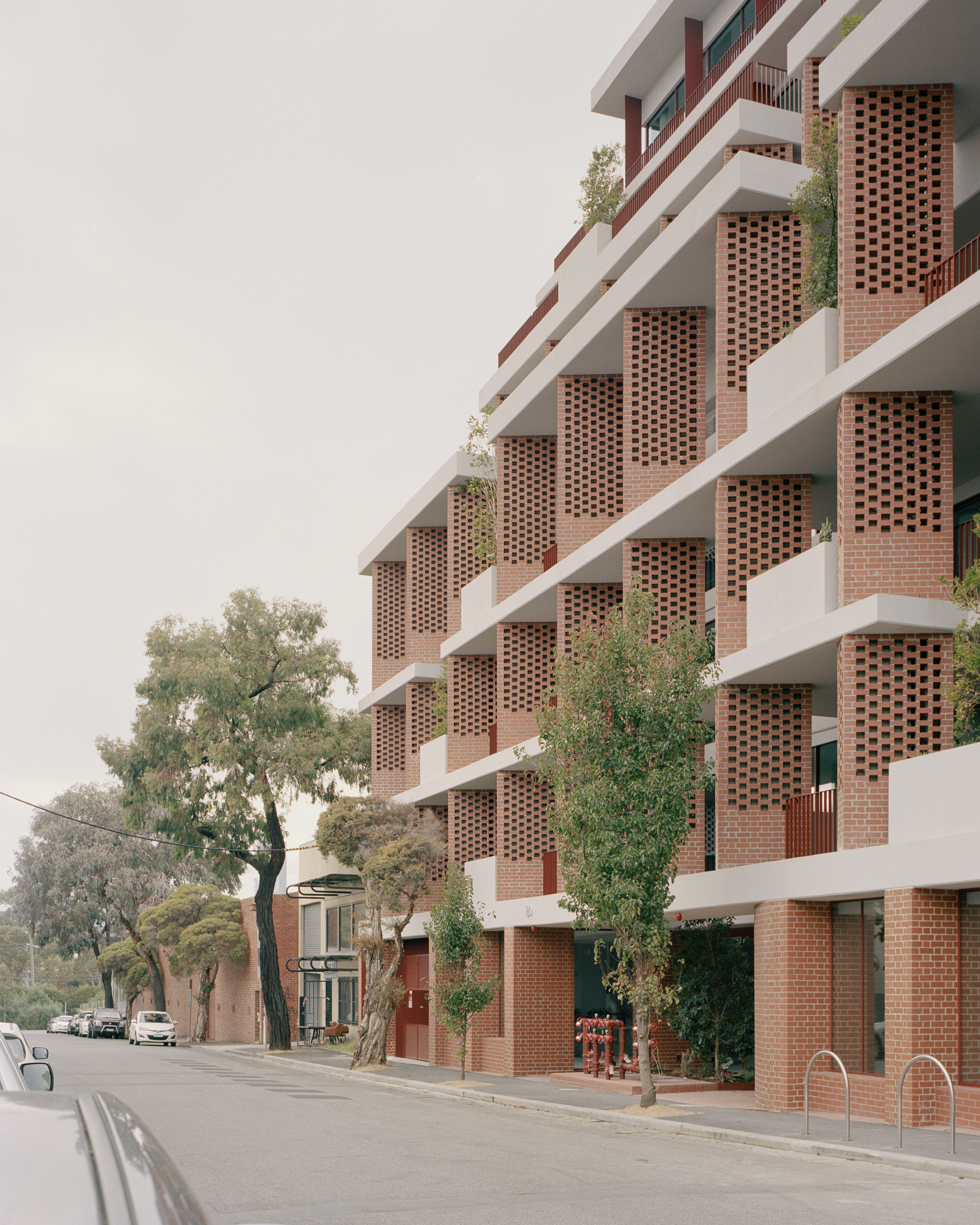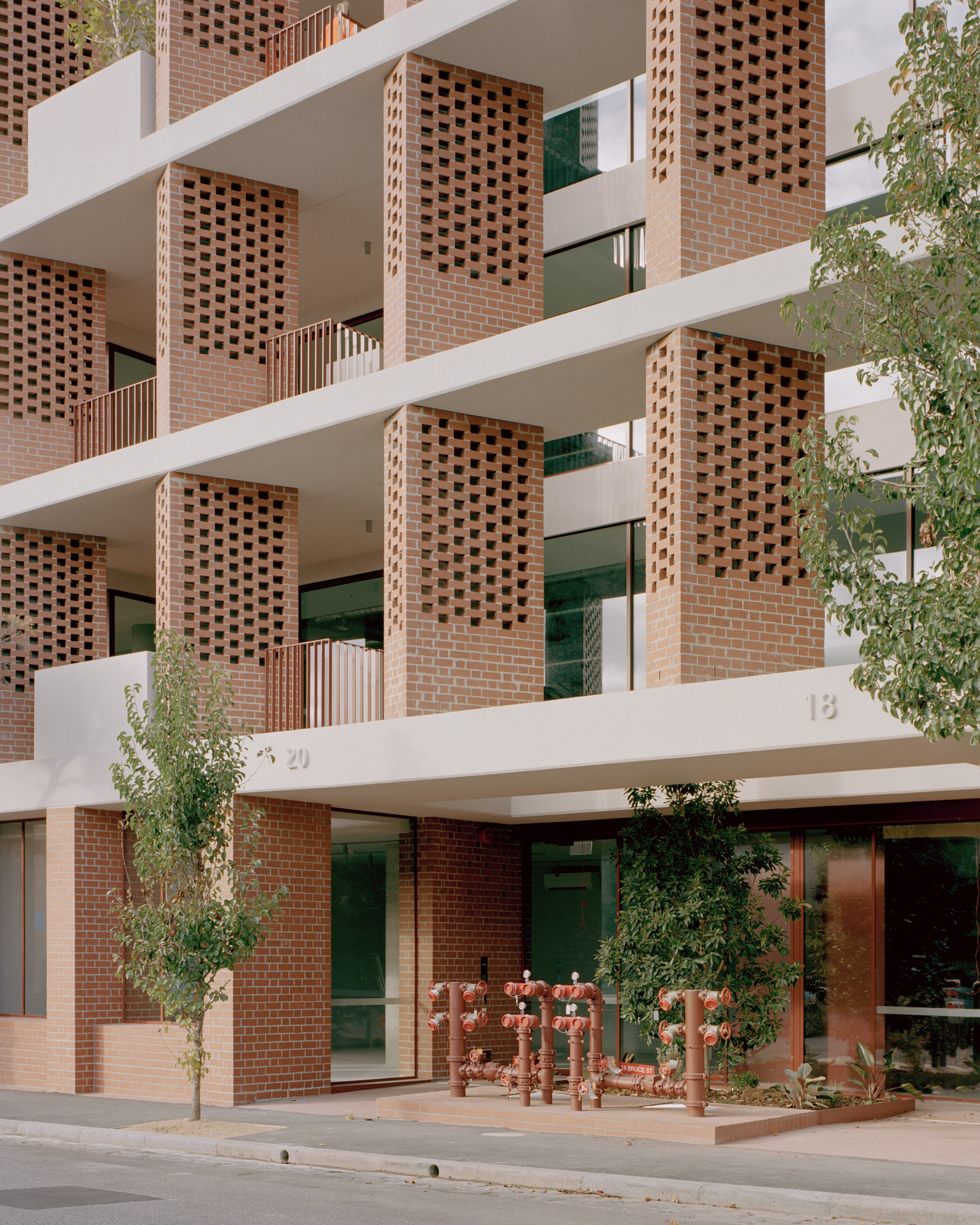 Composed predominantly of concrete, recycled bricks and glazed elements, the podium is made up of four levels and faces directly onto Bruce Street, while the four levels above the podium are set back four meters to break up the form and massing. The architecture responds to the vernacular of the existing fabric of Kensington and nearby warehouse buildings.
