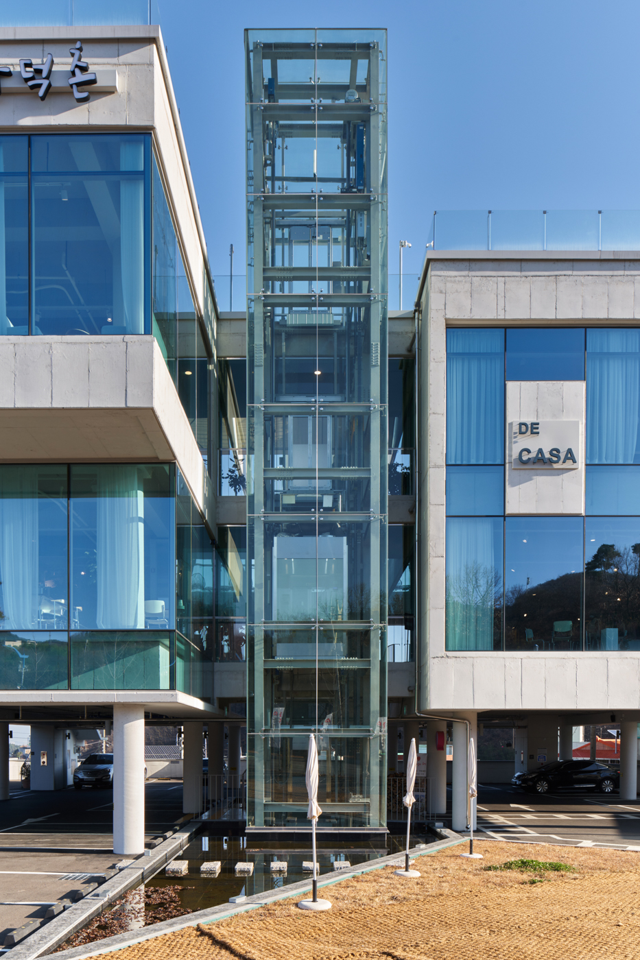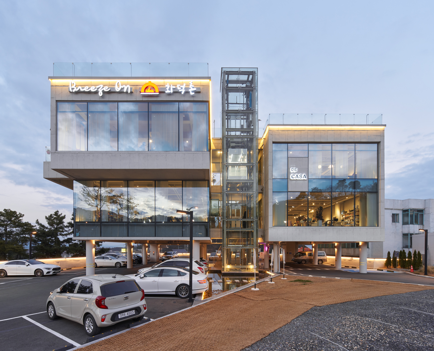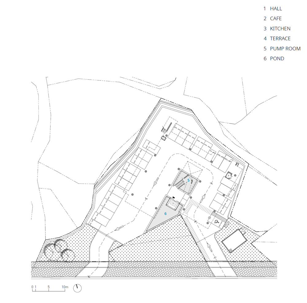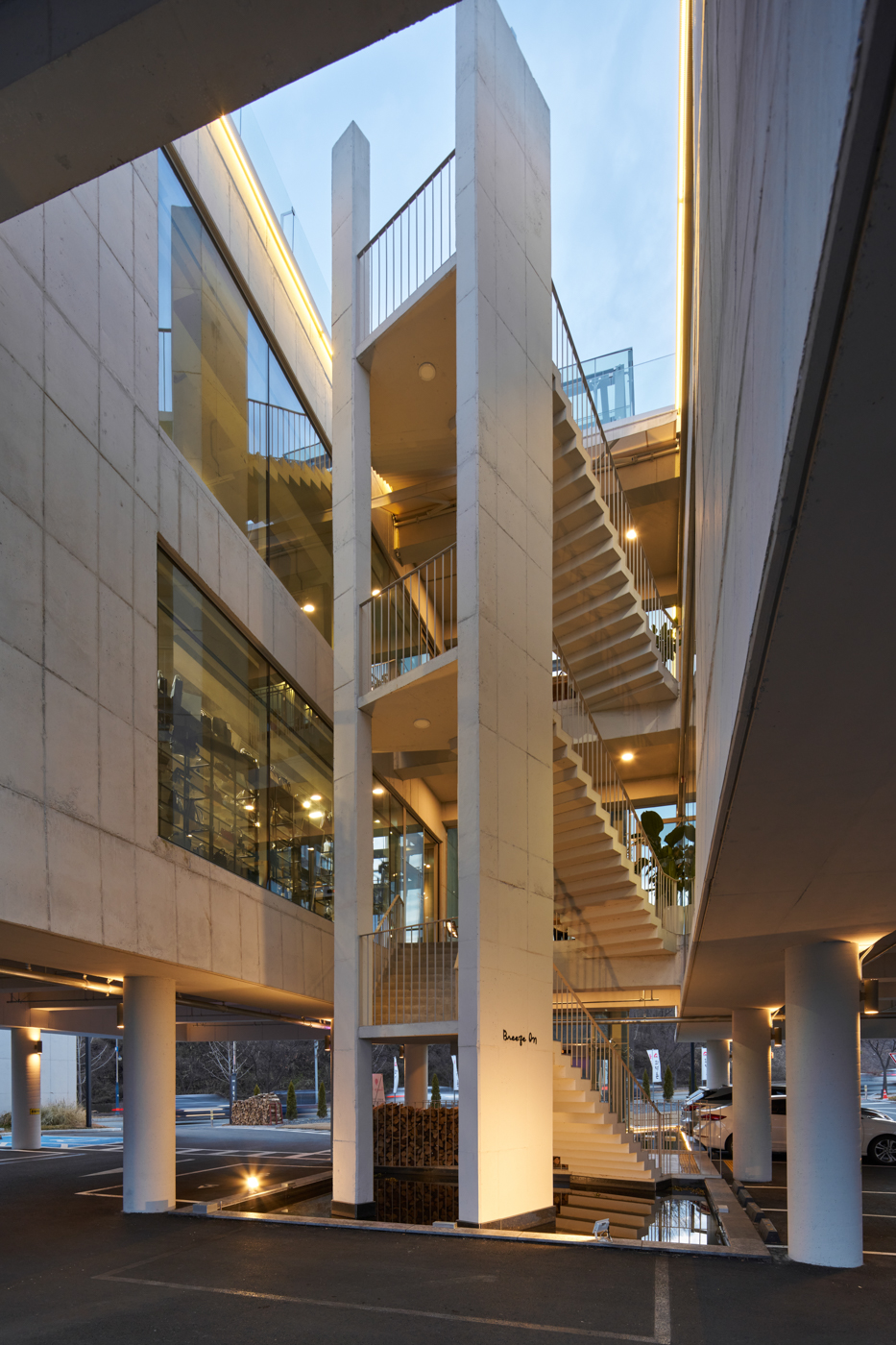 Breeze On is a concrete mass of rock lifted off the ground and split in two. A glass column and bridges create a vertical circulation system between the two concrete blocks, maintaining an appropriate relationship where interaction occurs despite the separation. Vehicular traffic on the main road conforms to the shape of the site and creates a natural approach. The V-shaped site was utilized to create a circulation system by separating the entrance and exit according to the shape of the site. The central water space, which visitors first encounter on foot, reflects rainy and windy days on its surface. On a clear day, the surrounding landscape and buildings are drawn into the water, adding depth to the space and showing visitors the different faces of the building. The water space is an expression that gives life to the building.