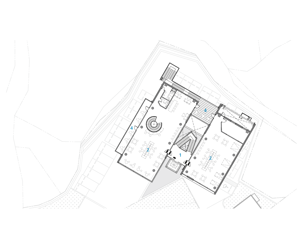 Going up the central staircase or elevator, the visitor is presented with two different directions. You can linger on the concourse bridge for a while and explore the space around it, which is not visible from the outside of the building. The central staircase, the two pillars that support the staircase, and the architectural lines and structures of the observation elevator partially block yet keep open the view from the outside, blurring the boundaries. The protruding cantilevered balcony on the third floor is a space for those who want to get a little closer to the natural landscape, and a place where visitors can fulfill their cravings for nature.