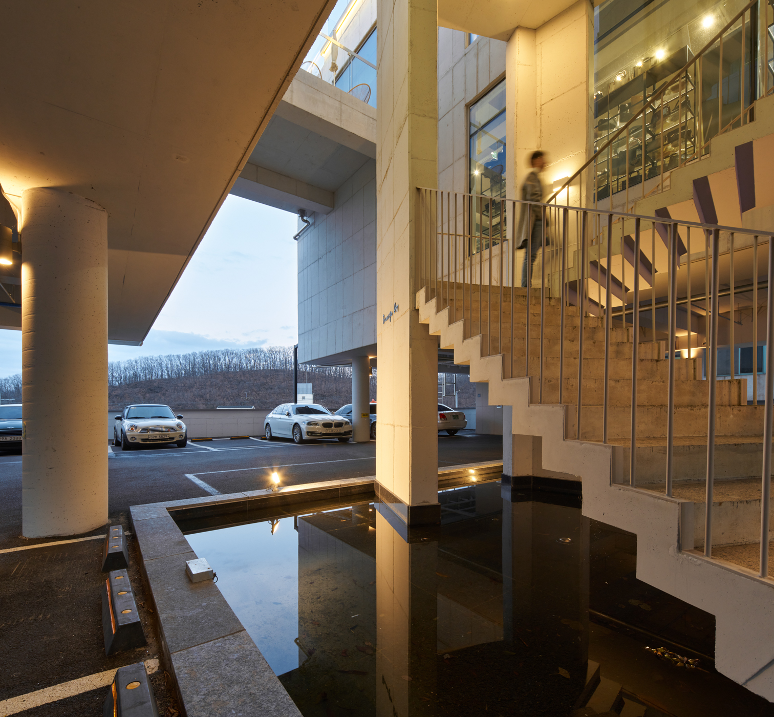 The staircase, located in the center of the two buildings, serves many purposes. First, it is the main evacuation staircase that protects the safety of visitors. Second, the two concrete pillars standing on the landing serve as structural pillars that support the stairs and work as a sculpture. At the entrance to the old village, two wooden jangseungs[1] stand to guard the village and welcome visitors. These two pillars reaching up to the sky are the centerpiece that protects the building and provide a memorable backdrop for visitors. The outdoor terrace on the third floor serves as an evacuation route and at the same time serves as an observatory and rest area where visitors can enjoy the distant scenery unfolding through the gap between the two buildings.