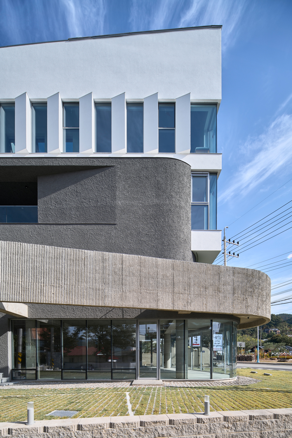 The site adjacent to the Seojong local road has an unusual shape, being narrow at the point facing the road and widening as it goes deeper. The narrow side adjacent to it was a major disadvantage as a location for a shopping center. Fortunately, the area has more vehicle access than pedestrian access, so we imagined the various shapes that would be encountered as vehicles move at high speed. We hoped that the different elevations visible from both directions, and the volumes of the building that read differently due to flexible curved surfaces that extend deep into the site, would create a peculiar impression and generate curiosity, leading to new relationships.