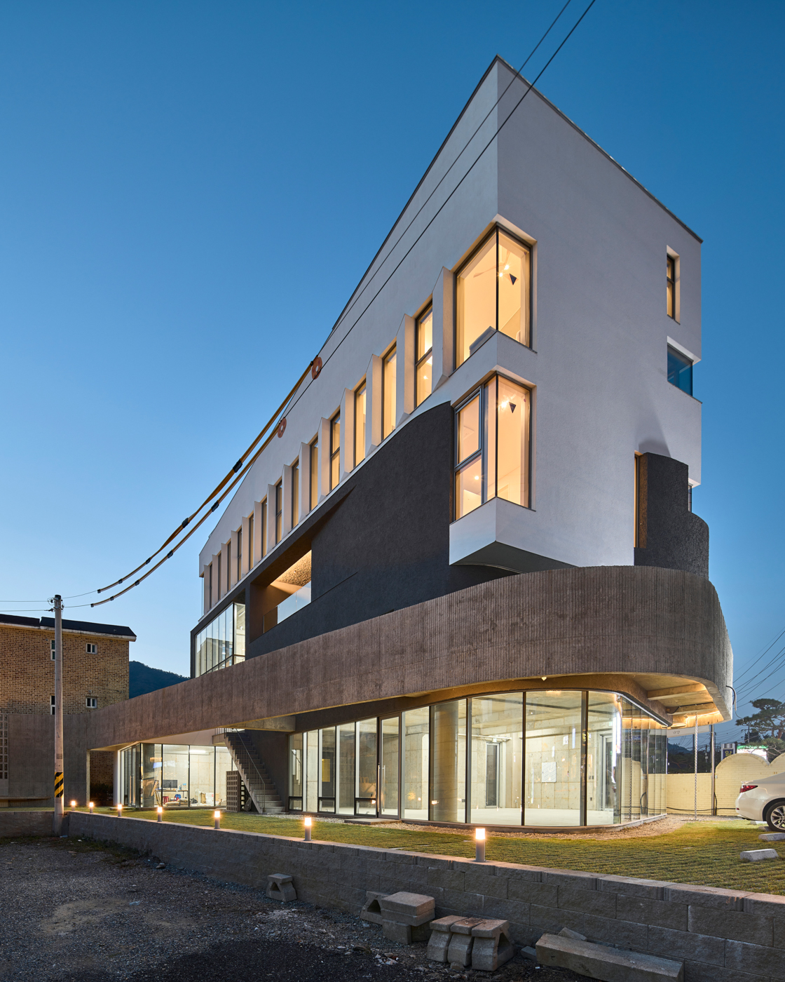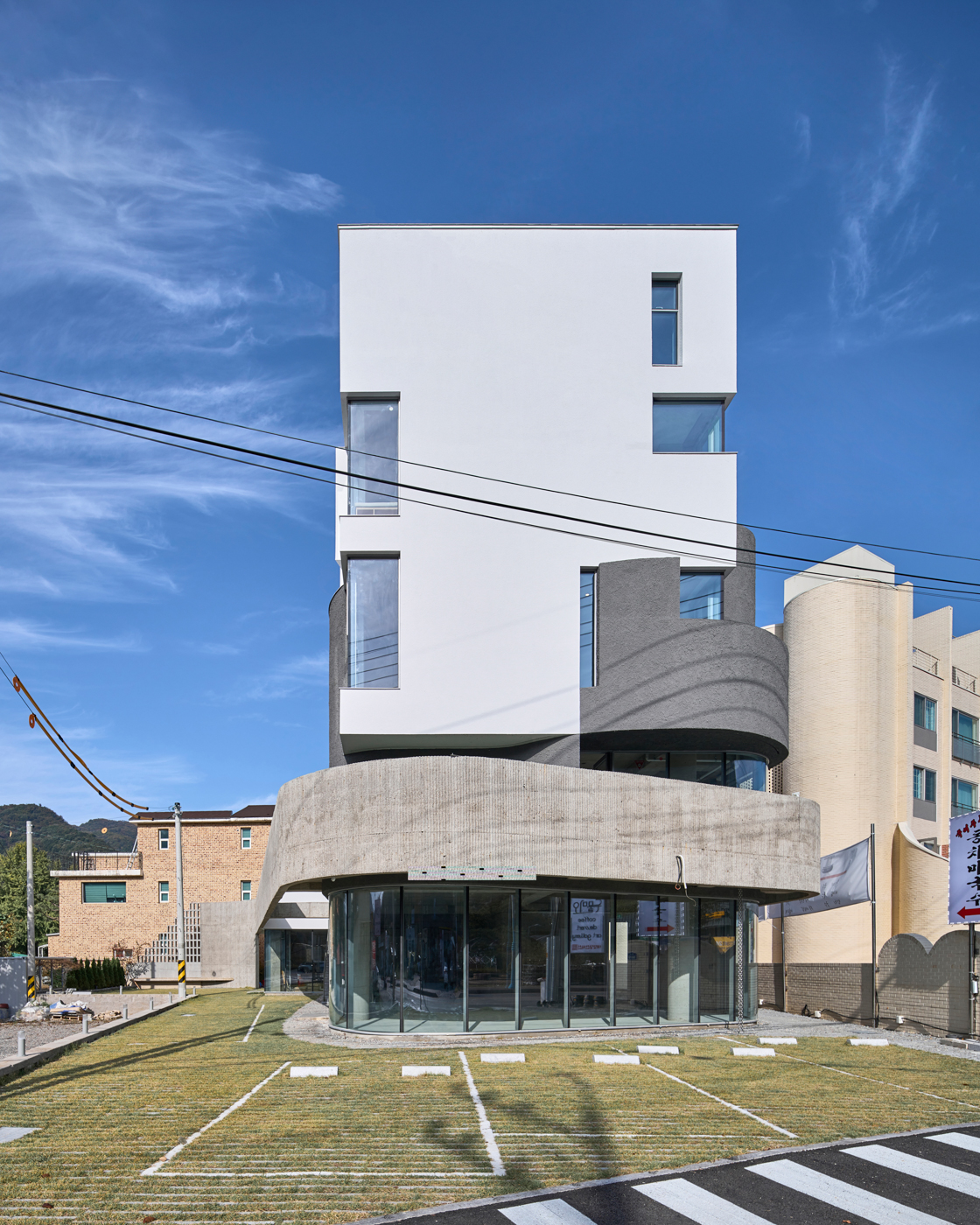 서종 지방도에 접한 대지는 도로에 면한 곳은 좁고, 깊어질수록 넓어지는 특이한 형상을 가졌다. 접도한 좁은 면은 상가의 입지로는 큰 약점이었다. 다행히 보행자 위주의 접근보다 차량의 접근이 많은 지역이라 차량의 빠른 이동 속도에서 맞닥뜨리는 다채로운 형상을 상상했다. 양방향의 이동에서 보이는 서로 다른 입면의 모습, 대지의 안쪽 깊은 곳까지 이어지는 유연한 곡면으로 다르게 읽히는 건물의 볼륨이 기이한 인상을 만들고 호기심을 불러 새로운 인연으로 이어지길 기대했다.