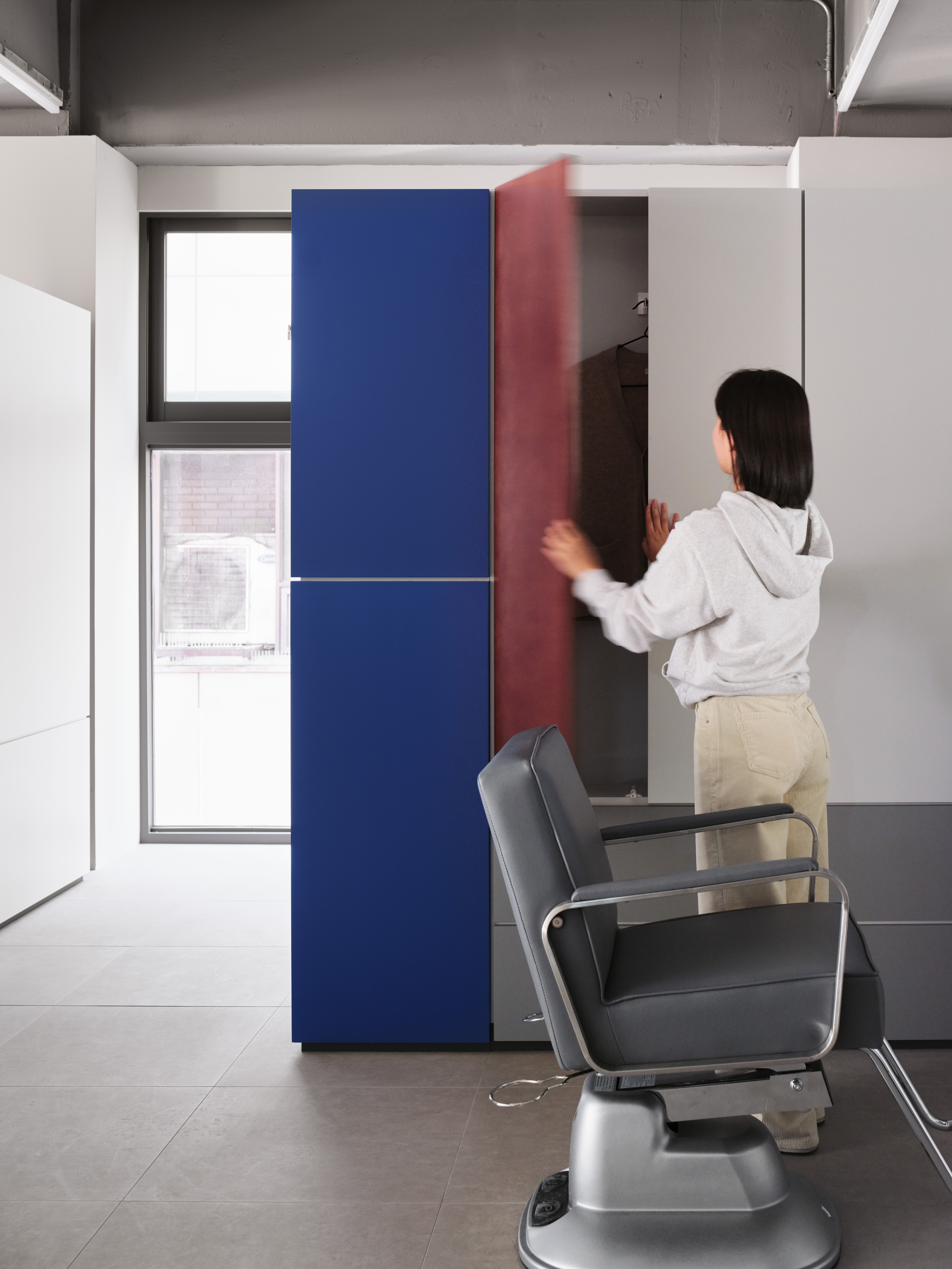 훗날 모든 직업이 전문화, 세분화하고 의학이 발달하면서 전문 외과 의사가 등장하지만, 이발소 삼색등은 여전히 이발소를 상징하는 마크가 되었고, 외과 의사들은 적십자 마크를 사용하게 되었다. 지금은 그 자취마저 찾기 쉽지 않은 이발소지만 그 직업의 유래는 이처럼 아주 유구하다. ‘미장원’은 이러한 이발소 삼색등의 기억과 클라이언트의 요구 사항이었던 미드센츄리모던(Mid-Century Modern) 스타일의 낭만적 분위기를 적절하게 접목해 연출한 공간이다.