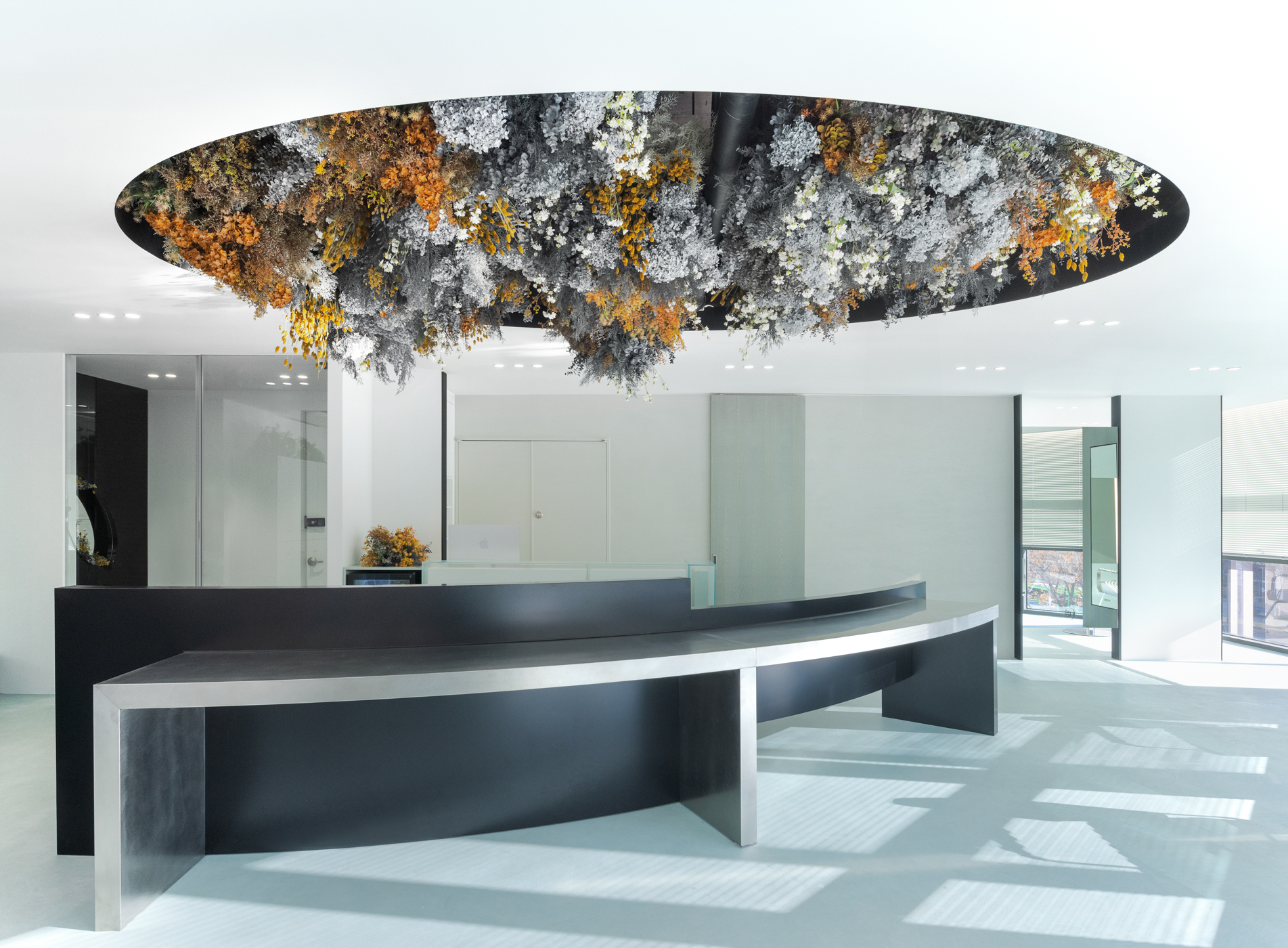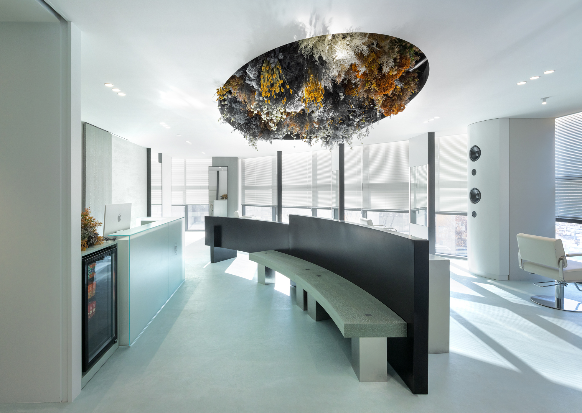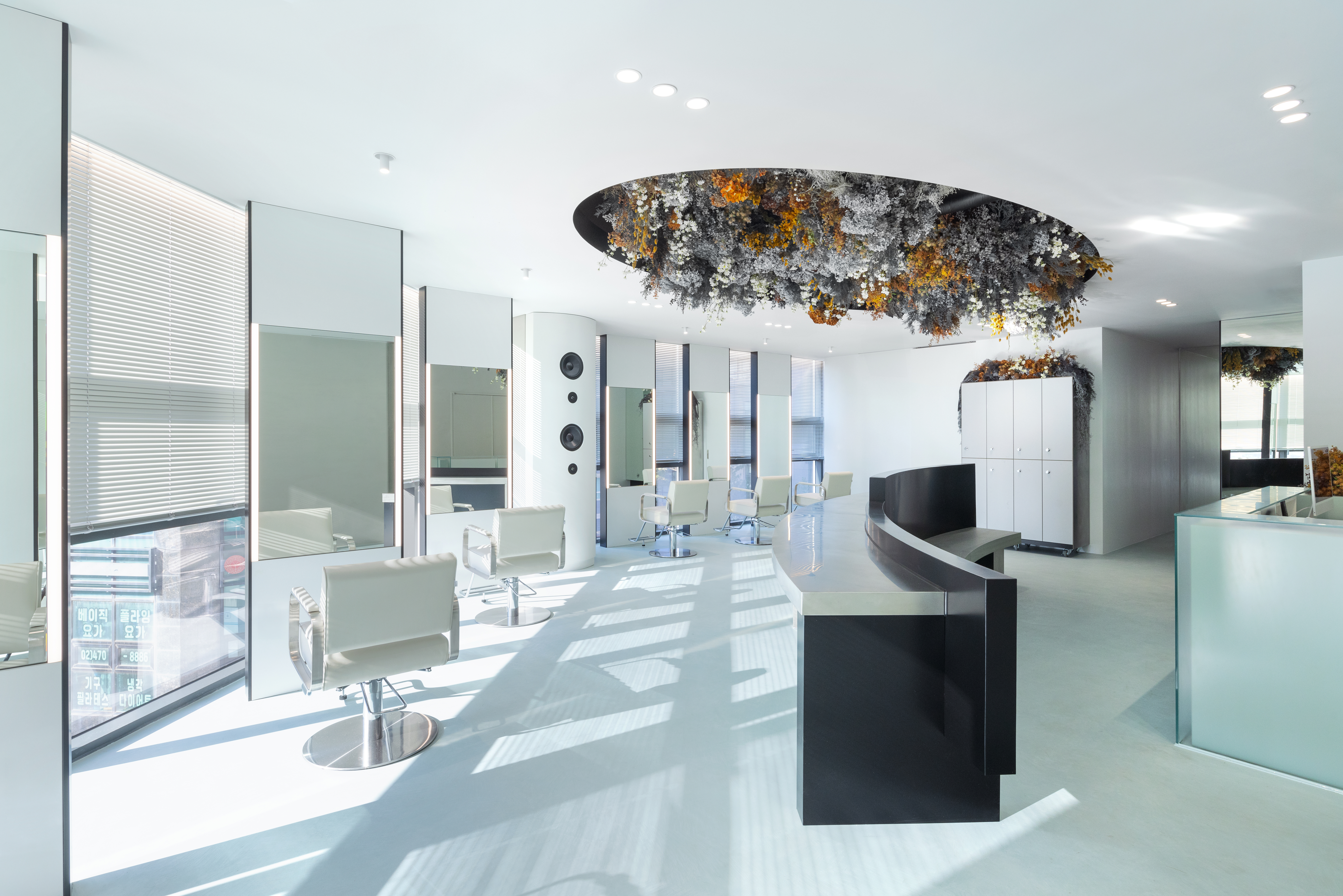 1인용 경대 7대를 창가라인에 맞춰서 배치하기 보다는 채광을 가장 많이 들어올 수 있는 방향으로 경대를 배치했다. 그로 인해 사선라인의 창가에서 들어오는 채광을 홀 중앙까지 끌어들이고, 거울에 반사되는 시선을 한방향으로 정리했다. 공간의 사선이 차지하는 면적이 적지 않기 때문에 사선이 주는 강렬함을 공간 컨셉과 어울리도록 하기위해서 부드러운 곡선이 필요했다. 공간 컨셉의 메인이 될 수 있는 홀 중앙 천장에 가로세로 4.5미터, 2.5미터의 커다란 타원형의 단천장을 만들었고, 곡선 안쪽을 플랜테리어 작가의 작품으로 가득 채워 컨셉을 부각시켰다.