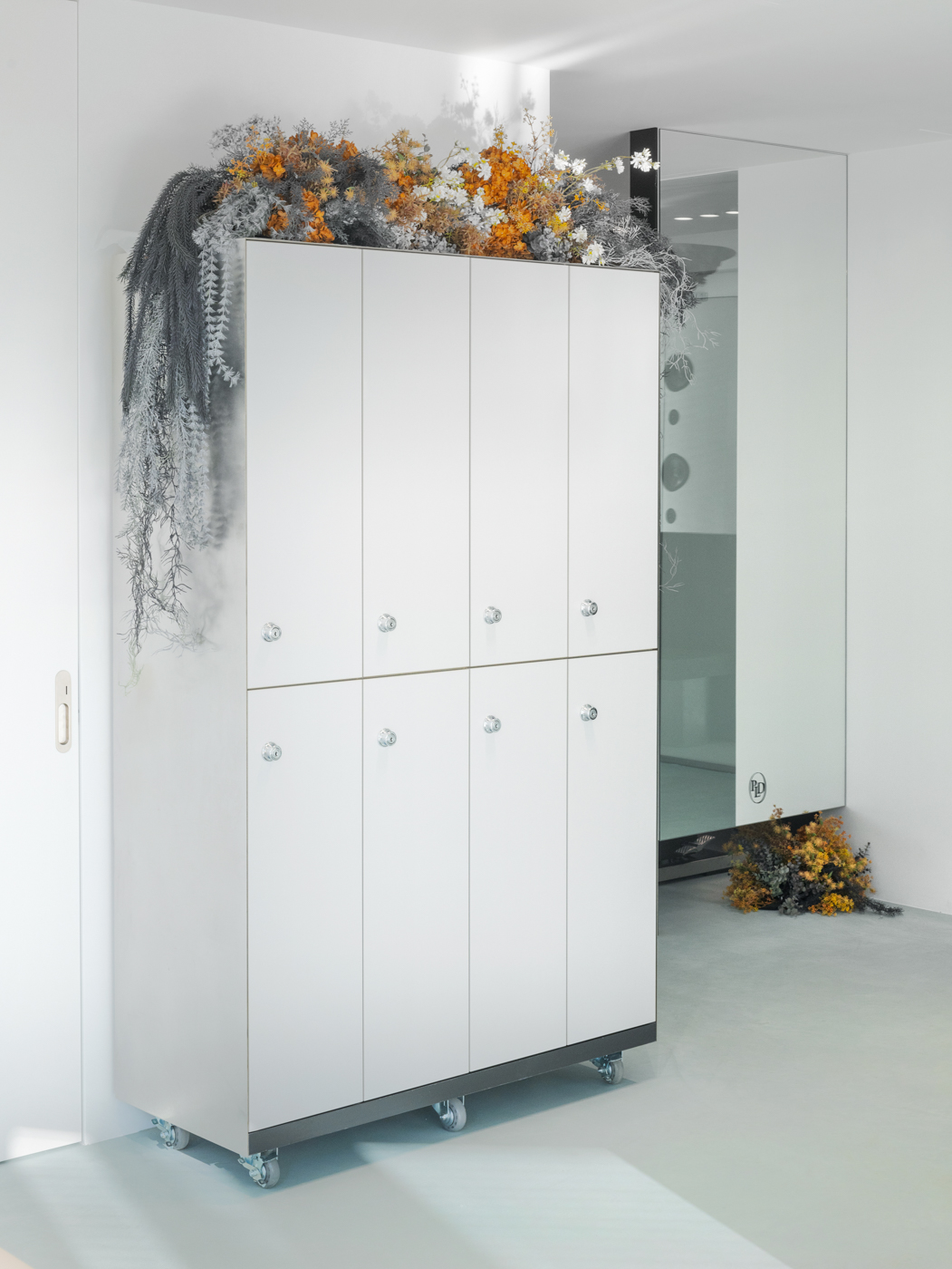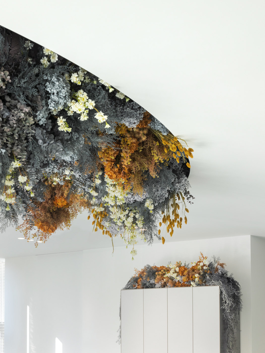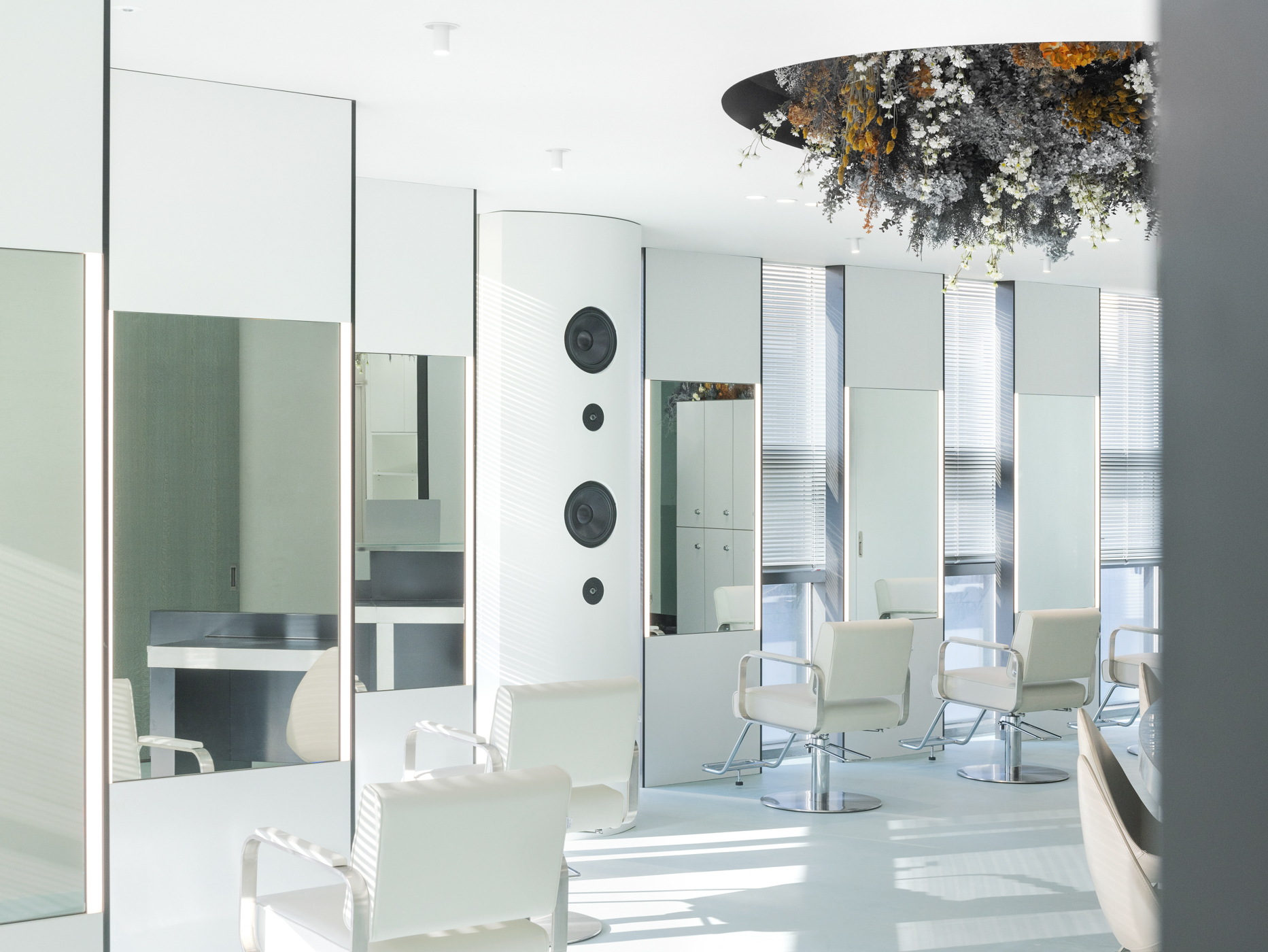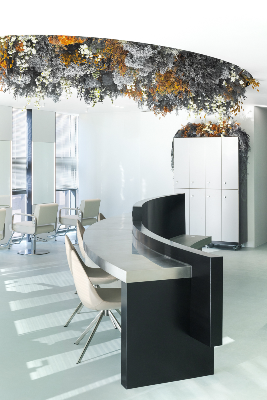 1인용 경대 7대를 창가라인에 맞춰서 배치하기 보다는 채광을 가장 많이 들어올 수 있는 방향으로 경대를 배치했다. 그로 인해 사선라인의 창가에서 들어오는 채광을 홀 중앙까지 끌어들이고, 거울에 반사되는 시선을 한방향으로 정리했다. 공간의 사선이 차지하는 면적이 적지 않기 때문에 사선이 주는 강렬함을 공간 컨셉과 어울리도록 하기위해서 부드러운 곡선이 필요했다. 공간 컨셉의 메인이 될 수 있는 홀 중앙 천장에 가로세로 4.5미터, 2.5미터의 커다란 타원형의 단천장을 만들었고, 곡선 안쪽을 플랜테리어 작가의 작품으로 가득 채워 컨셉을 부각시켰다.