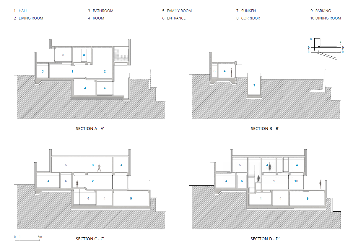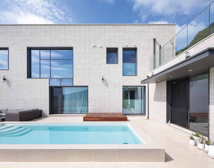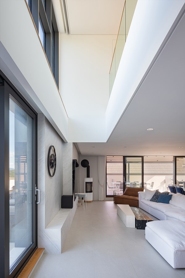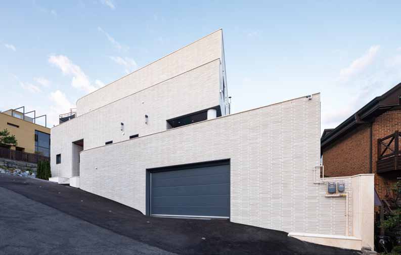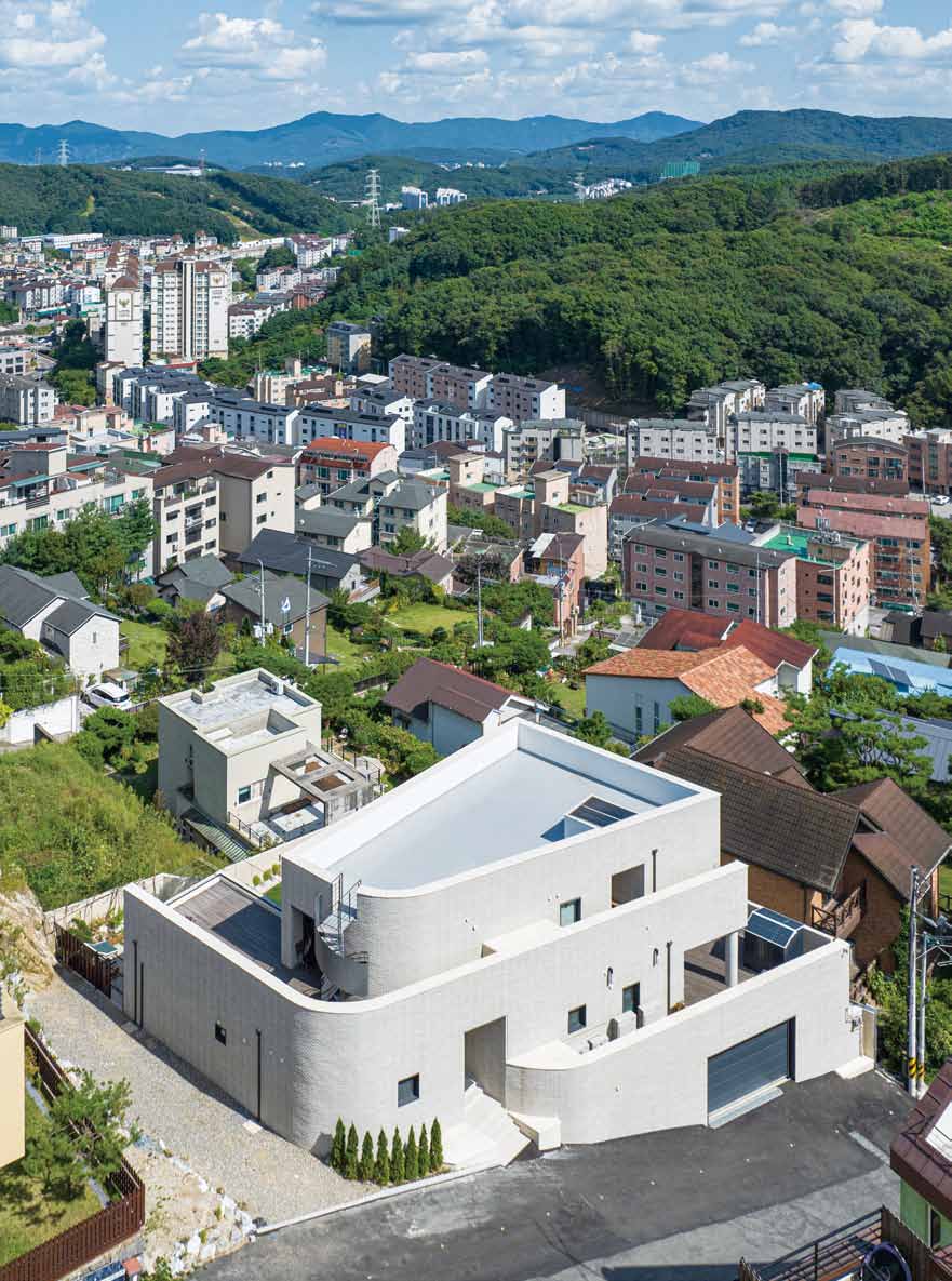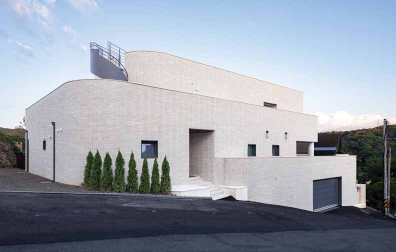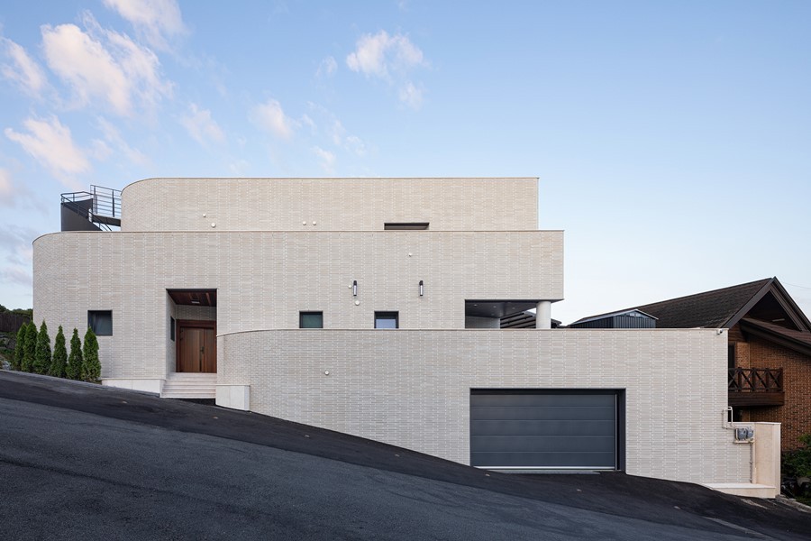 The site is located on a slope that is high in the north and low in the south, with a road to the west and open land to the east. Vehicle access is on the lower side of the road and the entrance is on the higher side, naturally taking advantage of the level difference. Three podiums were created and arranged, with each podium staggered slightly to reveal the others, and curved in the northern part to follow the shape of the site. The elevation from the street was designed to minimize windows and reveal the mass. The horizontal flow was emphasized by providing a separate entrance from the outside of the second level of the stairs leading to the rooftop. Masonry was used for the exterior materials, and the interior finish was as minimalistic as possible. The basement was planned as a hobby space for the client, along with a parking garage, and a sunken yard brings light and breeze into the interior. The first floor zones are divided by placing the kitchen and living room on the south side and the master bedroom and dressing room on the north side. On the second floor, three rooms were planned on the south side, with the family room and veranda on the north side. The stairs from the basement lead naturally to the second floor, pass through the family room, and connect to the circular external staircase. Architectural devices were arranged to ensure that all rooms are connected to the outside. A sunken basement, an exterior deck on the first floor, and a veranda on the second floor were created to increase access to the interior spaces. The windows on the south side are large, up to more than 5 meters, to allow for abundance of light and ventilation, while the north and west sides, which face the road, have minimal functional windows. The living room and kitchen were combined into one space, creating an interior space of up to 8 meters, and the slab was partially opened to visually connect to the second floor. The railings on the exterior of the house are made of blocked materials to maximize privacy, while the interior railings are made of glass to enhance the openness and views. The construction period took longer than expected due to the work of removing rocks from the initial underground work and frequent design changes in frame construction. The process of gathering input and collaborating with various people was challenging, but we are glad that the end result is the image we envisioned.