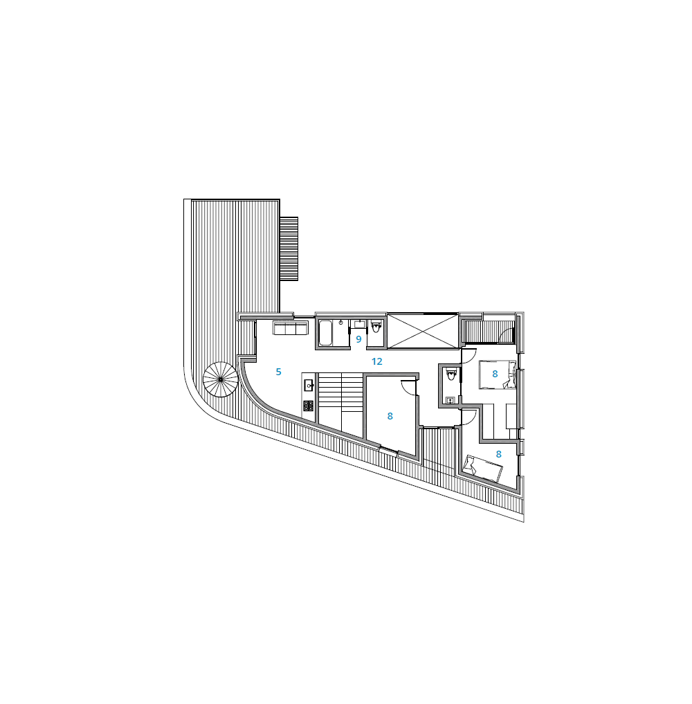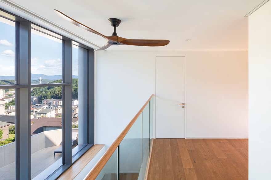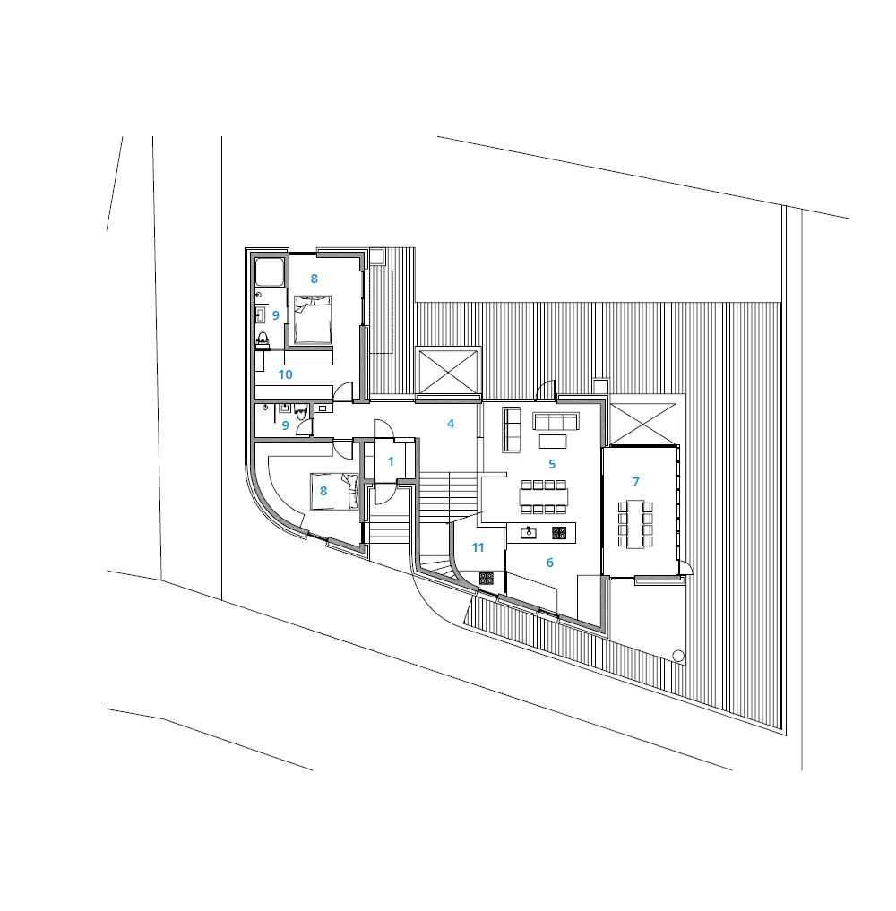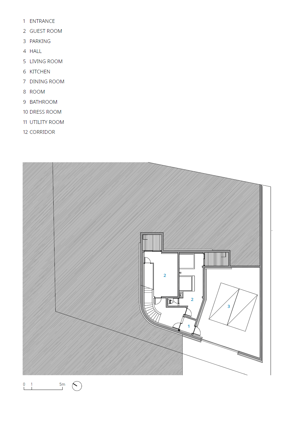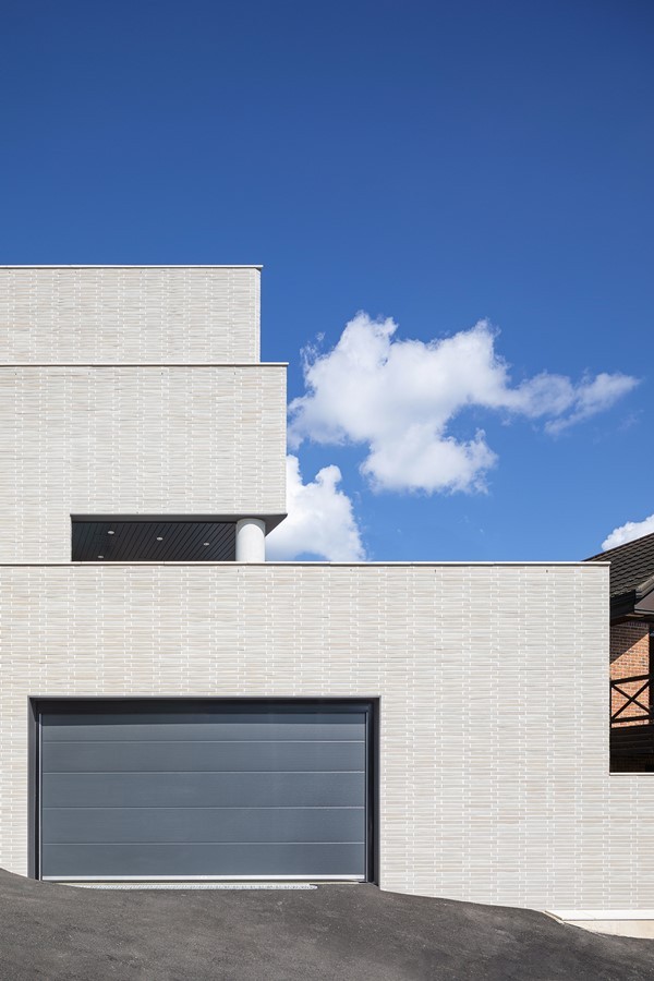 The site is located on a slope that is high in the north and low in the south, with a road to the west and open land to the east. Vehicle access is on the lower side of the road and the entrance is on the higher side, naturally taking advantage of the level difference. Three podiums were created and arranged, with each podium staggered slightly to reveal the others, and curved in the northern part to follow the shape of the site. The elevation from the street was designed to minimize windows and reveal the mass. The horizontal flow was emphasized by providing a separate entrance from the outside of the second level of the stairs leading to the rooftop. Masonry was used for the exterior materials, and the interior finish was as minimalistic as possible. The basement was planned as a hobby space for the client, along with a parking garage, and a sunken yard brings light and breeze into the interior. The first floor zones are divided by placing the kitchen and living room on the south side and the master bedroom and dressing room on the north side. On the second floor, three rooms were planned on the south side, with the family room and veranda on the north side. The stairs from the basement lead naturally to the second floor, pass through the family room, and connect to the circular external staircase. Architectural devices were arranged to ensure that all rooms are connected to the outside. A sunken basement, an exterior deck on the first floor, and a veranda on the second floor were created to increase access to the interior spaces. The windows on the south side are large, up to more than 5 meters, to allow for abundance of light and ventilation, while the north and west sides, which face the road, have minimal functional windows. The living room and kitchen were combined into one space, creating an interior space of up to 8 meters, and the slab was partially opened to visually connect to the second floor. The railings on the exterior of the house are made of blocked materials to maximize privacy, while the interior railings are made of glass to enhance the openness and views. The construction period took longer than expected due to the work of removing rocks from the initial underground work and frequent design changes in frame construction. The process of gathering input and collaborating with various people was challenging, but we are glad that the end result is the image we envisioned.