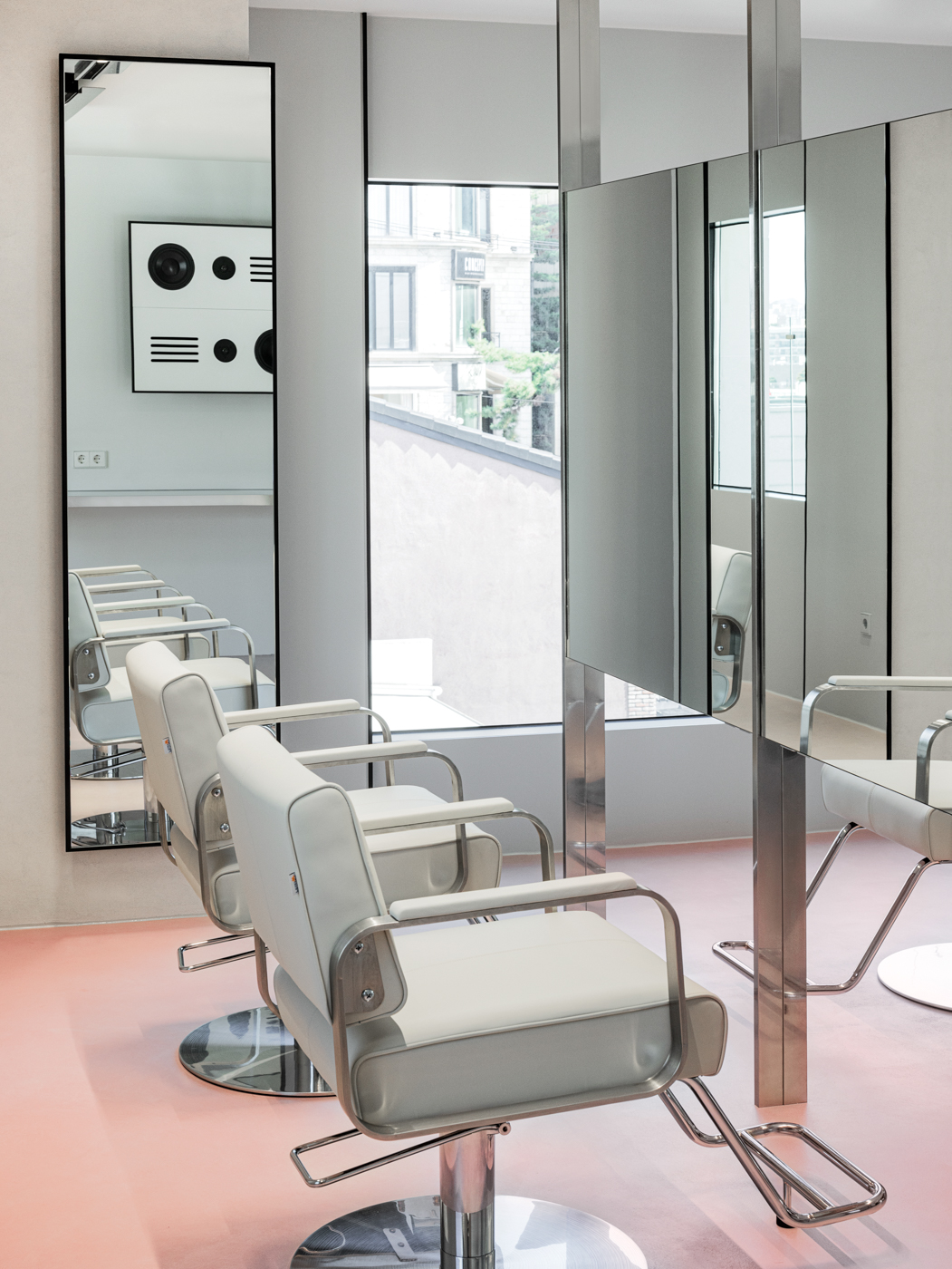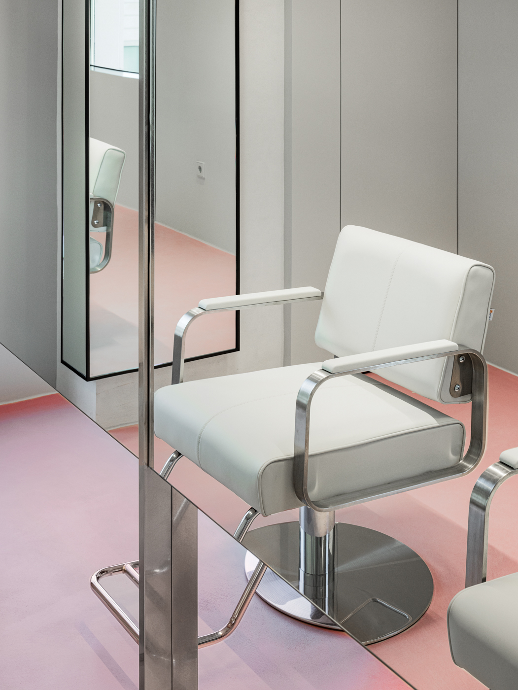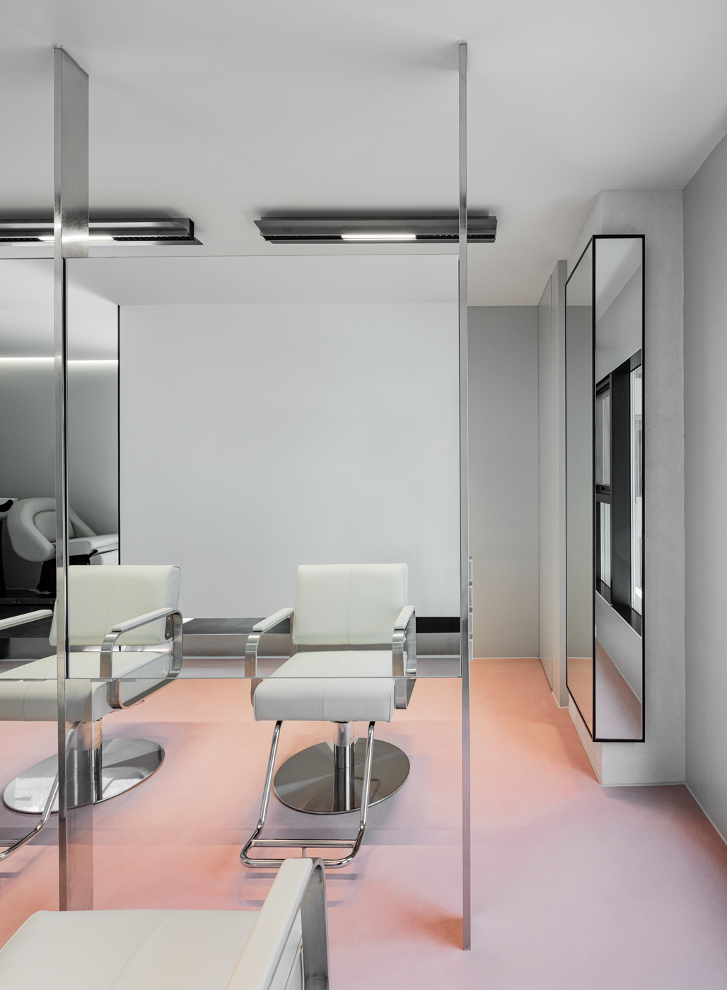 머리를 시술을 받는 메인 홀은 5평밖에 되지 않아 경대와 시술테이블이 최대한 시야를 막지 않도록 디자인 하는게 중요하다고 생각했다. 경대는 상부와 하부 일부를 오픈하여 바닥과 천장이 막히지 않게 디자인하였고, 경대 거울 상하부에도 프레임 없이 거울 끝선에서 마감이 돼서 반사되는 모습이 프레임이 갇히지 않도록 디자인하였다. 대열씨의 공간 레이아웃은 출입구에서부터 복도를 지나 홀까지 오는데 직선적인 강제 동선이 있다. 그 공간감을 활용해서 직선적인 마그네틱 조명을 배치하는 게 좋다고 생각했다. 마그네틱 조명의 장점은 기호의 맞게 조명의 개수 와 위치를 자유롭게 조절이 가능하고, 조명의 광원이 잘 안보여서 눈부심의 문제도 해결할 수 가 있다.