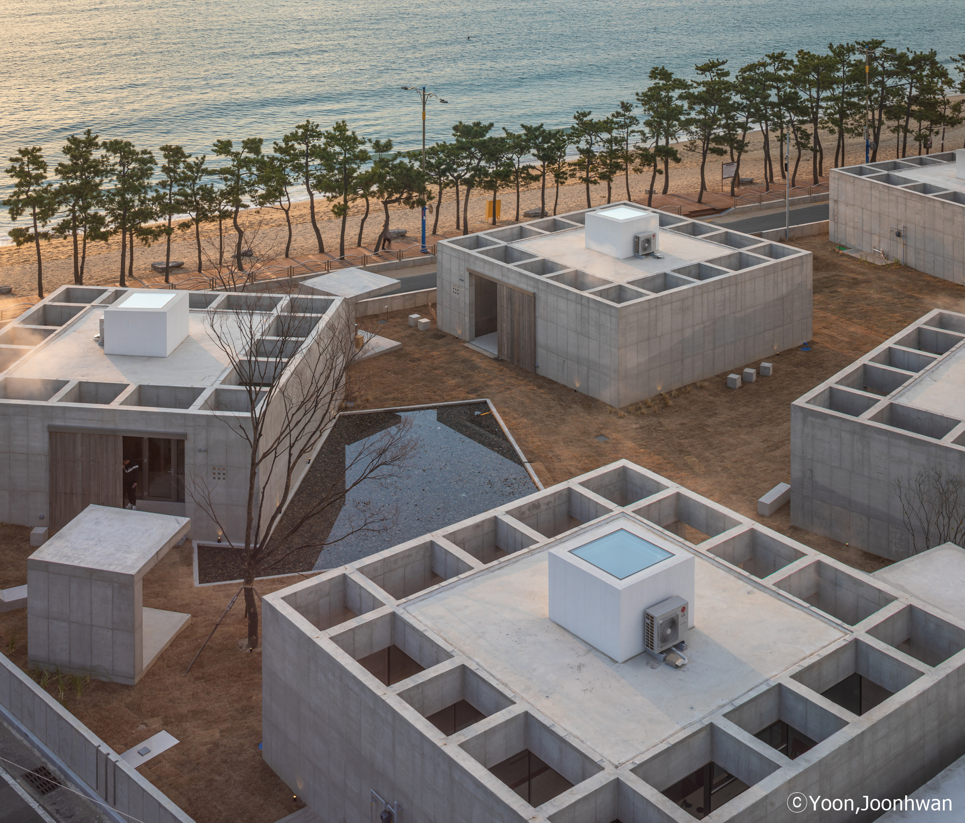 Facing Jinha Beach from a large site, one can see a significant island with a pine forest. Mimmim is another sea connected to Jinha Beach, and it contains seven independent islands connected to the natural island visible across the water. These islands are scattered throughout the entire site, and through the spaces between them, visitors can share both a sea view from inside and a courtyard view from outside. The moment one enters the constructed islands, the perception of time freezes. Through the still space open only to the sky, allowing light and reflected light through water, can one sense the passage of natural time. Each person may experience a different pace of time while staying here.