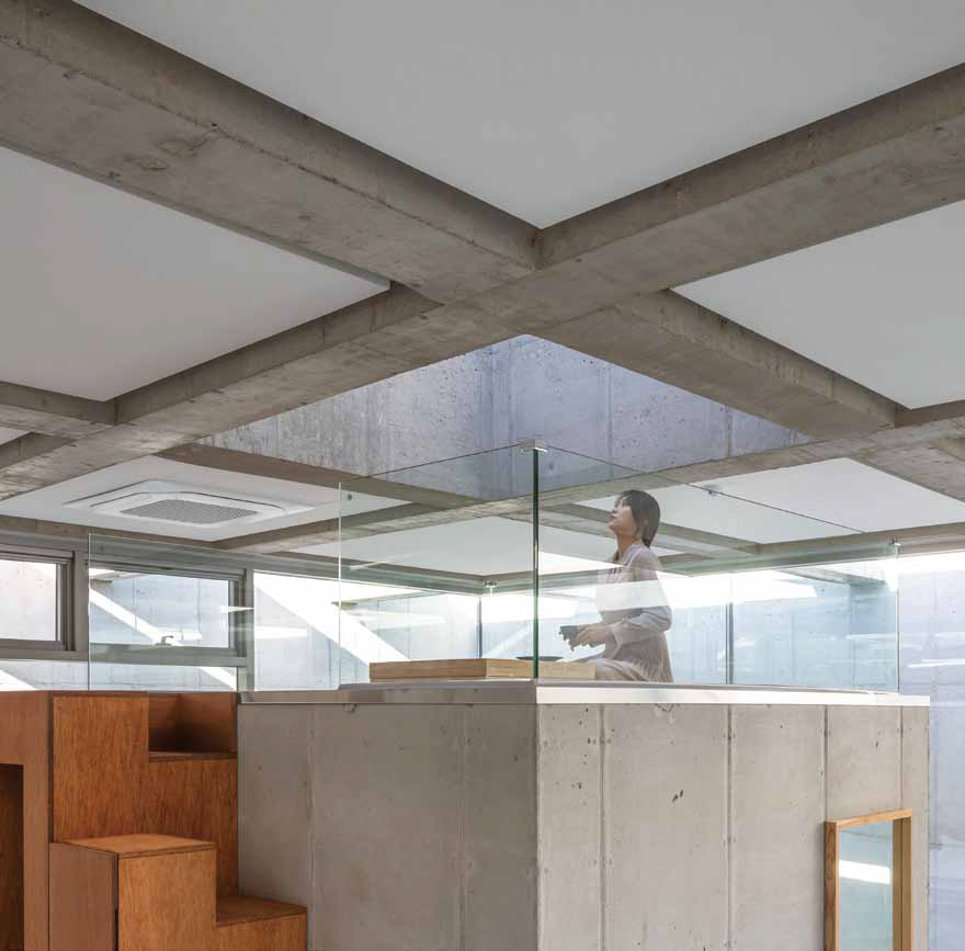 To emphasize the stacked spaces, the supporting structures of columns and walls within the interior space were removed, creating independent areas. The four walls extending outward to build the interior space serve as vertical structures capable of withstanding all forces. The construction principle employs a grid-shaped waffle arrangement for the open slabs and to create space between the grid and skylights. The structure formed above the swimming pool produces various shadows on the four walls, the pool, and the indoor space over time. Although the spaces within spaces are separated from the structure, changing light over time reconnects the separated spaces into a unified whole.