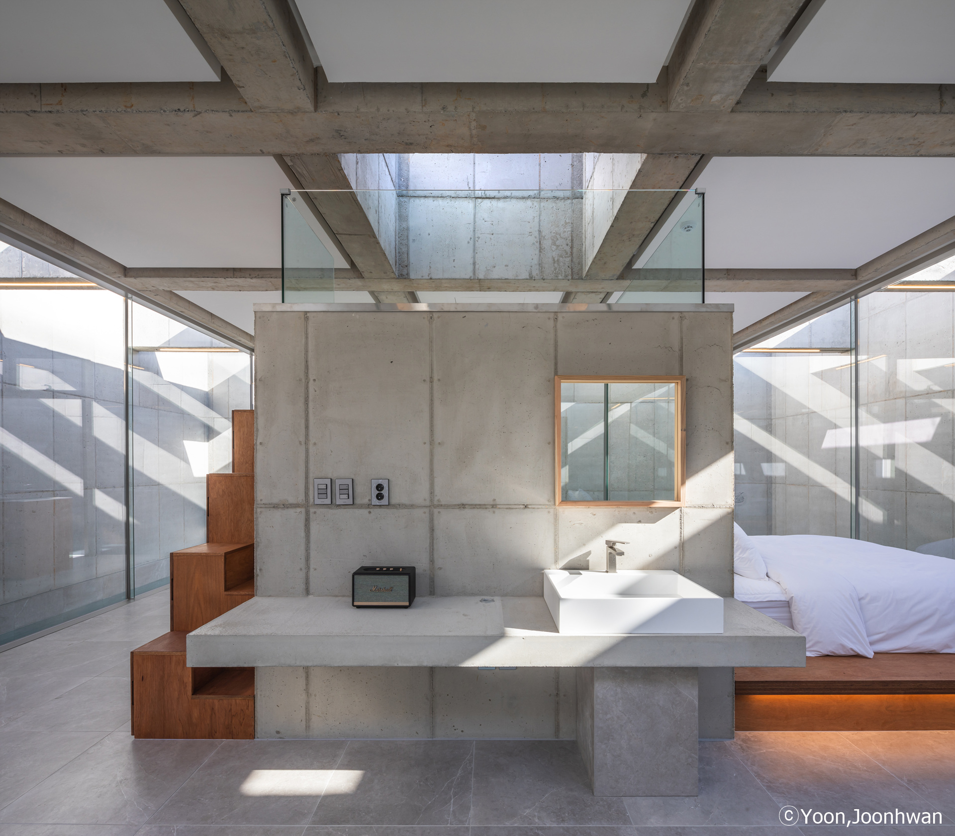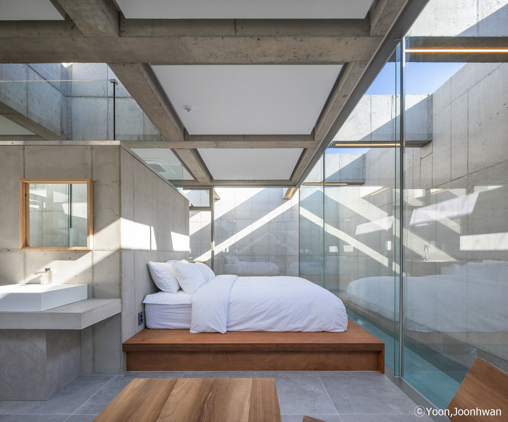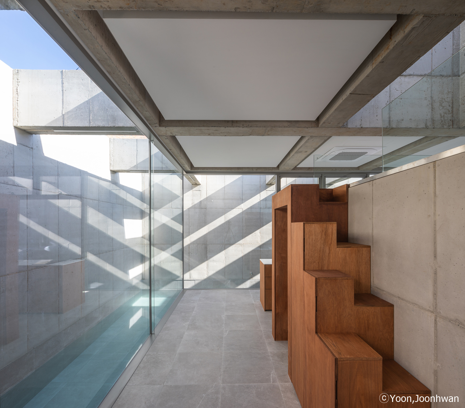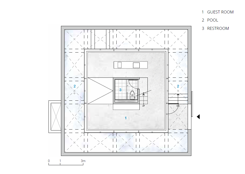 To emphasize the stacked spaces, the supporting structures of columns and walls within the interior space were removed, creating independent areas. The four walls extending outward to build the interior space serve as vertical structures capable of withstanding all forces. The construction principle employs a grid-shaped waffle arrangement for the open slabs and to create space between the grid and skylights. The structure formed above the swimming pool produces various shadows on the four walls, the pool, and the indoor space over time. Although the spaces within spaces are separated from the structure, changing light over time reconnects the separated spaces into a unified whole.