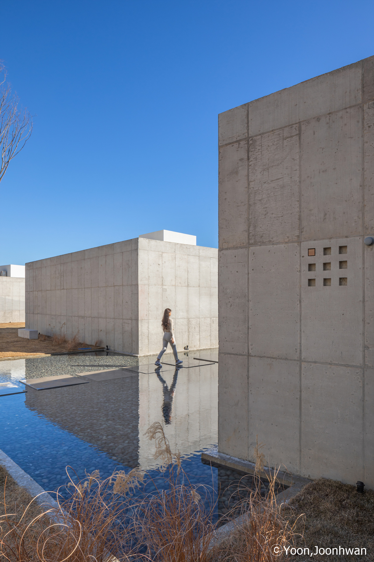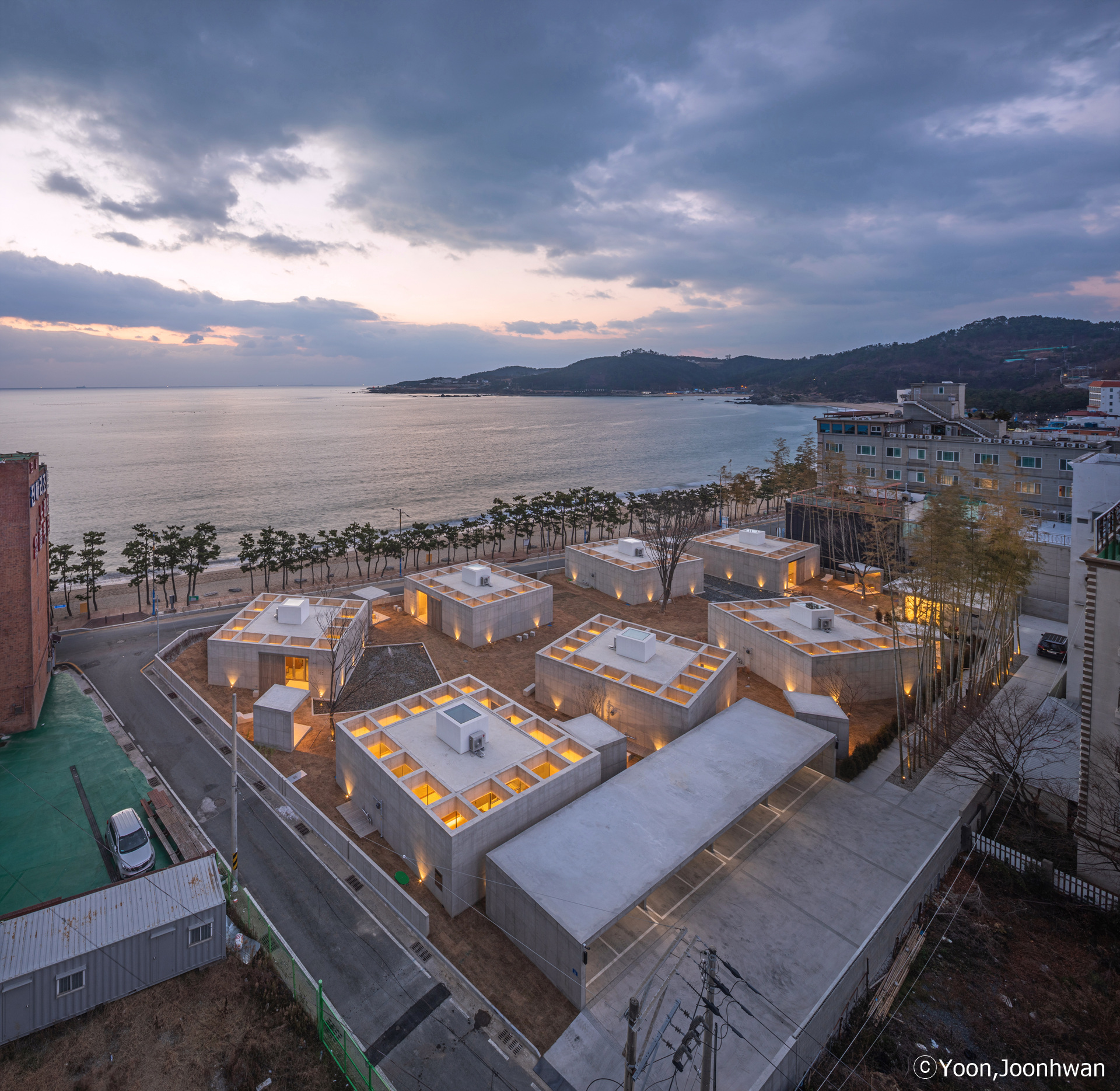 Facing Jinha Beach from a large site, one can see a significant island with a pine forest. Mimmim is another sea connected to Jinha Beach, and it contains seven independent islands connected to the natural island visible across the water. These islands are scattered throughout the entire site, and through the spaces between them, visitors can share both a sea view from inside and a courtyard view from outside. The moment one enters the constructed islands, the perception of time freezes. Through the still space open only to the sky, allowing light and reflected light through water, can one sense the passage of natural time. Each person may experience a different pace of time while staying here.