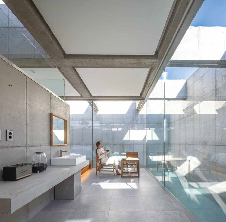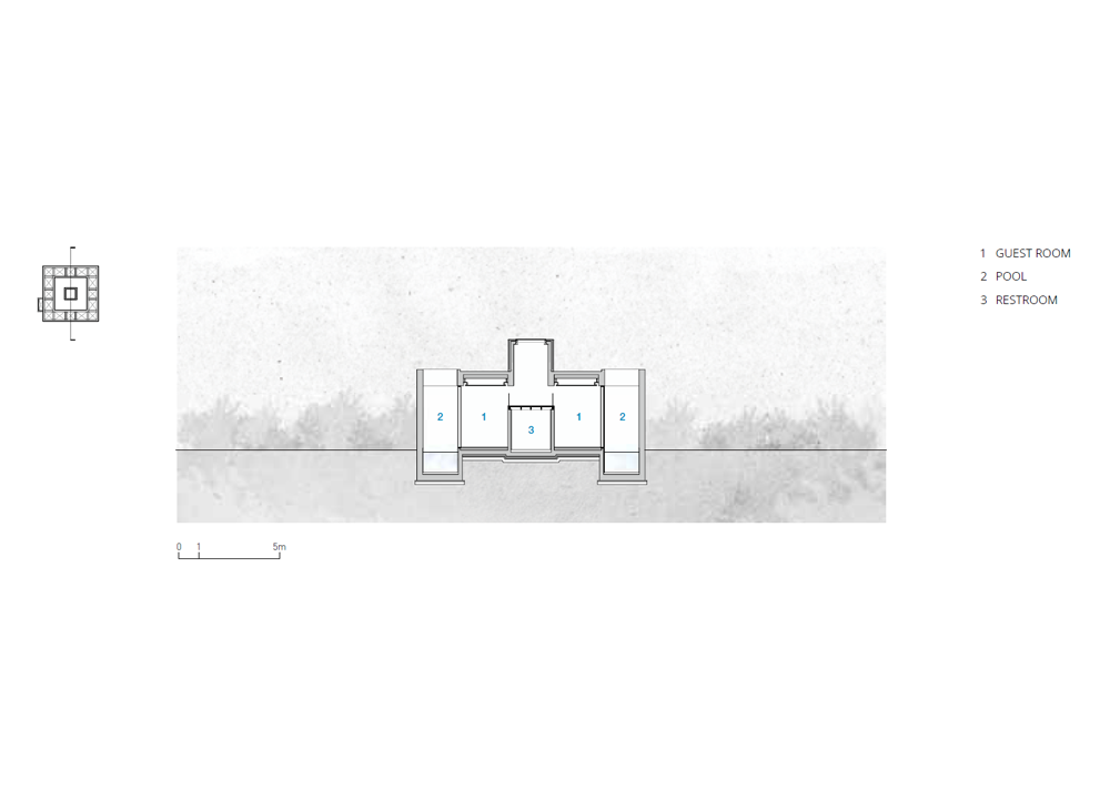 The method used to construct the seven islands is a simple rectangular shape with four complete walls. Within these four walls are swimming pools surrounding the space, forming another indoor space like a separate island. Inside this indoor space are square-shaped toilets, showers, and utility facilities. Above the utility area is an open rectangular structure connecting to the sky, allowing light to filter through. Stacked layers of spaces reveal the depth of time and self-discovery through changes in light.