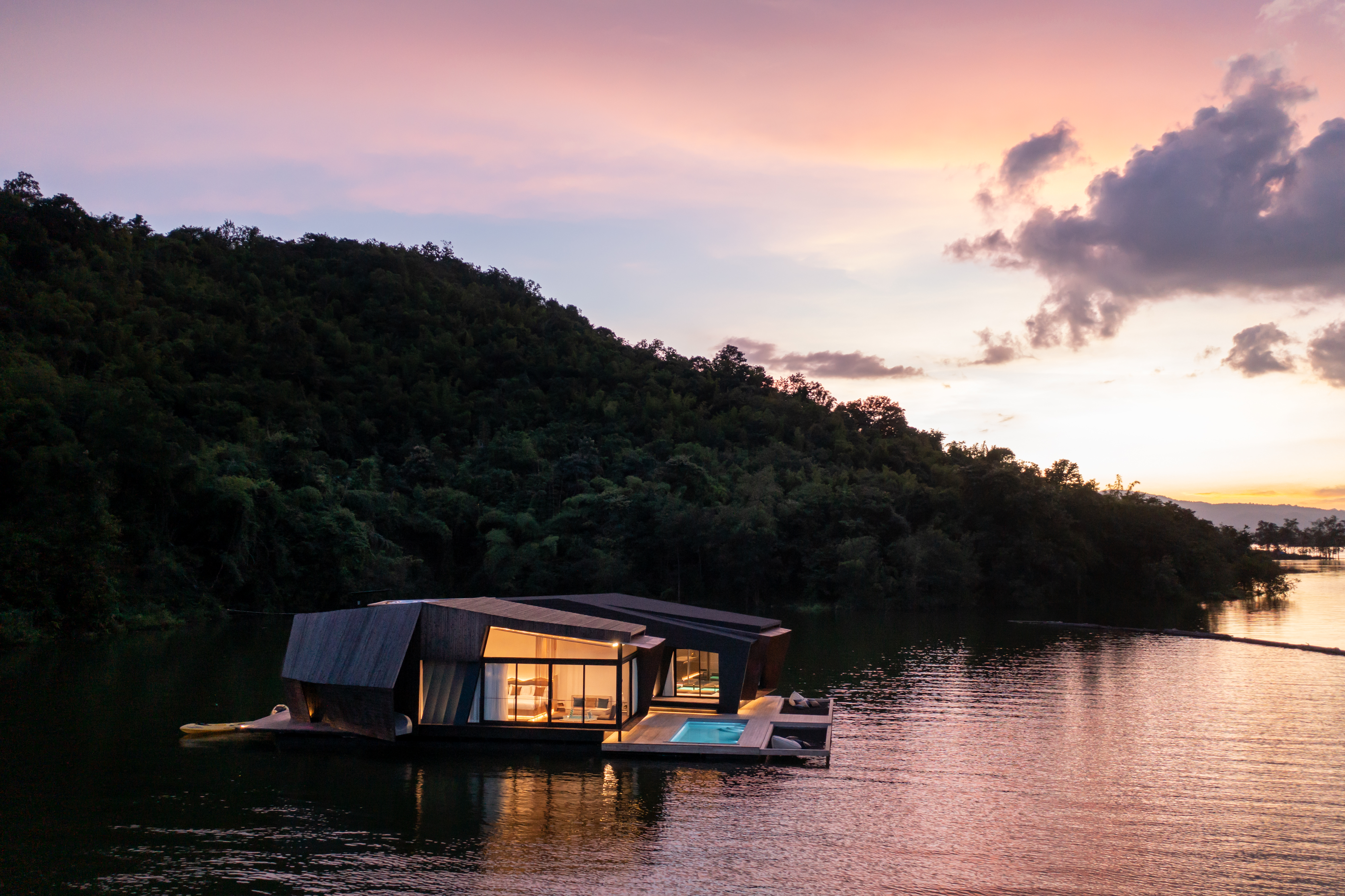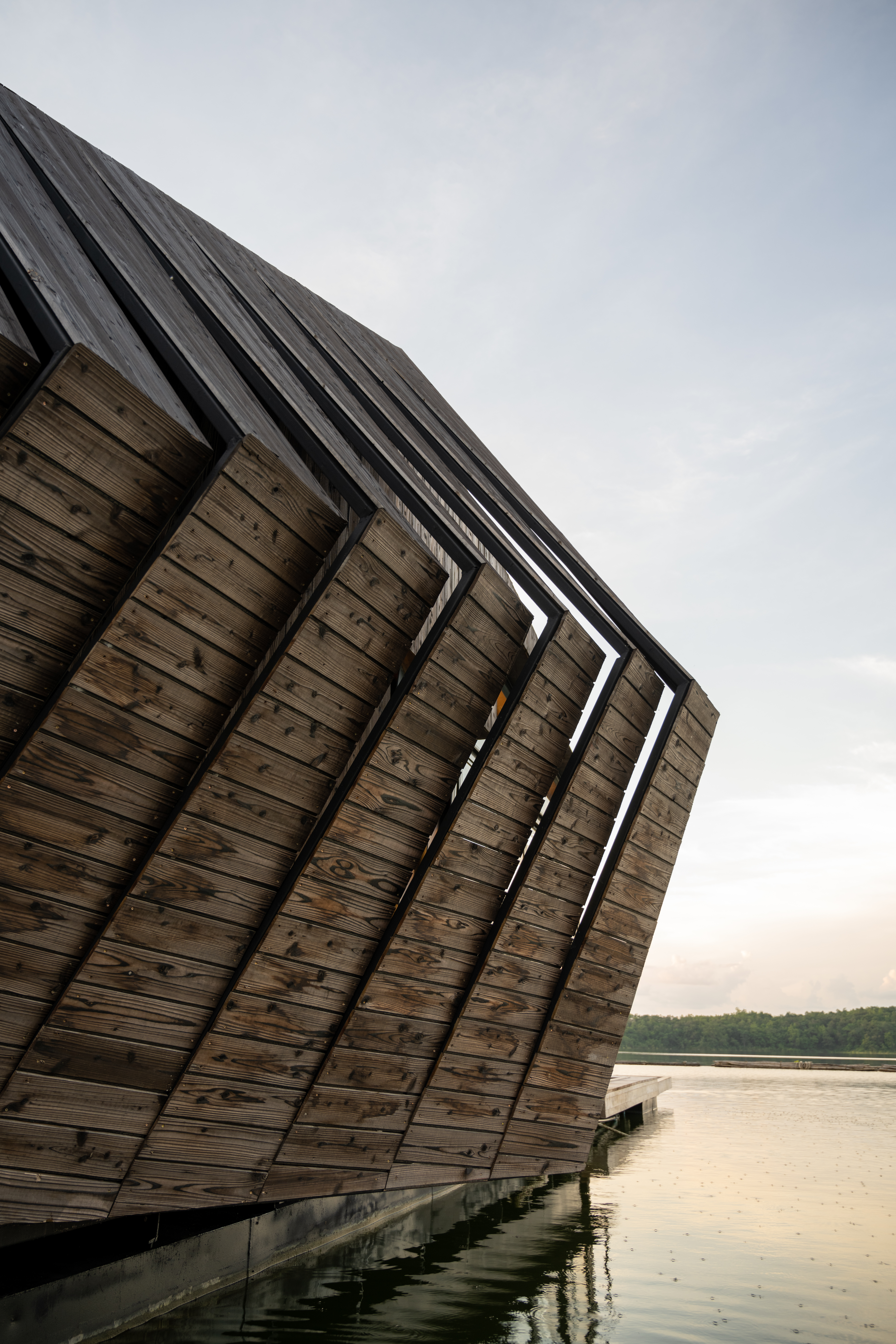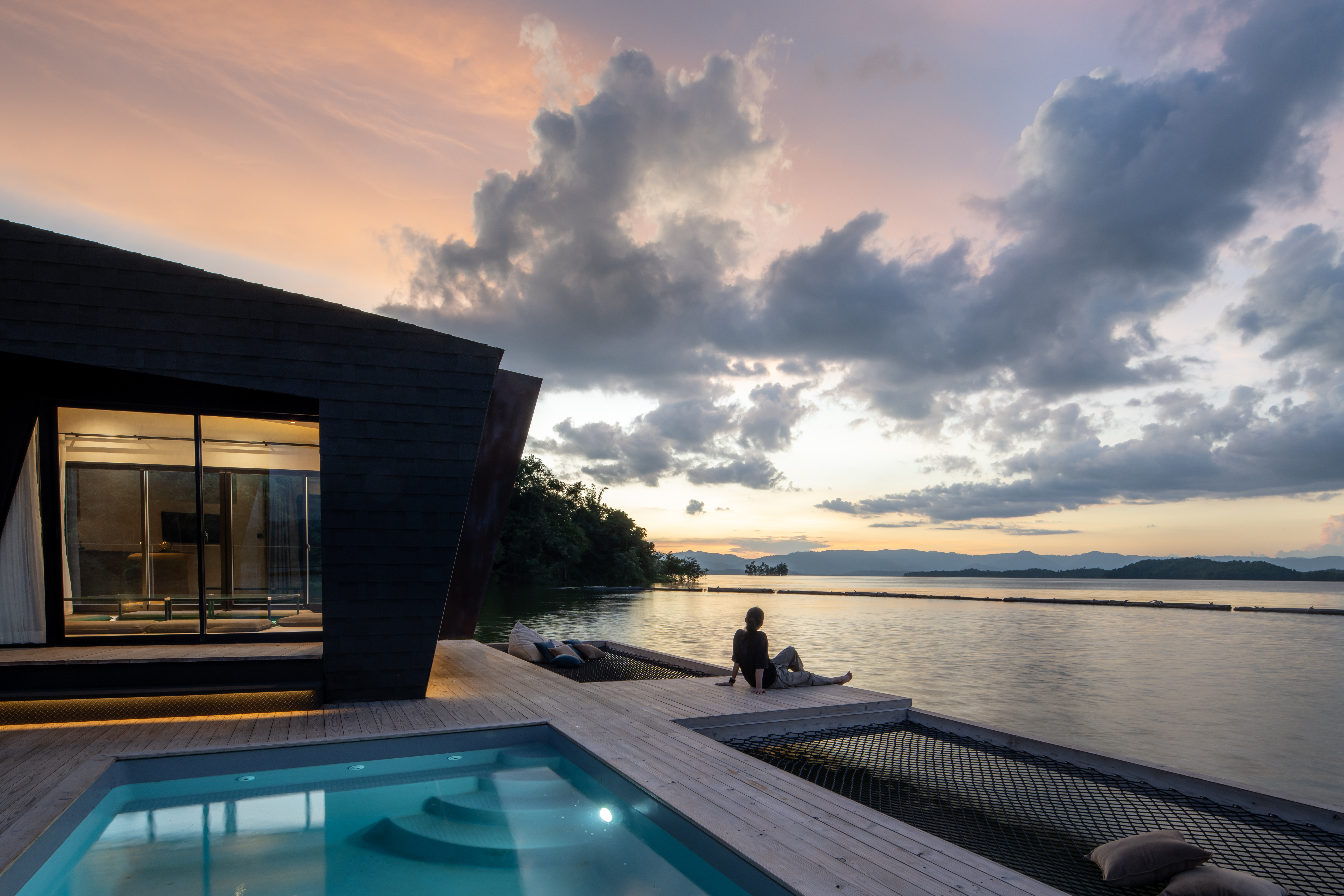The PLA 2 Floating Resort is situated on rafts near a dam, taking advantage of the unique site characteristic of various types of fish. The architect incorporated the concept of a “giant snake head” to design the resort. Creating a form suitable for activities and transforming it to fit the space, the architect generated areas with mutual connections between the interior and exterior. Upon entering the building, one is reminded of fish dynamically moving underwater. There are two ways to access the entrance hall, with the external deck entrance having a dramatic presence in the space with lines and light. During the day, it appears different than at night when the rooms become separated. The resort is constructed using wood and lightweight steel, and the building's color evokes images of fish. Additionally, recognizing the aquatic nature of the space, the architect installed a lightweight material and a closed SAT tank system to reduce the weight of the building. When near the coast, electricity can be obtained, and when venturing out to the sea, generators can be used for power. Inside, various lights for activities and spaces for sharing stories within the rafts are provided. There are also spaces throughout where one can enjoy the romantic atmosphere of the interior.