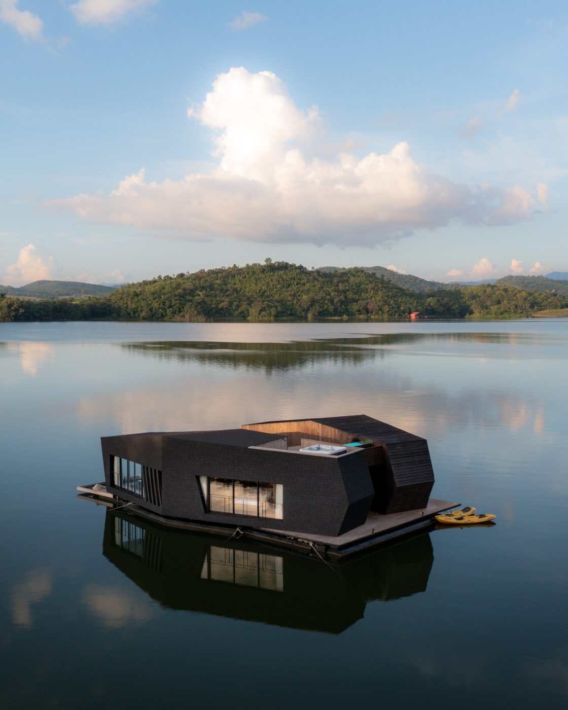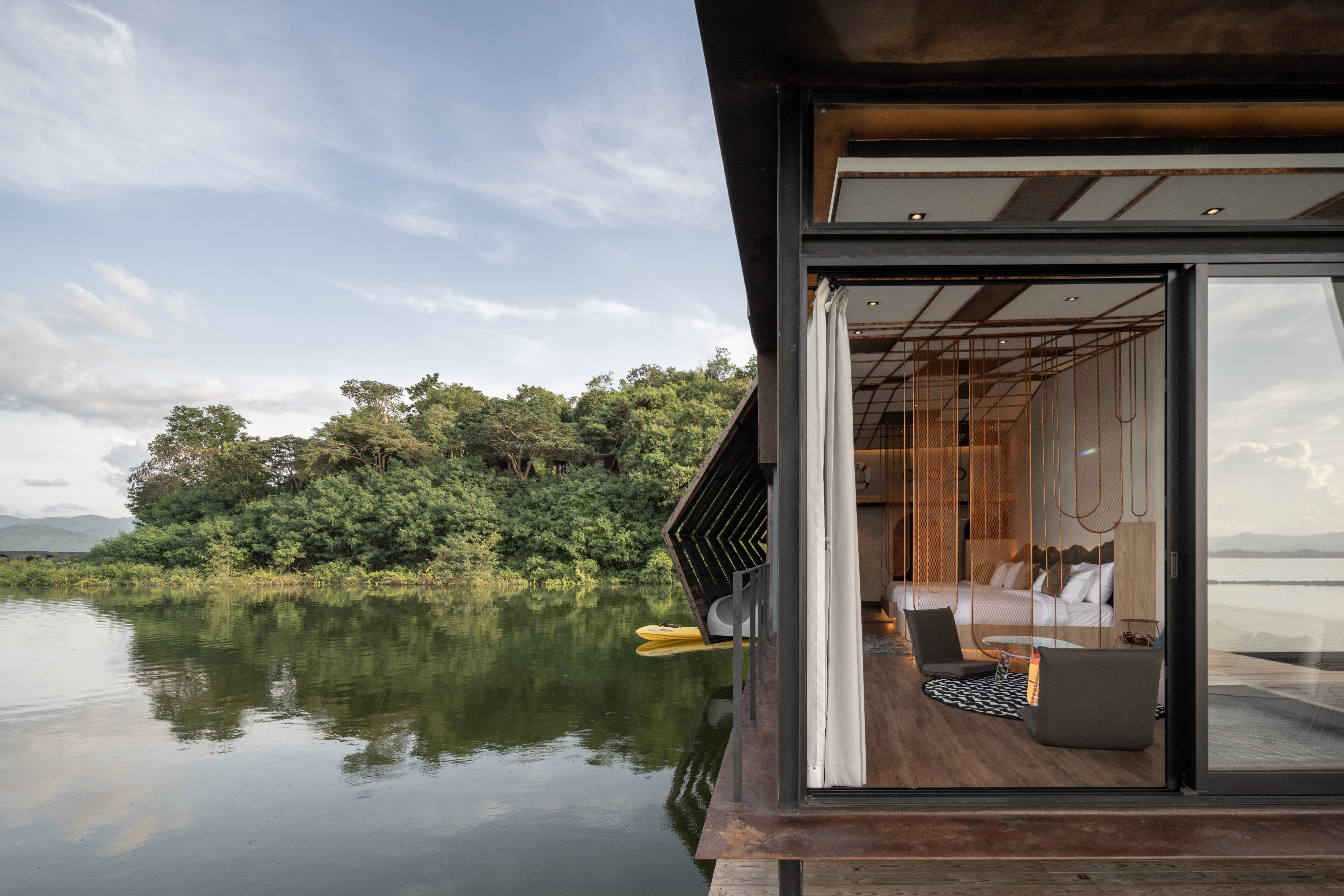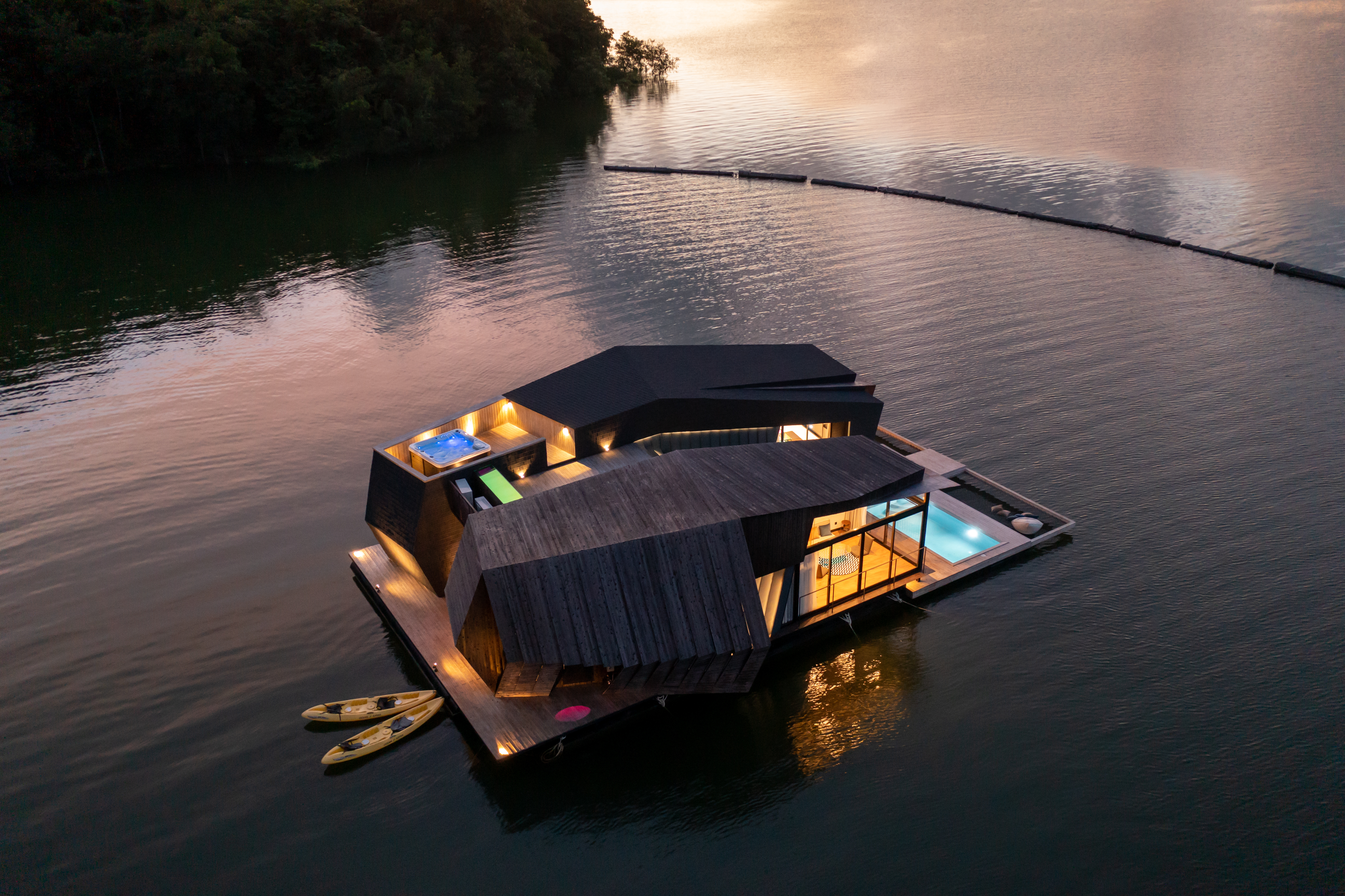 The PLA 2 Floating Resort is situated on rafts near a dam, taking advantage of the unique site characteristic of various types of fish. The architect incorporated the concept of a “giant snake head” to design the resort. Creating a form suitable for activities and transforming it to fit the space, the architect generated areas with mutual connections between the interior and exterior. Upon entering the building, one is reminded of fish dynamically moving underwater. There are two ways to access the entrance hall, with the external deck entrance having a dramatic presence in the space with lines and light. During the day, it appears different than at night when the rooms become separated. The resort is constructed using wood and lightweight steel, and the building's color evokes images of fish. Additionally, recognizing the aquatic nature of the space, the architect installed a lightweight material and a closed SAT tank system to reduce the weight of the building. When near the coast, electricity can be obtained, and when venturing out to the sea, generators can be used for power. Inside, various lights for activities and spaces for sharing stories within the rafts are provided. There are also spaces throughout where one can enjoy the romantic atmosphere of the interior.