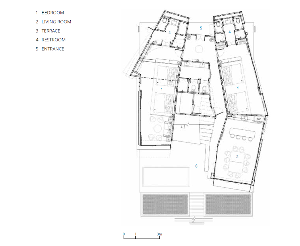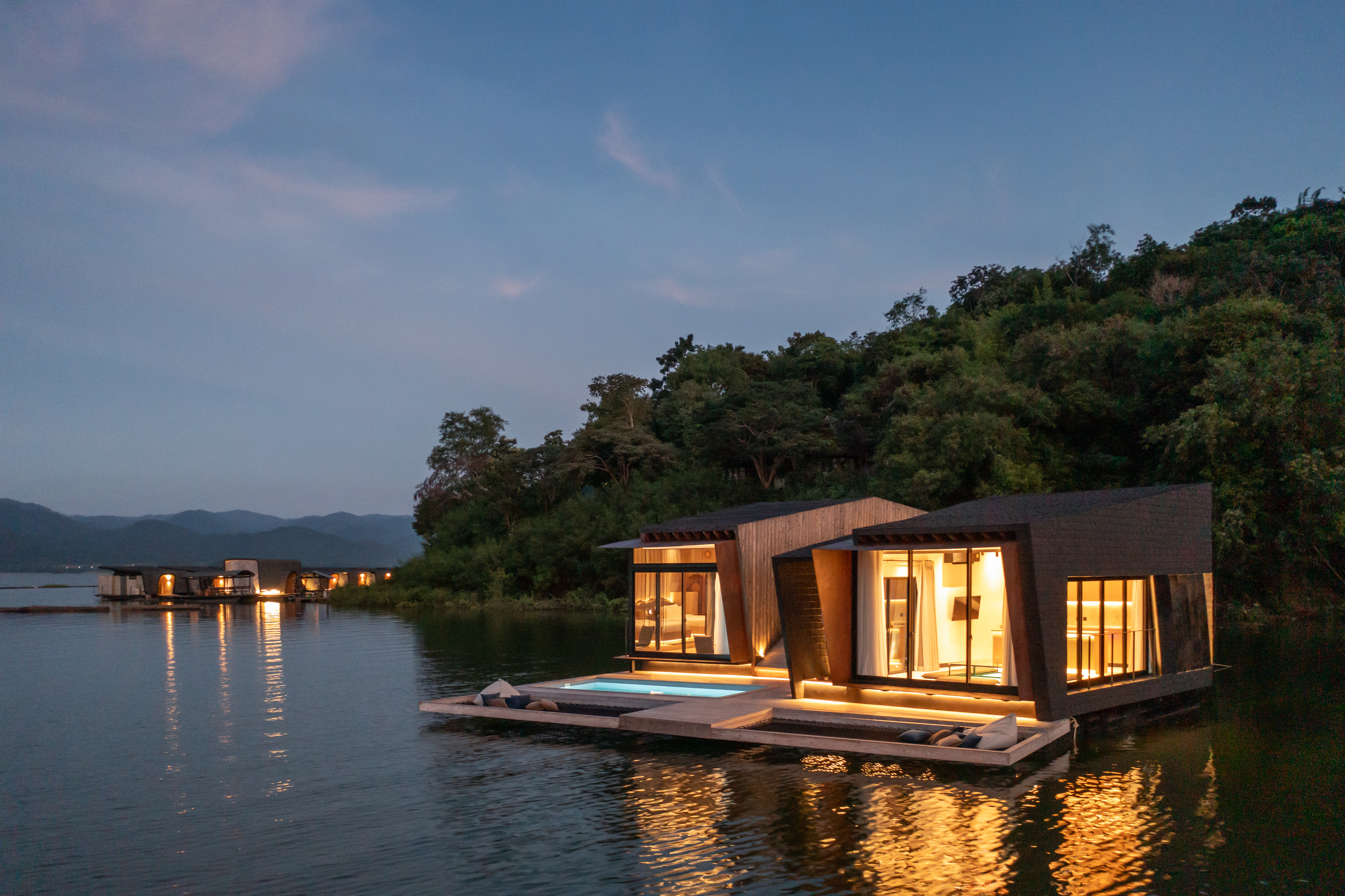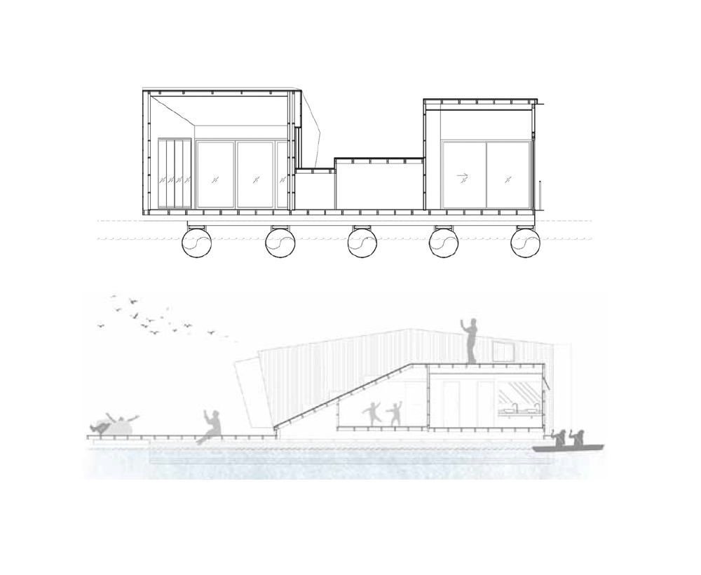 The PLA 2 Floating Resort is situated on rafts near a dam, taking advantage of the unique site characteristic of various types of fish. The architect incorporated the concept of a “giant snake head” to design the resort. Creating a form suitable for activities and transforming it to fit the space, the architect generated areas with mutual connections between the interior and exterior. Upon entering the building, one is reminded of fish dynamically moving underwater. There are two ways to access the entrance hall, with the external deck entrance having a dramatic presence in the space with lines and light. During the day, it appears different than at night when the rooms become separated. The resort is constructed using wood and lightweight steel, and the building's color evokes images of fish. Additionally, recognizing the aquatic nature of the space, the architect installed a lightweight material and a closed SAT tank system to reduce the weight of the building. When near the coast, electricity can be obtained, and when venturing out to the sea, generators can be used for power. Inside, various lights for activities and spaces for sharing stories within the rafts are provided. There are also spaces throughout where one can enjoy the romantic atmosphere of the interior.