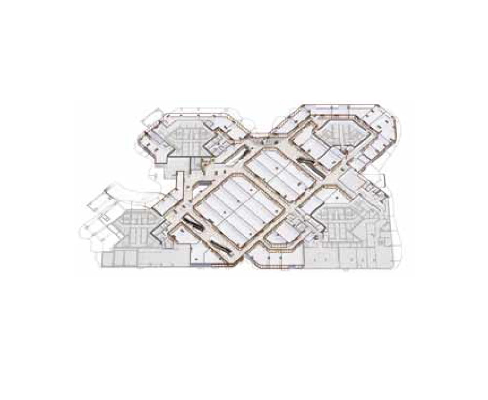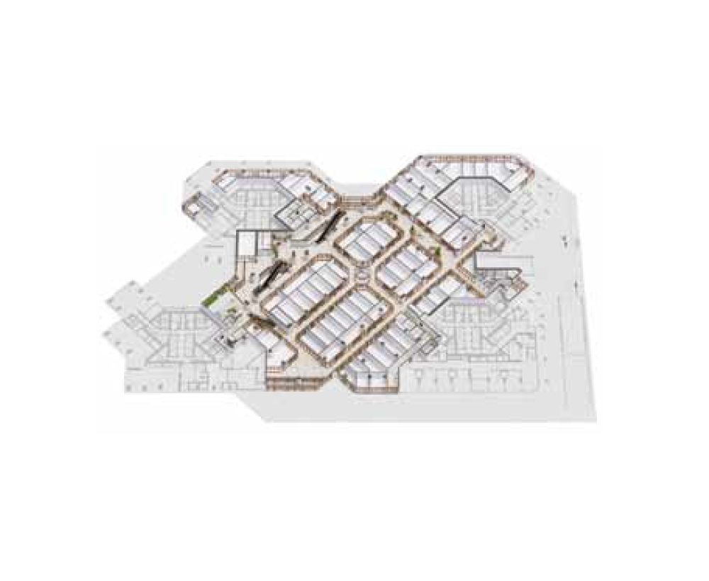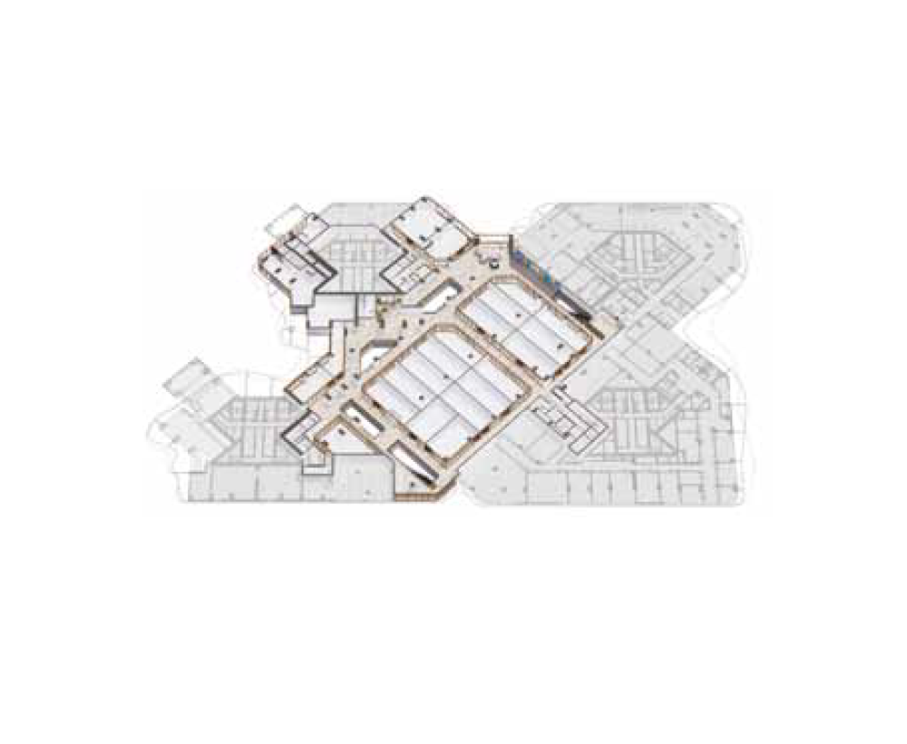 The interior with a concept of ‘Maison le blanc’ consists of an atrium with two large skylights. The walls of the atrium and the ceiling of the lounge area borrow the design of siding found on wooden houses. The interior is all white, with graphic art applied to the large structural columns that interrupt the flow of traffic, creating photo spots that serve as a directional marker. Flowerbeds and large potted plants were placed in the lounge spaces to create a natural atmosphere, and seated areas and artwork were placed around the escalators on each floor in the center of the building to help users find a place to rest. The common areas were designed to have lower lighting levels than the store interiors so that stores would stand out. The lighting installed in the long corridors with face-to-face storefronts were designed to direct traffic to the center. These interior spaces provide users with a sense of spaciousness and coziness that is difficult to experience in everyday life.