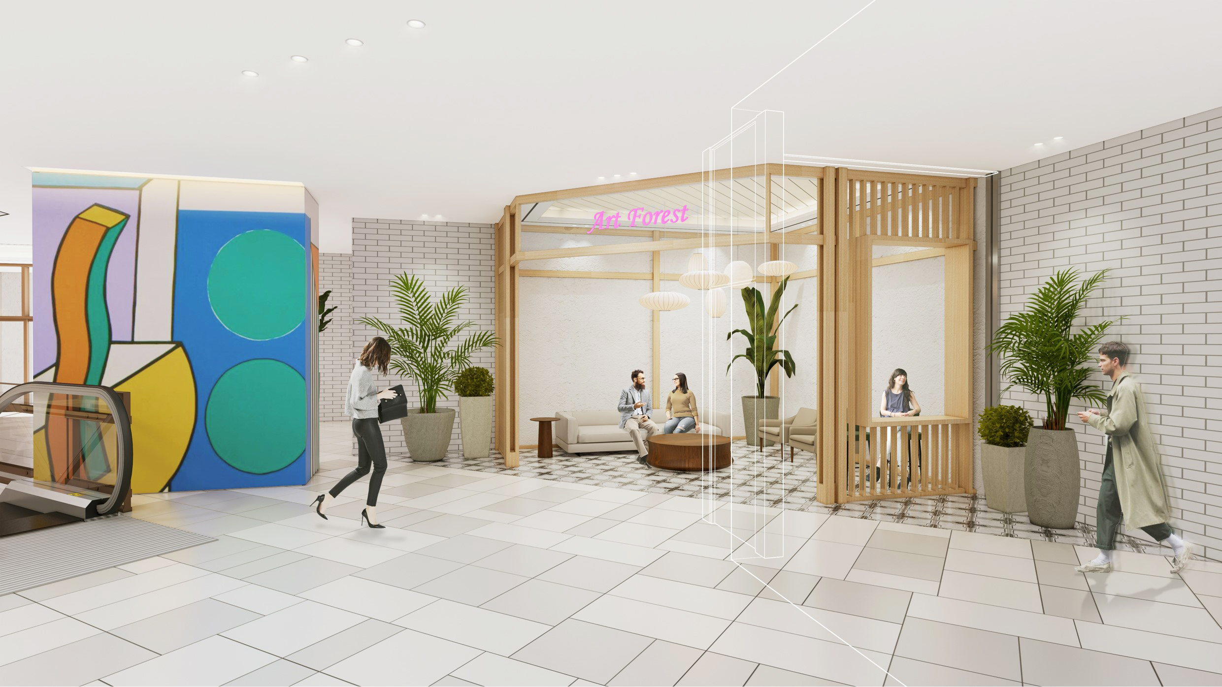 The interiors were designed with a minimal style and decoration, to allow the various storefronts to stand out. Art works and big-pot landscaping were used to maintain the interest and focus of the commercial environment. To prevent confusion of traffic, there is a centralized circulation flow and a circular traffic flow for the inner shopping mall. The plan complements the surrounding run-down environment to induce a contrast in the user’s experience, and provides a large and comfortable space that is difficult to experience in a private home, allowing for a change of mood. In addition, artworks and interior landscaping rather than fancy interior decorations enhance the quality of relaxation and reduce shopping fatigue. We hope that Art Forest will complement and coexist with the surrounding commercial environment, providing sustainable value and functionality to local residents.