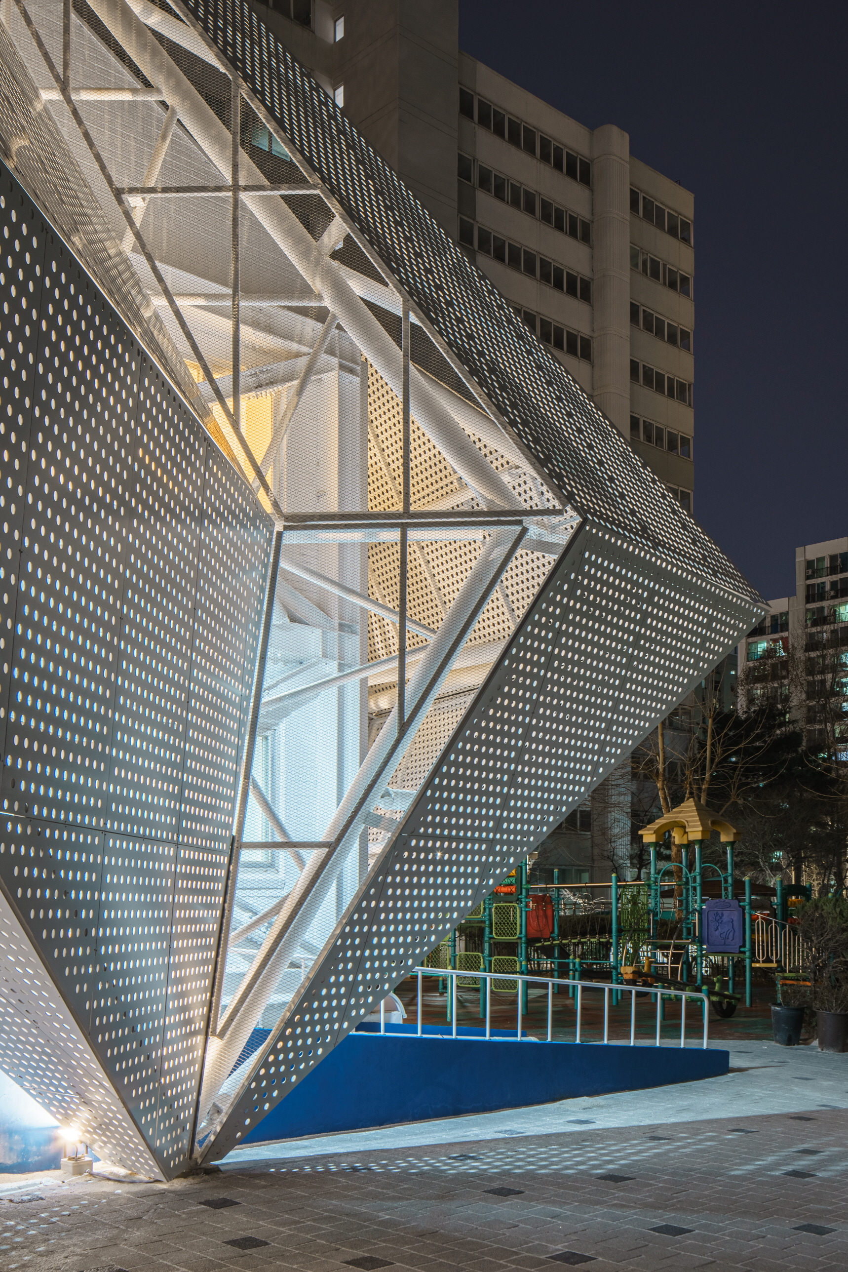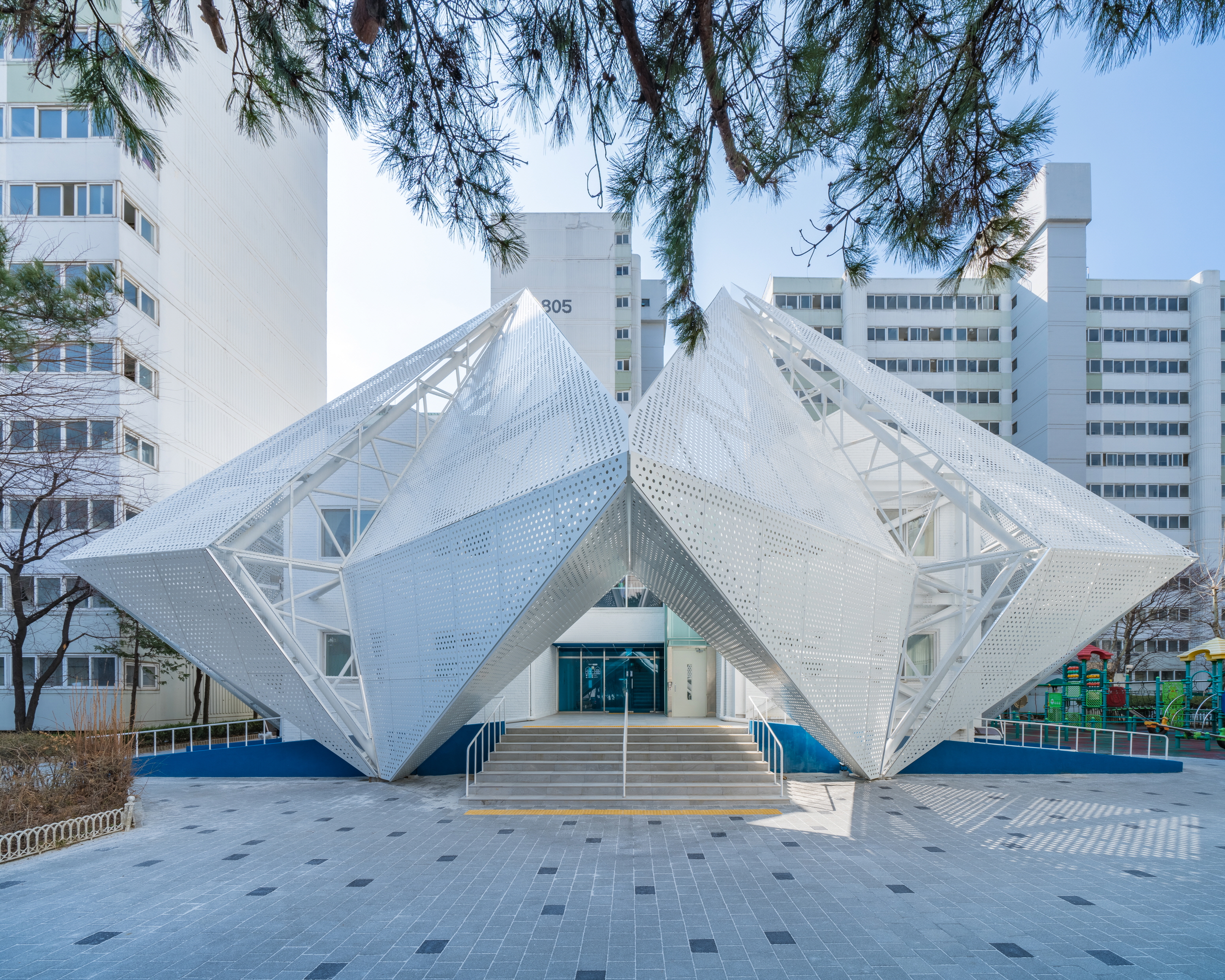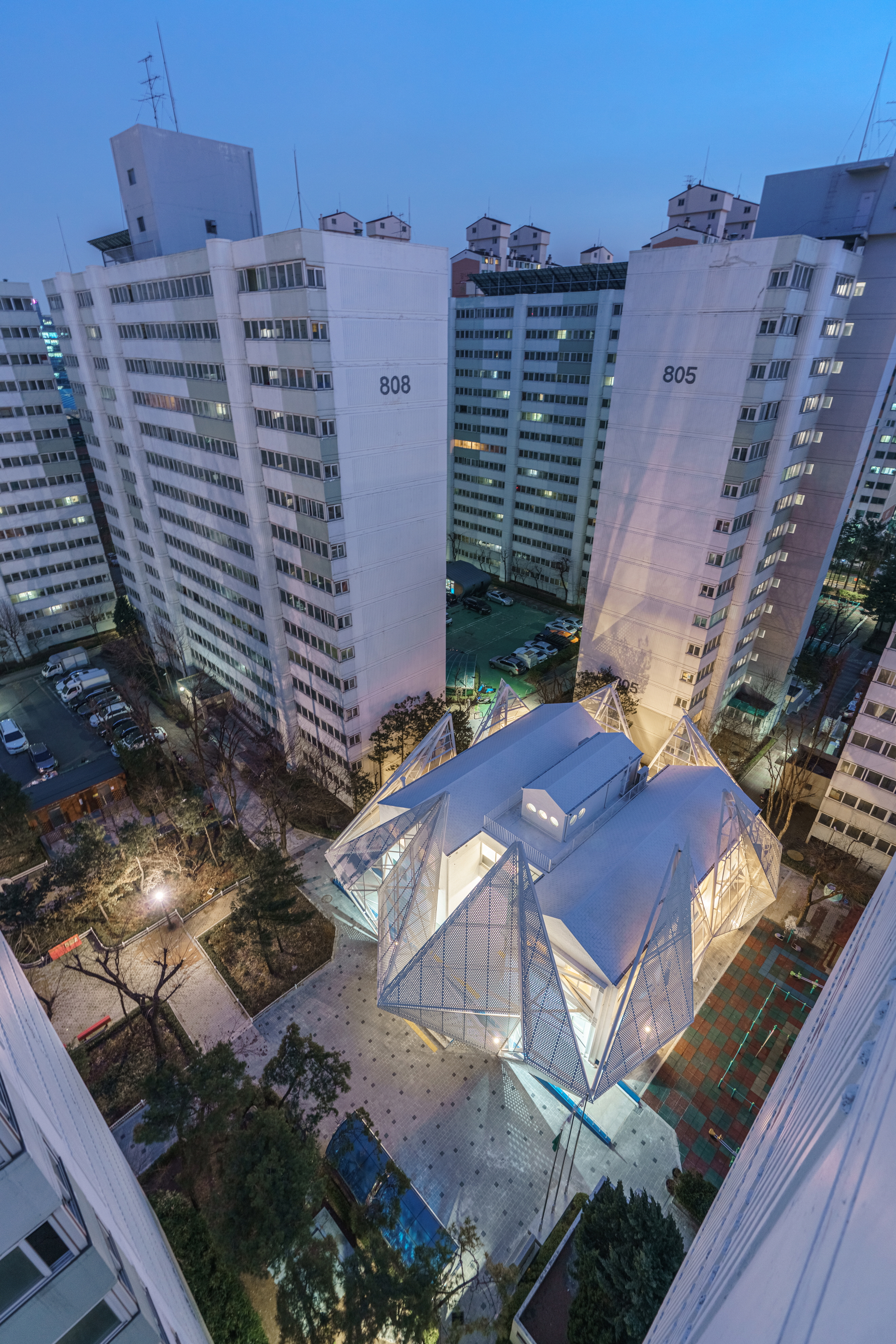 Gayang 8 Complex rental housing is an old apartment complex that is 30 years old and has 1,110 units, but only a management building exists as a community facility. SH Seoul Housing Corporation requested that the reading room space on the second floor be converted into a small library, including structural reinforcement and exterior improvements. Reading a book is like a journey of exploring knowledge. The architect wanted to make the small library into a space that feels like one is traveling. Through consultation with residents, the basic functions of the existing facilities on the first floor were maintained, and the interior space of the senior center was reorganized. In addition, the library and book café were arranged as a major program so that it could be visited and enlivened by people other than residents of the complex.