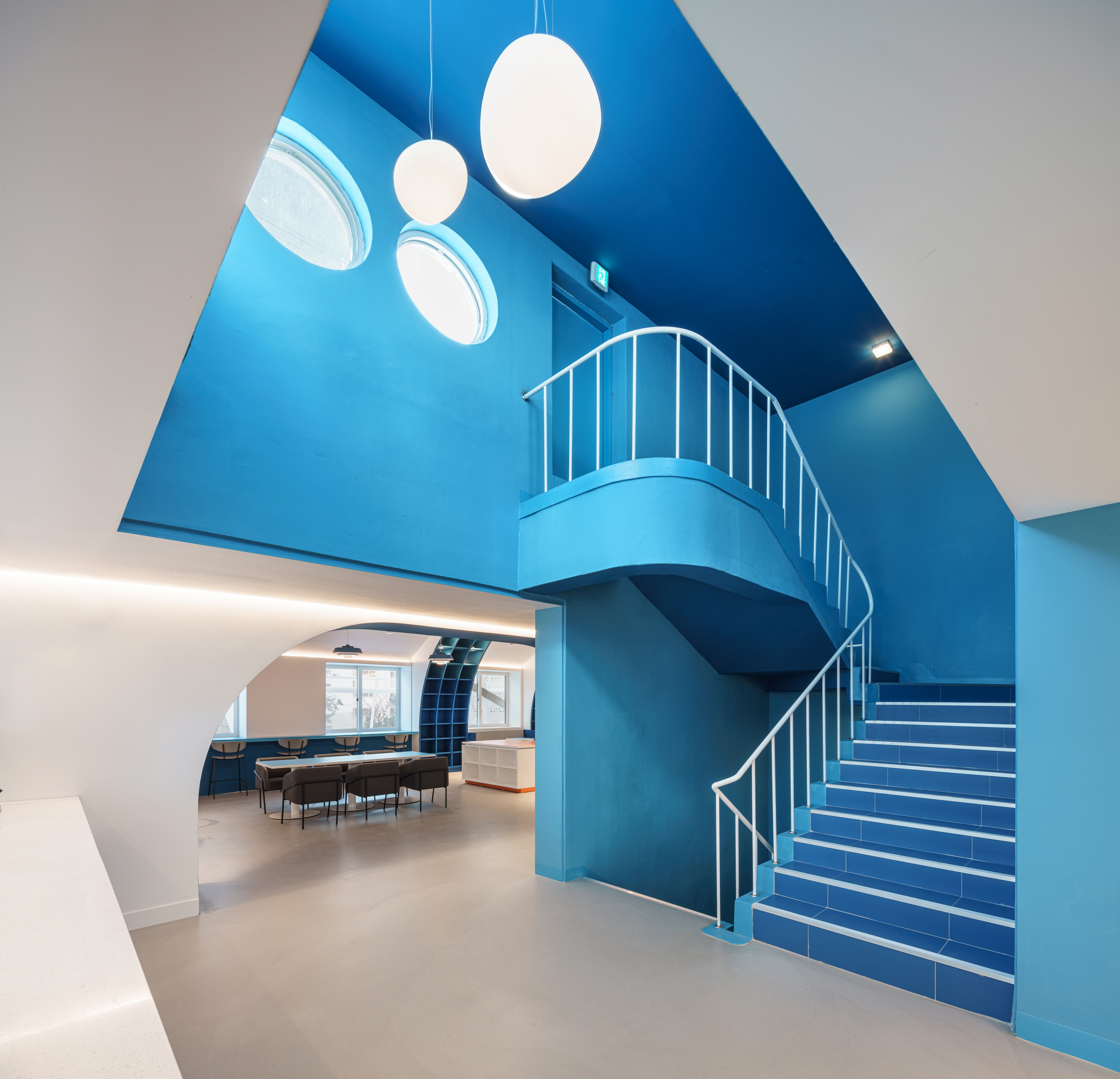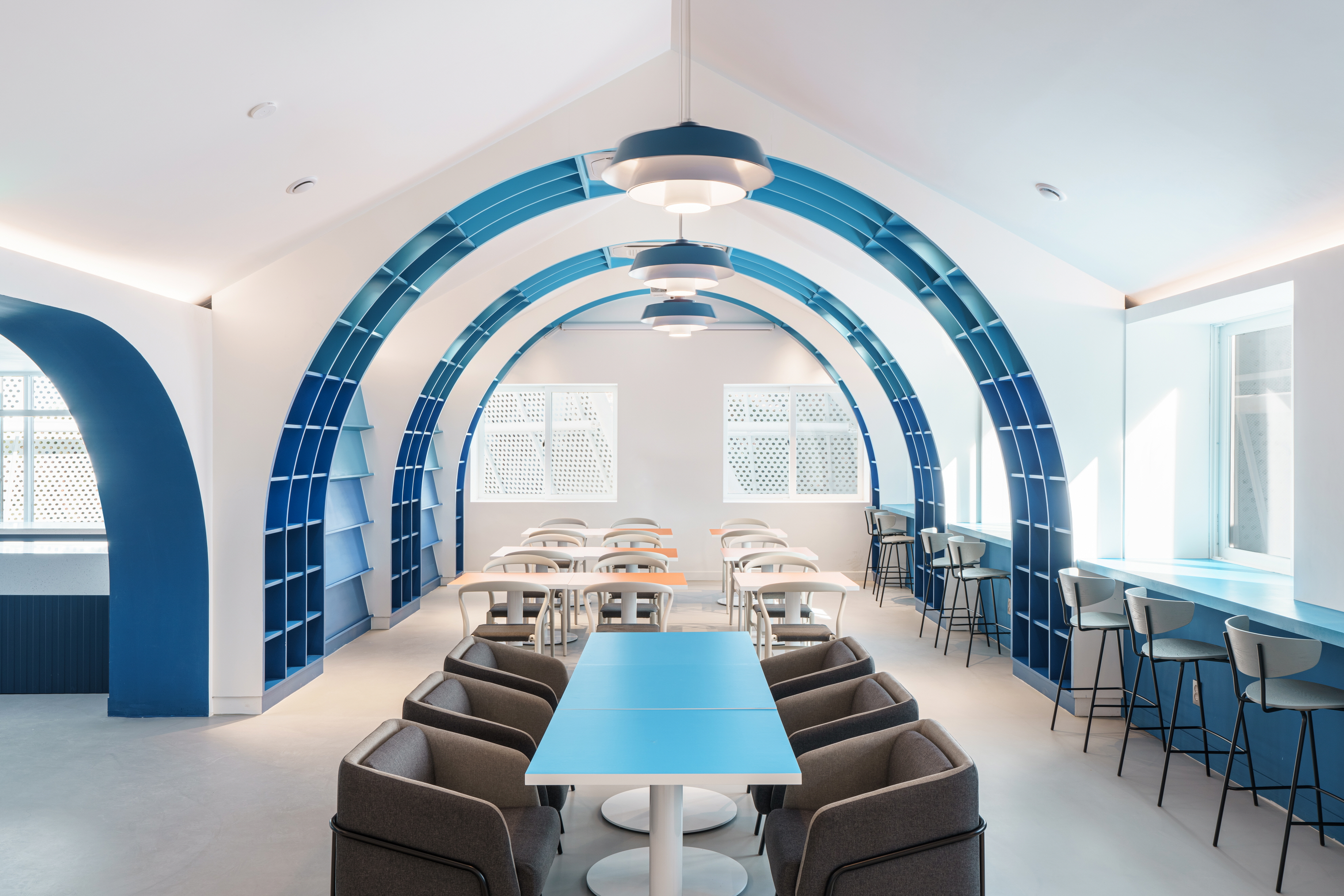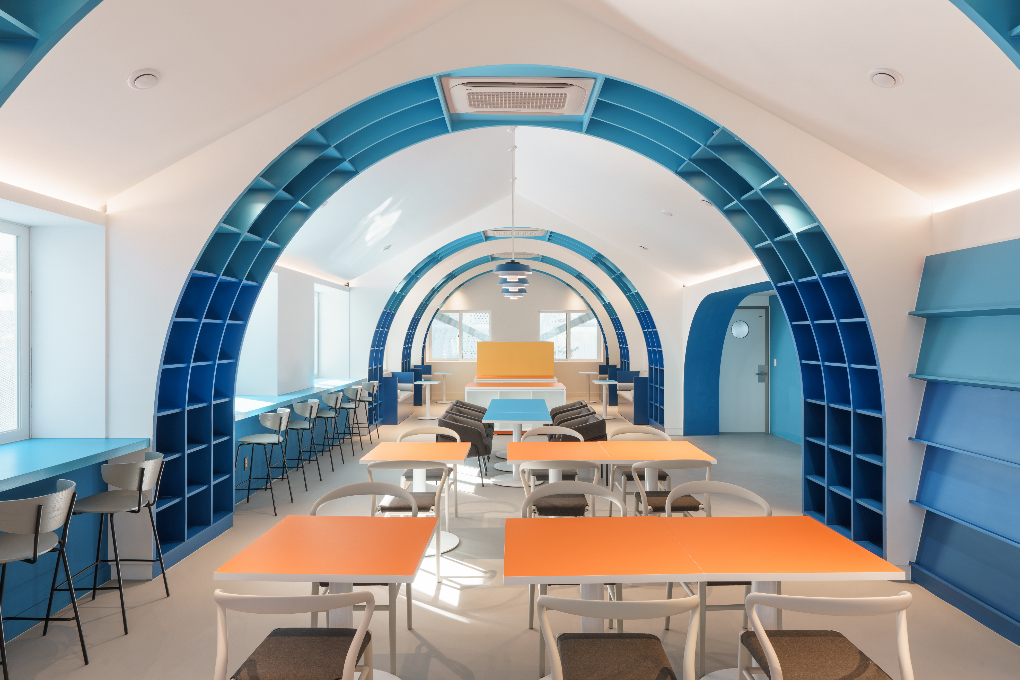 The traveling library that was born is reminiscent of a small paper boat on a quest for knowledge. For some, it is a paper boat, for others it is the sail of a sailboat, and for others it is a sparkling jewel, leaving room for many interpretations. The repetition of the arches is based on the shape of a ship. The arch structure is the main element of the library, the bookshelves, and the blue color evokes the image of dynamic waves. Between the arches are sofa-type and window-type seating areas, as well as tilted shelf-type bookcases, creating a variety of usable spaces that respond to the needs of different users. In the center of the library, long tables, small tables, and table-type display bookcases are also arranged to add interest to the space and accommodate various needs.