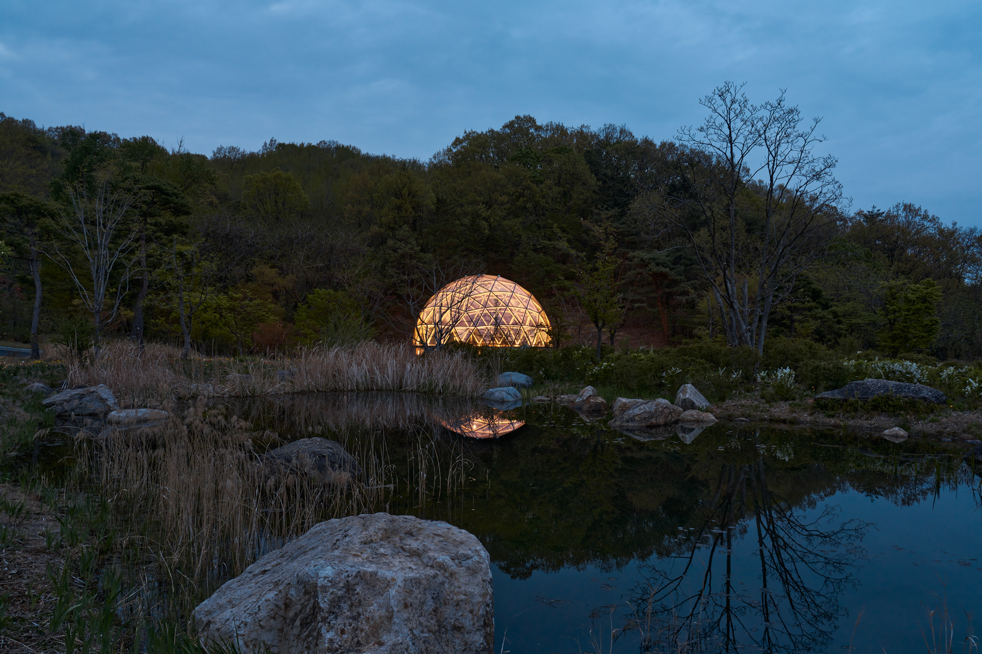 The Everland Forest Camp Dome (or Camp Dome) is a transparent structure located in a beautiful natural setting. Whatever the season, visitors can enjoy a variety of indoor activities while immersing themselves in nature in an assimilated space with transparent boundaries. The simple structure made of a combination of spheres and cylinders forms a single multi-purpose space with a diameter of 13.5m and a height of 9.4m. In the lush yet refined nature of the Everland Forest, the goal of the project was minimal architectural intervention. Primitive modeling was used to create a safe and present form without intruding on nature. The dome’s underlying form, the sphere, is the most basic shape in the universe, like a planet, a water droplet, or a fullerene (C60) molecule, which allows for maximum volume in three dimensions with minimal materials.