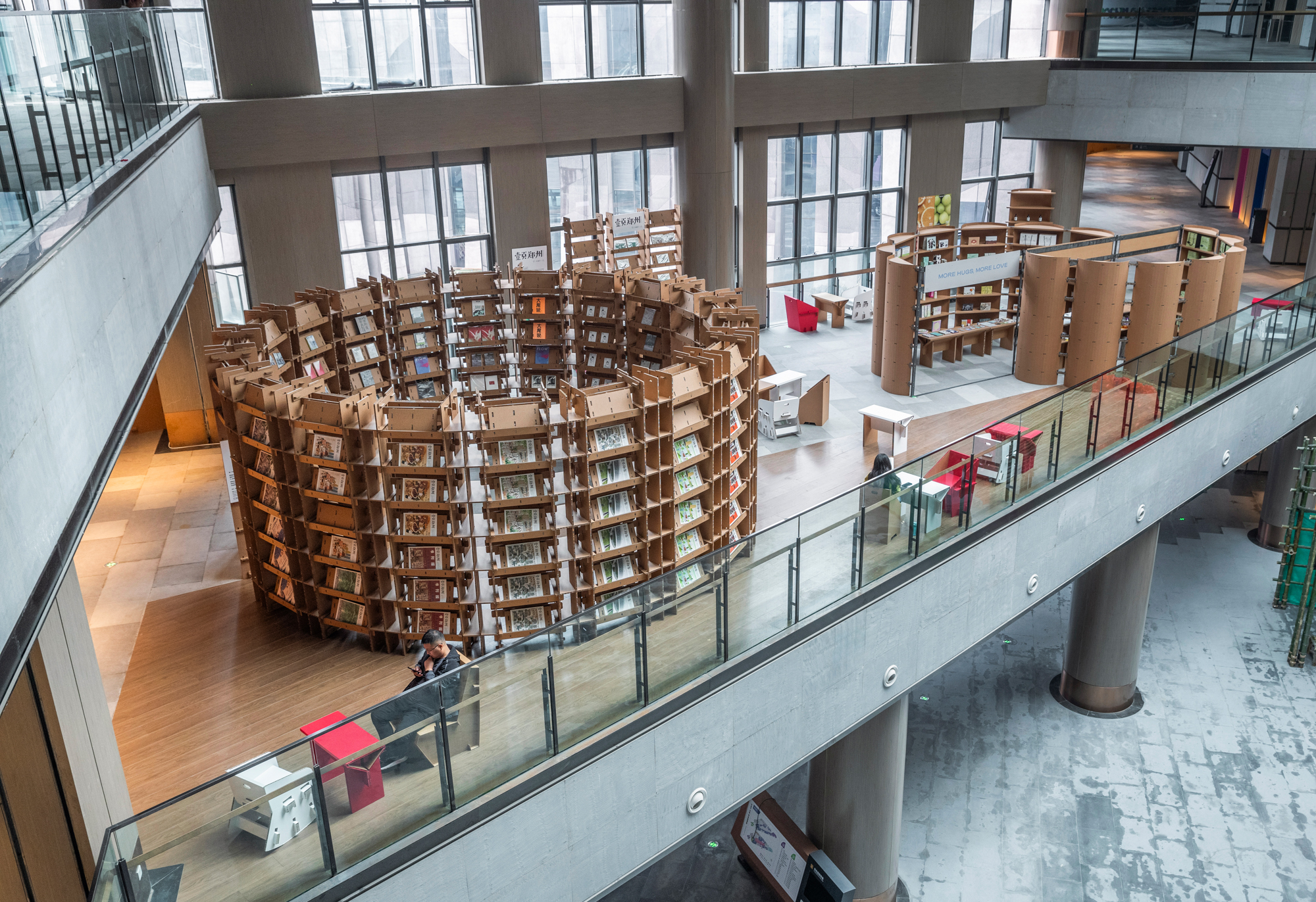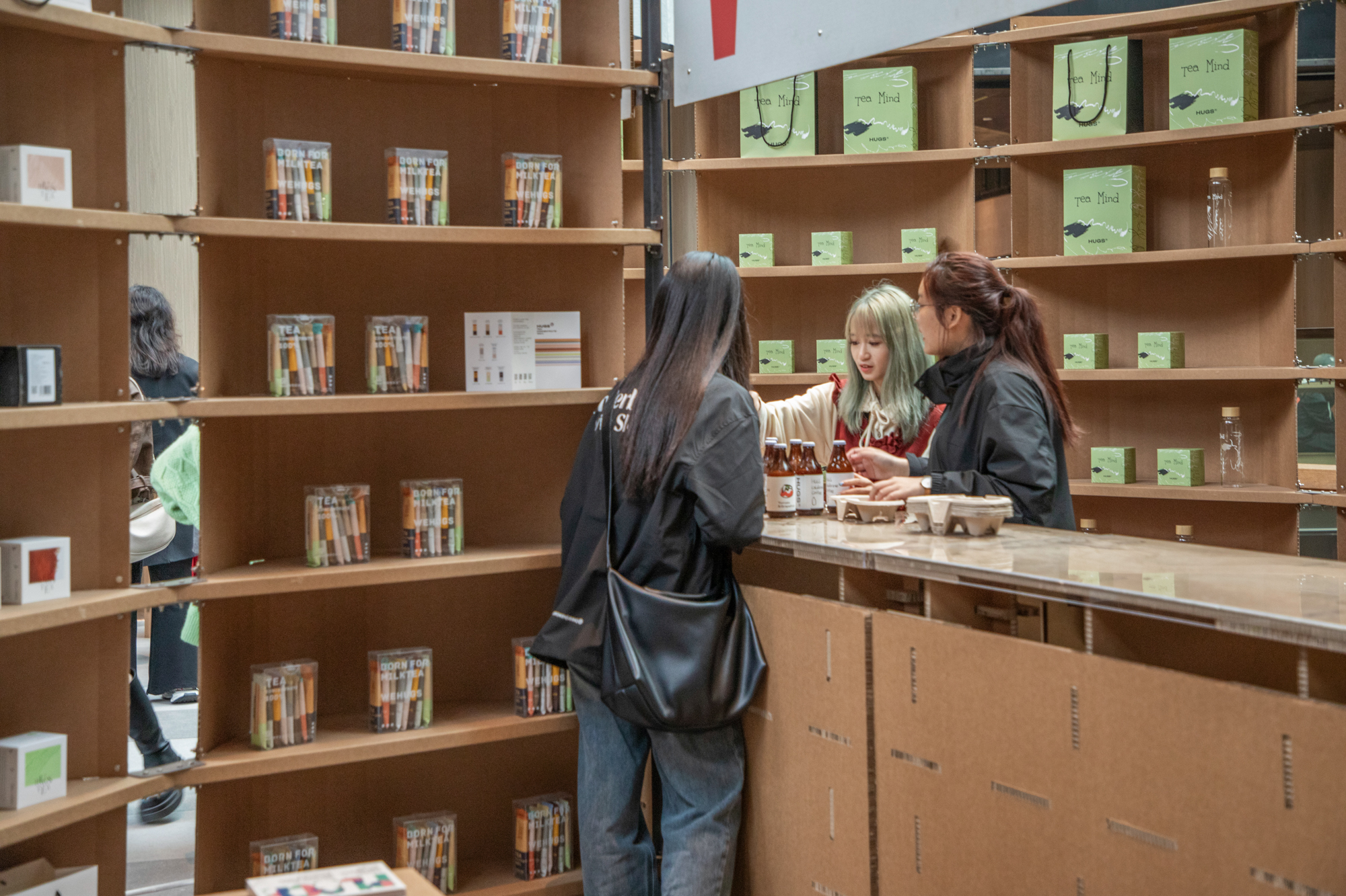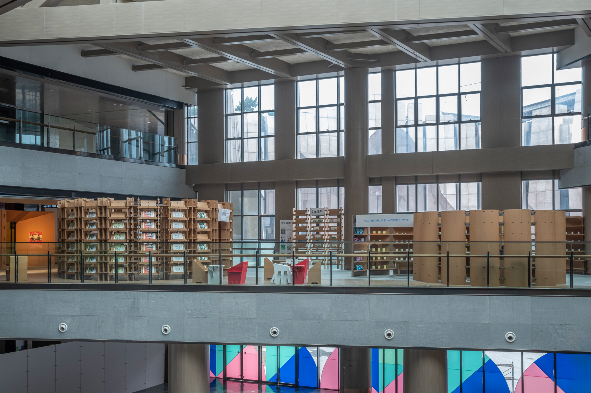 Two Paper Houses at Zhengzhou Airport is Exhibition Space 3.0, following exhibition spaces 1.0 and 2.0, which were formed from cardboard. As the Zhengzhou Airport Economic Zone was built on the Zhengzhou Garden Expo Park, these works demonstrate the regeneration and reuse of an idle large-scale commercial complex. The designers sought to connect the art exhibition to city life through active architectural interventions. The public space is a collaboration between local brands HUGS COFFEE and Doghood, which allows for the formation of a ‘coffee house’ and a ‘book house’. The two ‘houses’, which have a circular floor plan, are nestled in a trapezoid-shaped space. The designers divided the complete circle into two semicircles of different sizes. This created a take-out area and an internal display and sales area, while also ensuring the stability of the curved space.