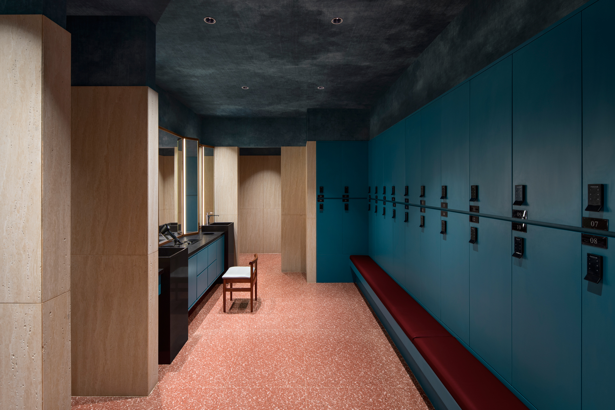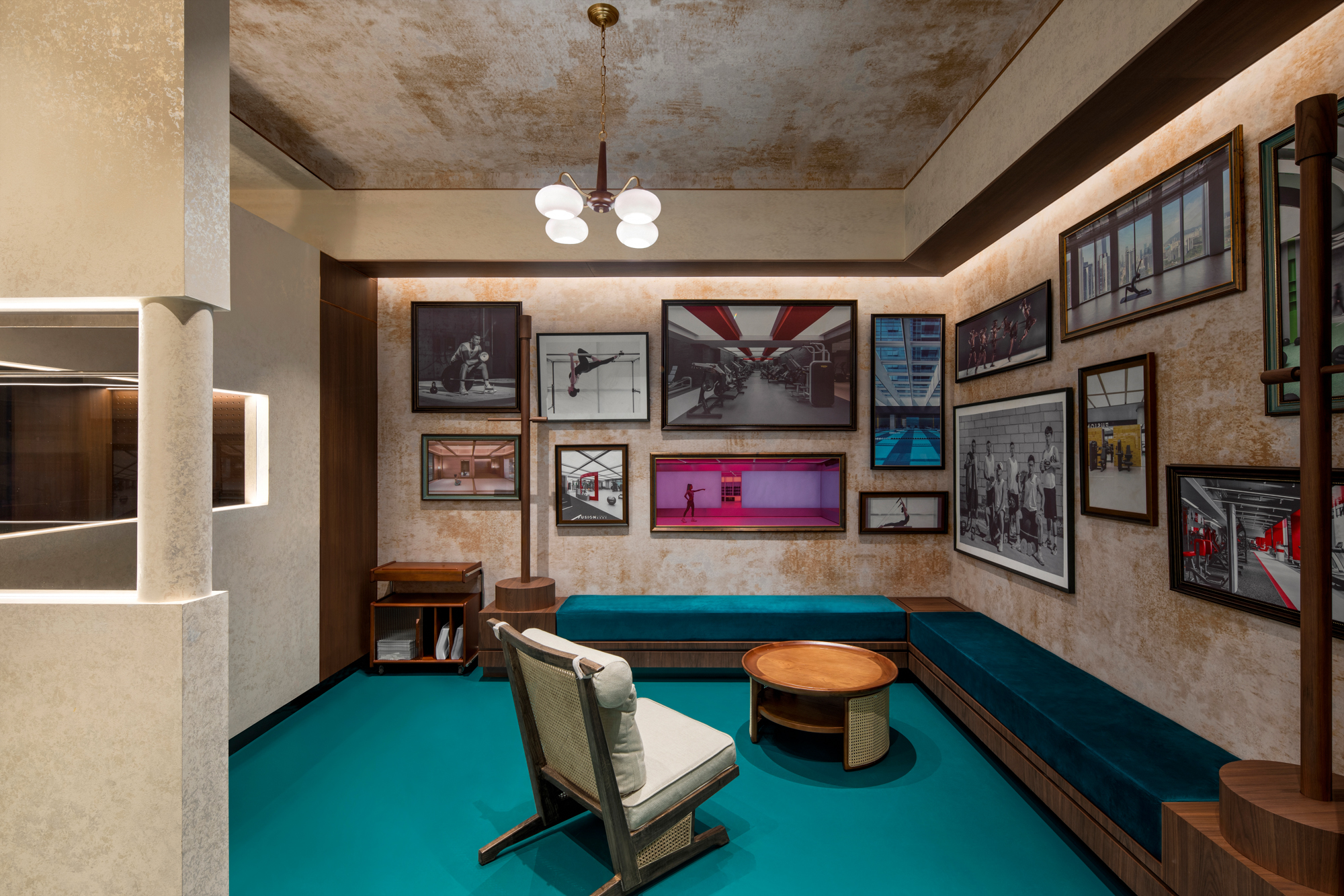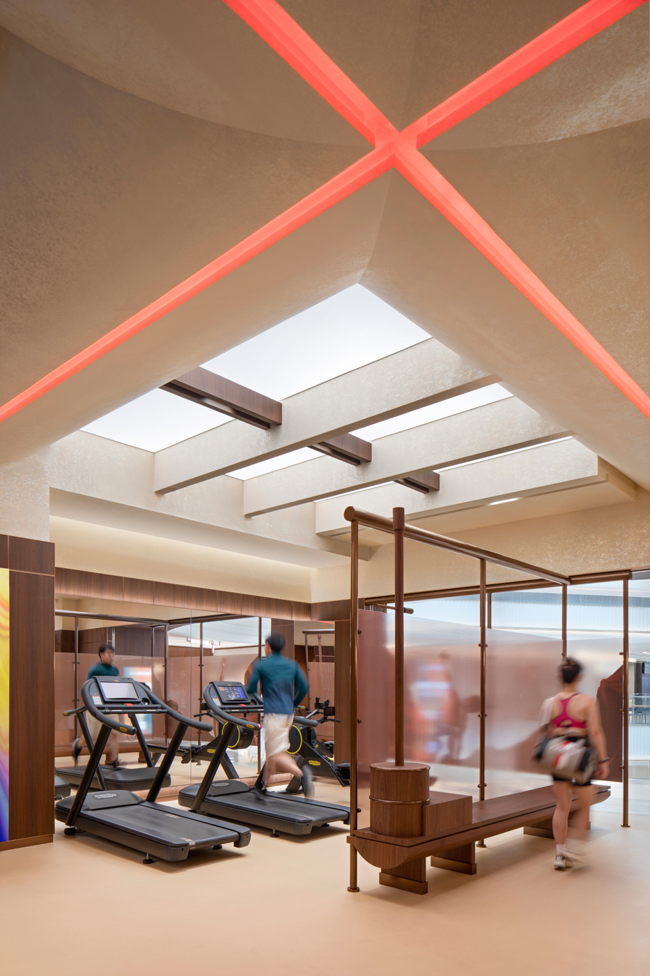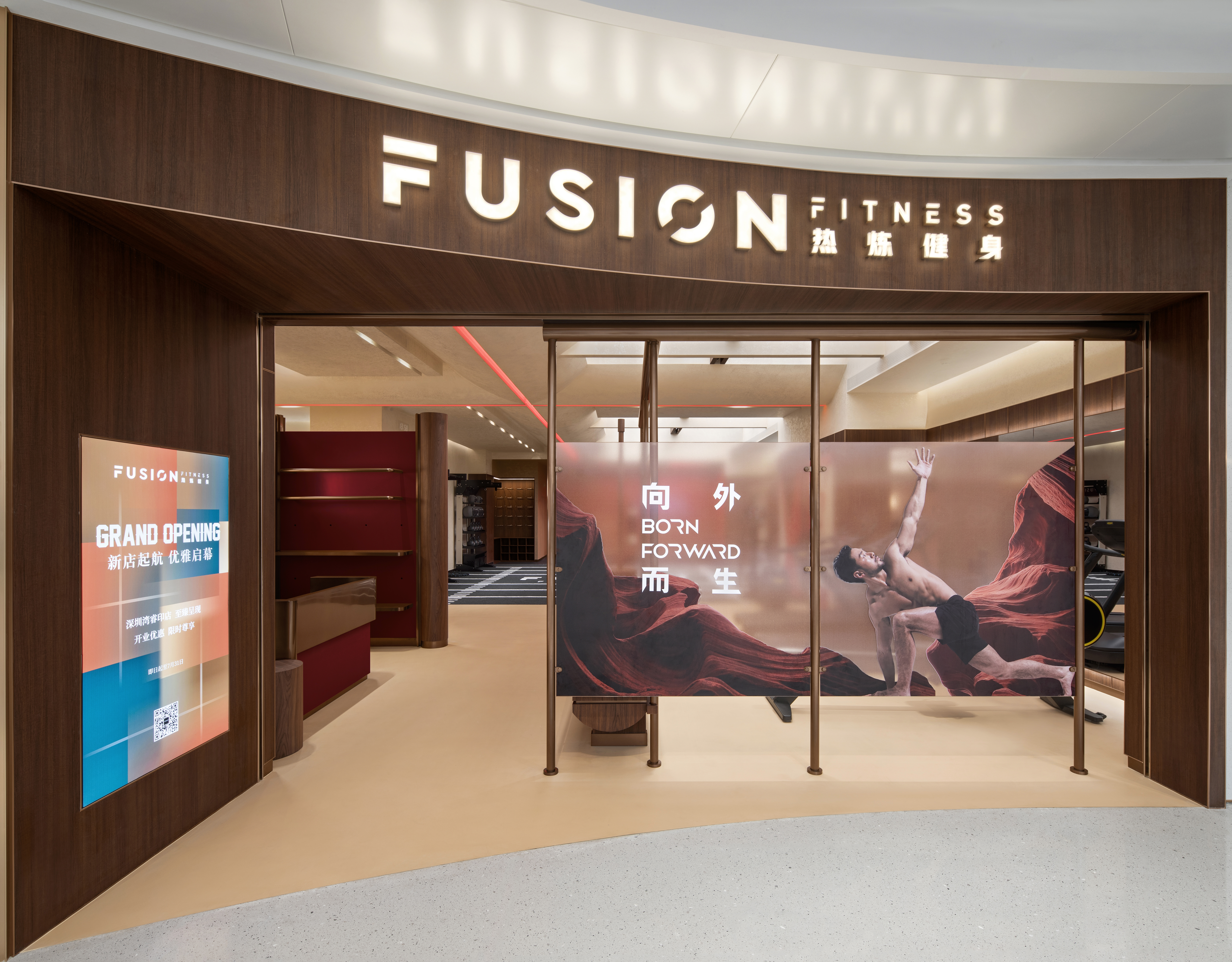 Fitness Fusion has opened a new gym within Shenzhen Bay Super Headquarters Base. Fitness Fusion has a brand philosophy that ‘physical exercise is a technical activity that brings well-being to life.’ Accordingly, the designers focused more on creating a brand image, unique spatial identity, and optimized user experience. The result is a unique fitness destination for the emerging elite in a fashionable and warm city. The design conveys a spatial narrative inspired by distant ancient mythological worlds, reflecting on the connection between humans and nature, the impact of climate change and the global environment, while also conveying deep thought and reverence for natural disasters and a longing for the future of humanity. The curved exterior facade has an elegant and distinctive aura, like a sailboat drifting along the shore ready to set sail. Posters showcasing the power of the brand and the flowing façade offers unobstructed views, while enclosing the new space of Fusion Fitness. Original installations and frosted glass partitions inspired by the sailboat's sailcloth utilize the space and create a quiet, protected atmosphere to focus on fitness.