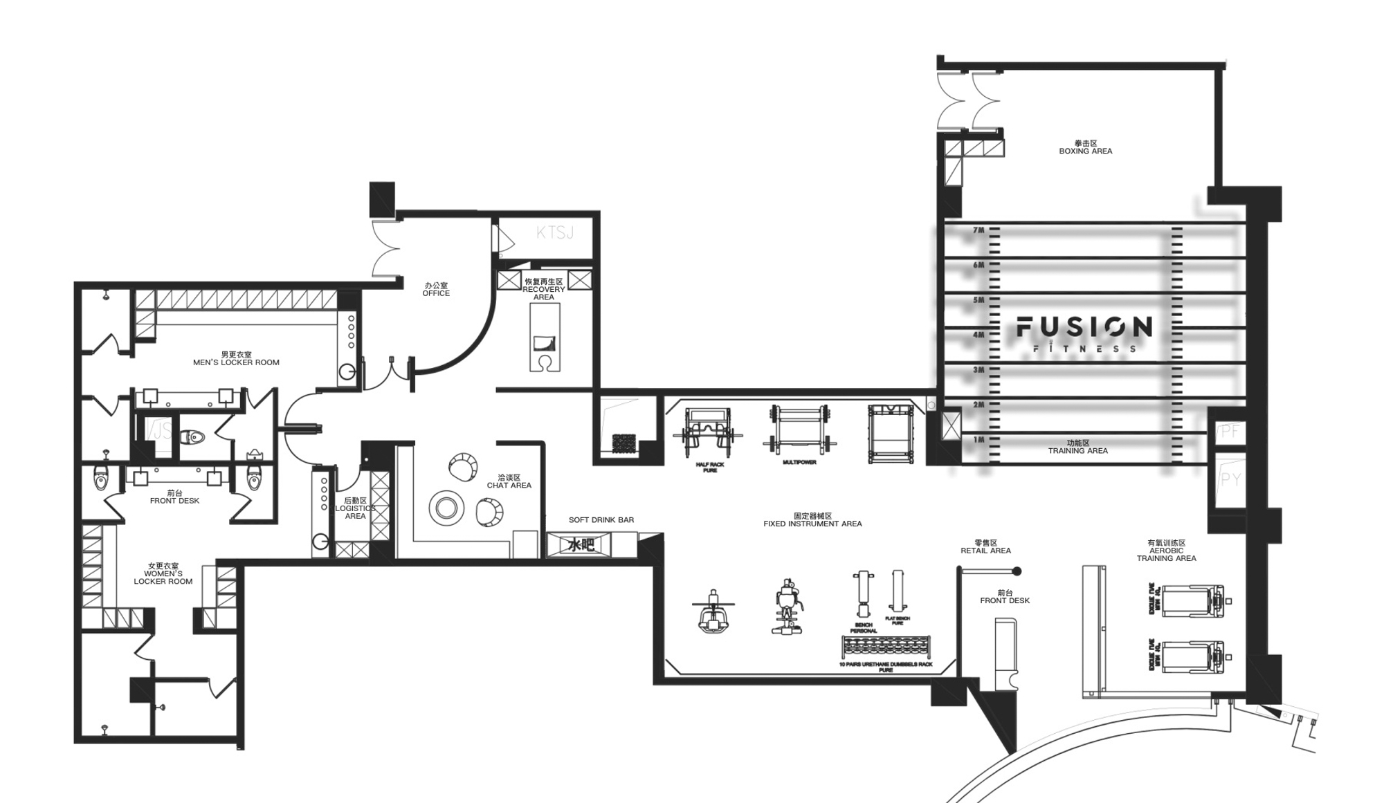 피트니스 퓨전은 Shenzhen Bay Super Headquarters Base내에 새로운 체육관을 열었다. 피트니스 퓨전은 ‘신체적 운동은 삶에 복지를 가져다줄 기술적 활동’이라는 브랜드 철학을 가지고 있다. 이에 맞춰서 디자이너는 브랜드 이미지, 독특한 공간 아이덴티티, 최적화된 사용자 경험을 만드는 데 더욱 집중했다. 세련된 패셔너블하고 따뜻한 도시의 신흥 엘리트들을 위한 독특한 피트니스 여행지 같은 장소로 만들어졌다. 디자인은 먼 고대 신화 세계에서 영감을 얻은 공간 서사를 통해 인간과 자연의 연관성, 기후 변화와 지구 환경의 영향을 돌아보는 동시에 자연 재해에 대한 깊은 사고와 경외, 인류의 미래에 대한 갈망을 전달한다. 곡선의 외관 정면은 마치 돛단배가 출항 준비를 마치고 해안을 따라 표류하는 것처럼 우아하고 독특한 분위기를 가진다. 브랜드의 힘을 보여주는 포스터와 흐르는 듯한 파사드는 막힘 없는 전망을 제공하며, 한편 퓨전 피트니스의 새로운 공간 영역을 에워싸고 있다. 돛단배의 돛단배에서 영감을 얻은 독창적인 설치물과 반투명 유리 파티션 등이 공간의 활용률을 높이고 조용하고 보호되는 분위기를 조성하여 체력단련에 집중할 수 있는 공간이다.