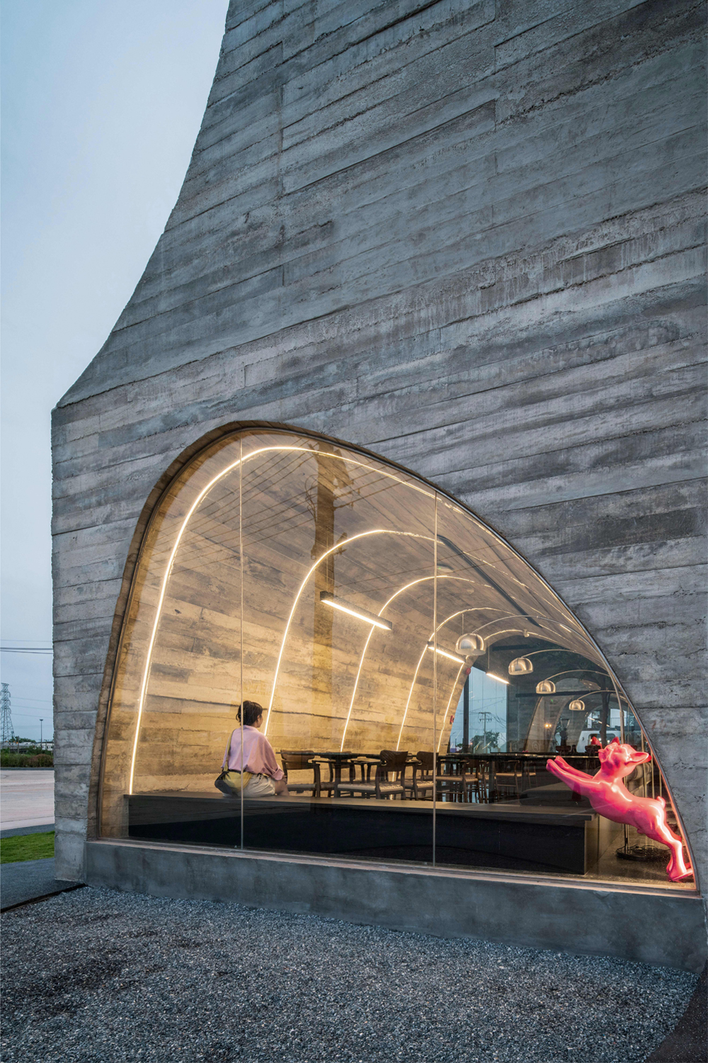 질감 있는 콘크리트를 사용함으로써, 벽이 완전히 매끄럽지 않지만 그 자체로 아름다울 수 있는 재료의 진정성을 반영하여 불완전함의 완벽함이라는 개념을 강화한다. 또한 콘크리트를 주요 소재로 사용함으로써 가구, 장식품 및 LED 조명을 두드러지게 만들어 불완전한 아치 곡선을 강조하고 터널 공간 안에서 강한 기억에 남는 카페의 이미지를 창출한다.