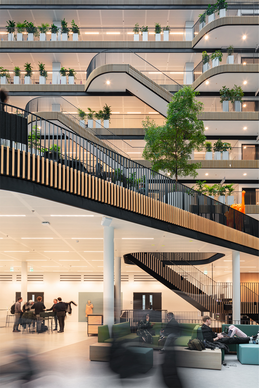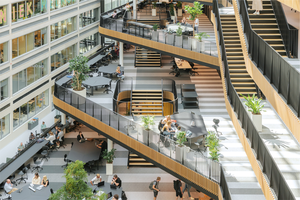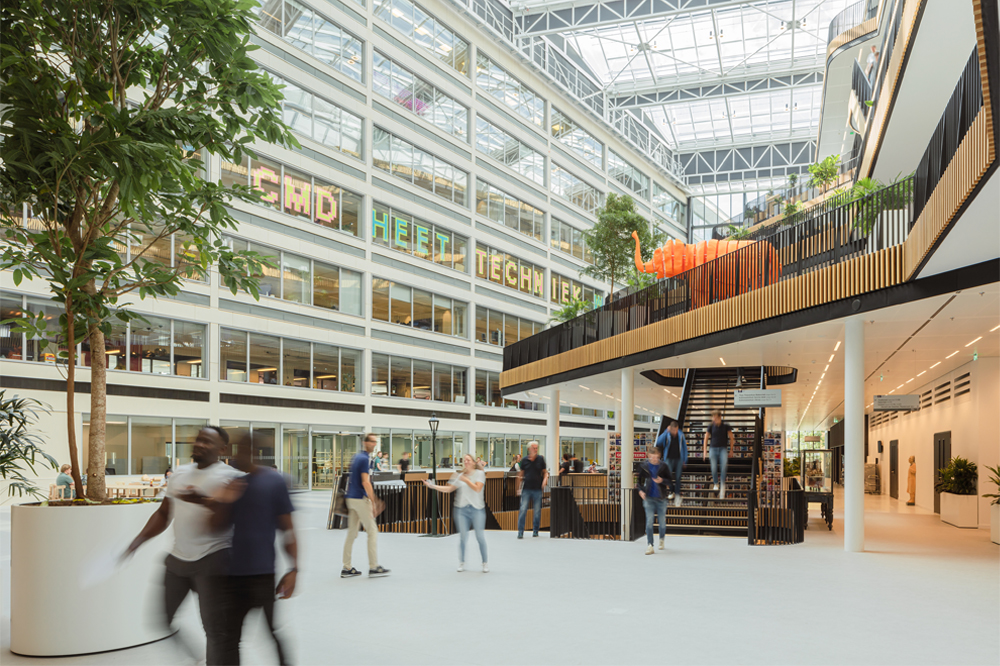 그랜드 아트리움은 건축 단계에서부터 야코바 멀더후이스(Jakoba Mulderhuis)와 인접해 있는 티센후이스(Theo Thijssenhuis)를 연결해준다. 모든 층은 아트리움으로 연결되어 있으며 학생들이 프로젝트를 진행할 수 있는 개방형 테라스도 마련되어 있다. 아트리움은 자연 채광이 풍부하게 들어와 개방된 건물의 특성을 보여준다. 건축가는 1층에서 주요 행사와 전시회를 위한 연극 공간, 다양한 학문 분야의 학생들이 만날 계층형 플랫폼 역할을 하는 새로운 공공 공간이었습니다. 창의성을 키우고, 사람들이 모여서 자신의 작업을 보여주고 지식을 공유하는 즐거움을 누리는 곳으로 사용되도록 설계하였다. 기술이 무엇을 제공해야 하는지, 교육 연구와 사회가 어디에서 융합되고 병합될 수 있는지 명확하게 알려줄 수 있는 곳이다. 높이 솟은 극장 테라스를 갖춘 아트리움은 극장의 테라스가 높이 솟아 있고 학생들은 층에서 다른 층으로 넘어갈 수 있다. 그 때 다른 사람들이 진행 중인 프로젝트에서 영감을 얻을 수도 있다.