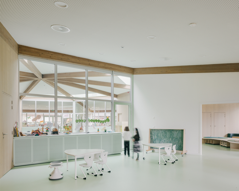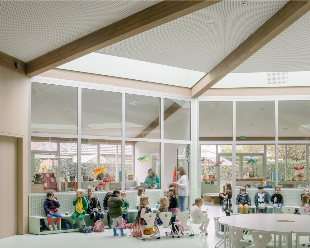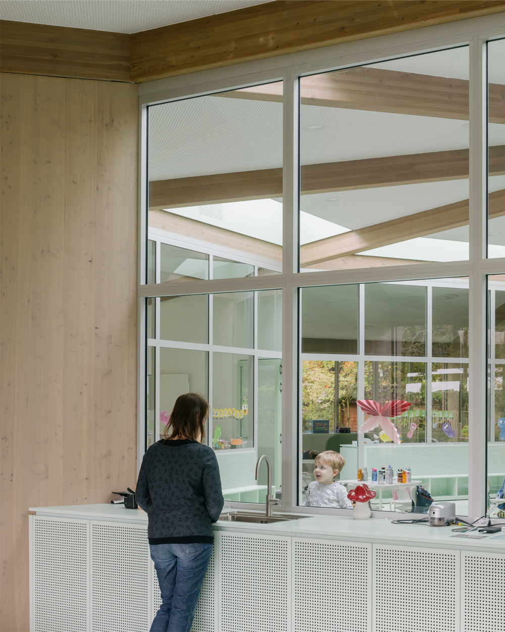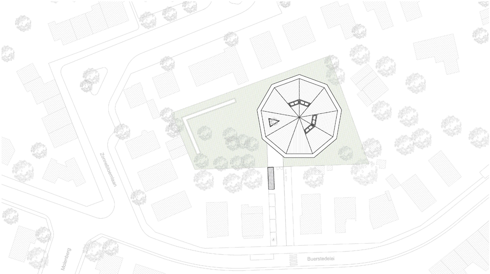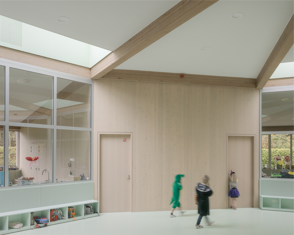 요구된 프로그램에는 4개의 동일한 유치원 교실과 함께 다기능 홀, 식당, 일부 저장 시설, 주방, 스태프 룸 및 유치원이 필요하다. 우리는 교실을 두 개씩 조합하고 연속적으로 배치하는 것을 제안했다. 각 교실은 자체 저장 시설 및 위생 시설이 있는 별도의 공간을 갖추고 있다. 교실은 중앙의 다목적 홀을 중심으로 구성되어, 각 교실이 다목적 홀과 직접 연결된 아주 조밀한 건물을 만든다. 식당은 해당 홀의 핵심 부분이다. 건물은 부지의 동쪽에 위치하며 야외 놀이방을 통해 입구로 개방되는 9각형의 모양을 띄고 있다. 그 결과는 장난스러운 형태에도 불구하고 현장의 제한된 경계 내에 쉽게 배치되는 조밀하고 효율적인 건물이다.