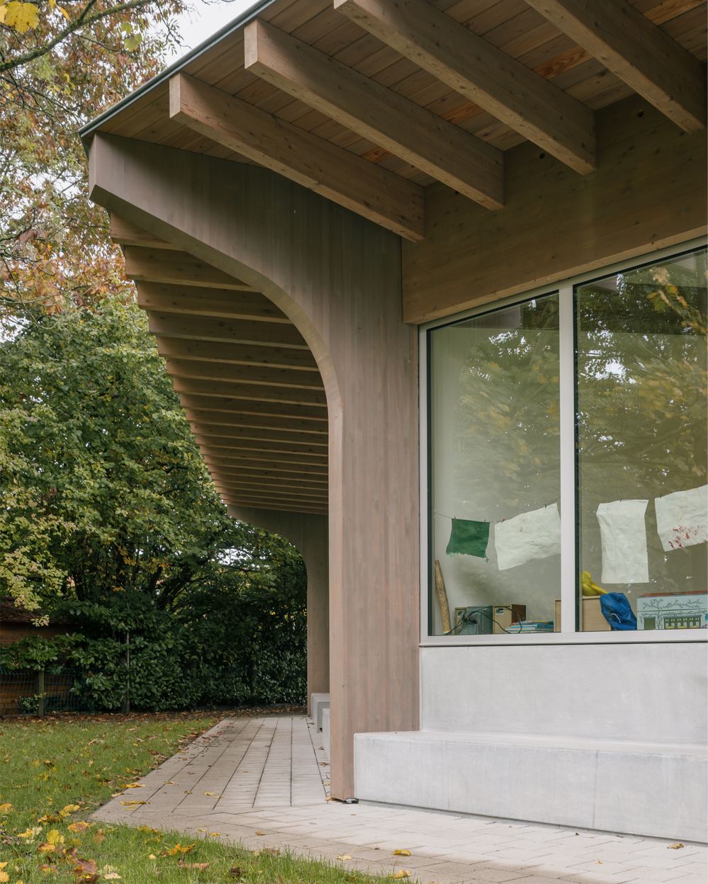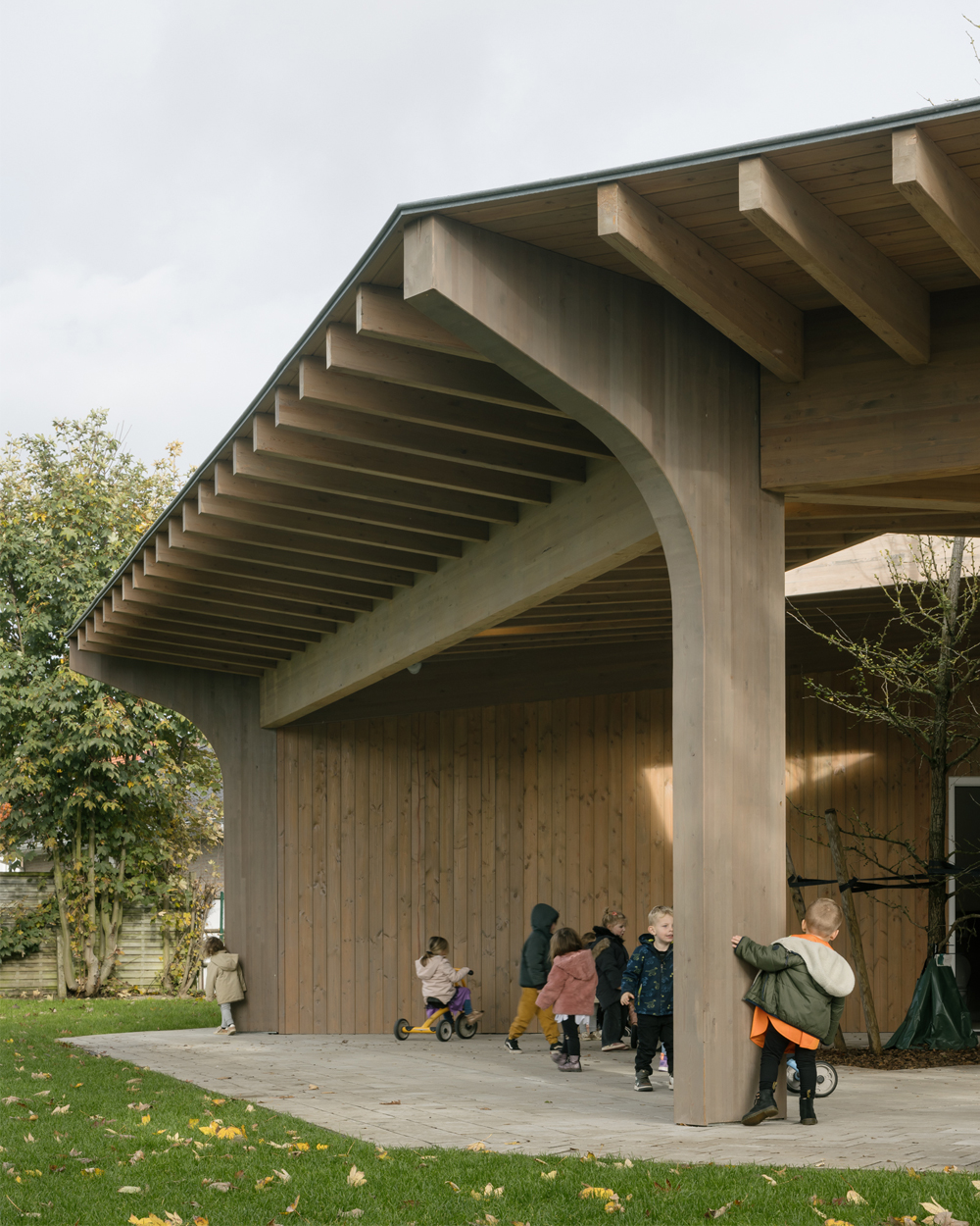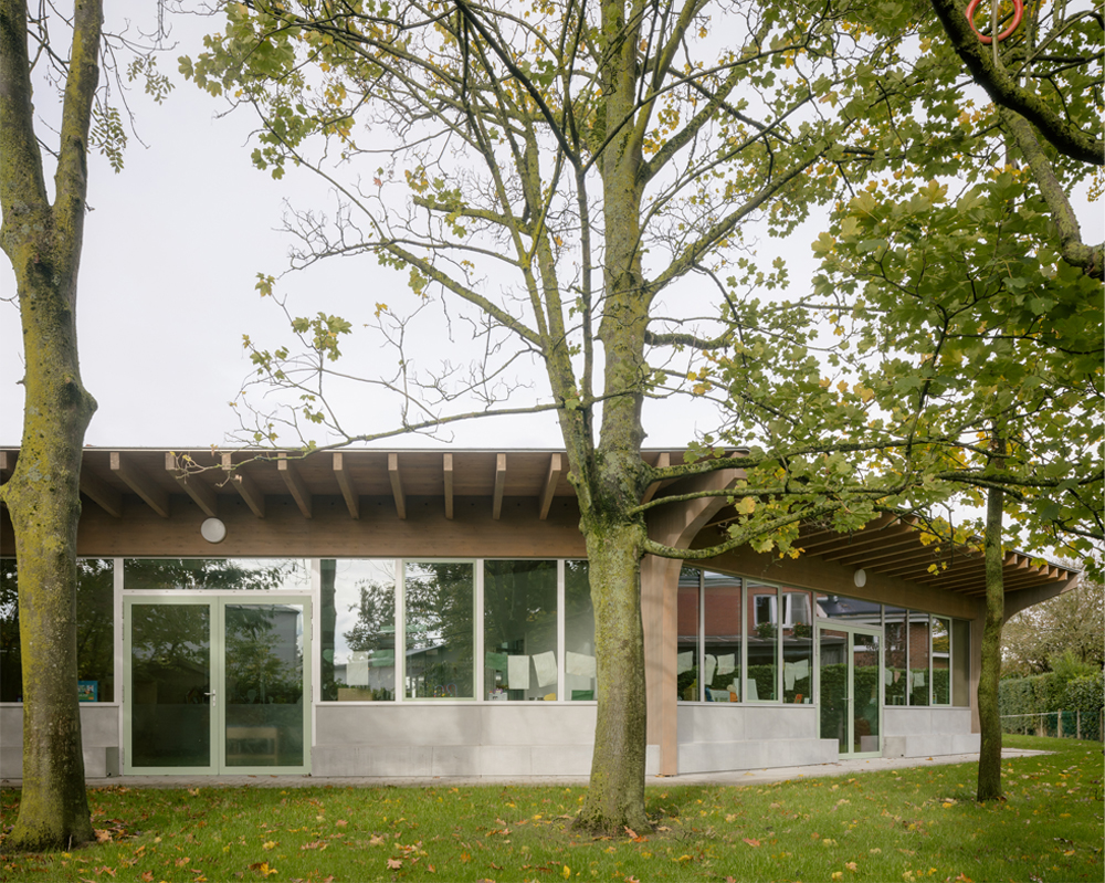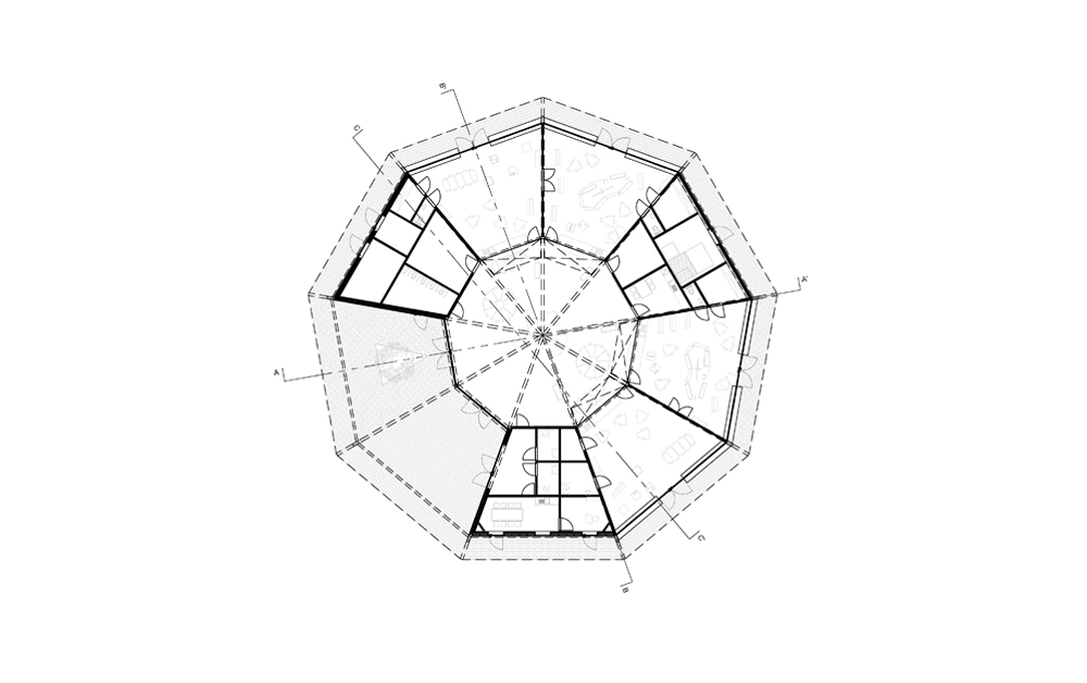 요구된 프로그램에는 4개의 동일한 유치원 교실과 함께 다기능 홀, 식당, 일부 저장 시설, 주방, 스태프 룸 및 유치원이 필요하다. 우리는 교실을 두 개씩 조합하고 연속적으로 배치하는 것을 제안했다. 각 교실은 자체 저장 시설 및 위생 시설이 있는 별도의 공간을 갖추고 있다. 교실은 중앙의 다목적 홀을 중심으로 구성되어, 각 교실이 다목적 홀과 직접 연결된 아주 조밀한 건물을 만든다. 식당은 해당 홀의 핵심 부분이다. 건물은 부지의 동쪽에 위치하며 야외 놀이방을 통해 입구로 개방되는 9각형의 모양을 띄고 있다. 그 결과는 장난스러운 형태에도 불구하고 현장의 제한된 경계 내에 쉽게 배치되는 조밀하고 효율적인 건물이다.