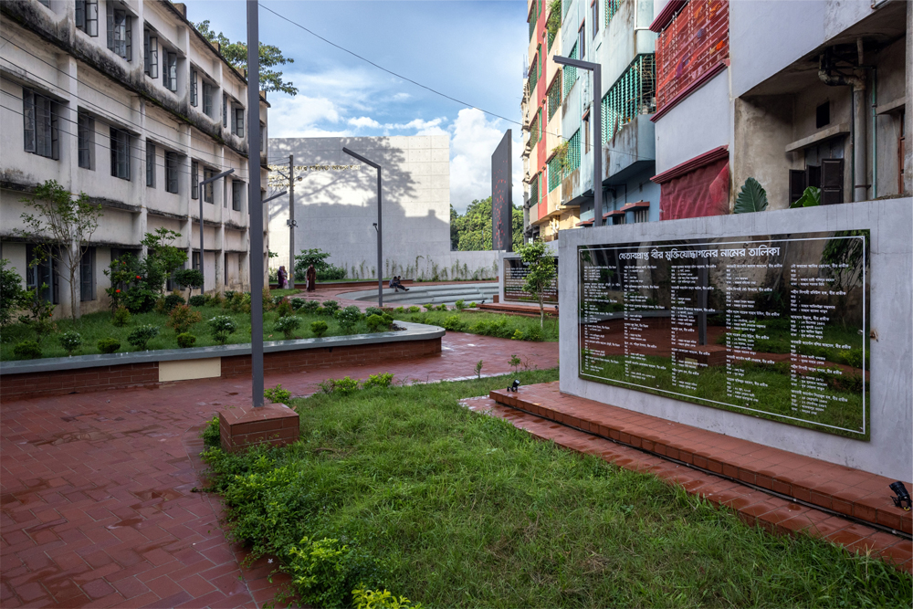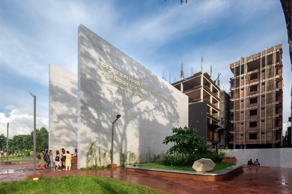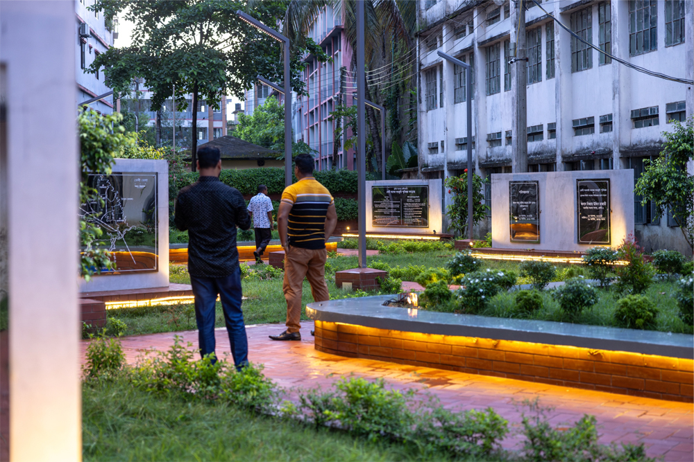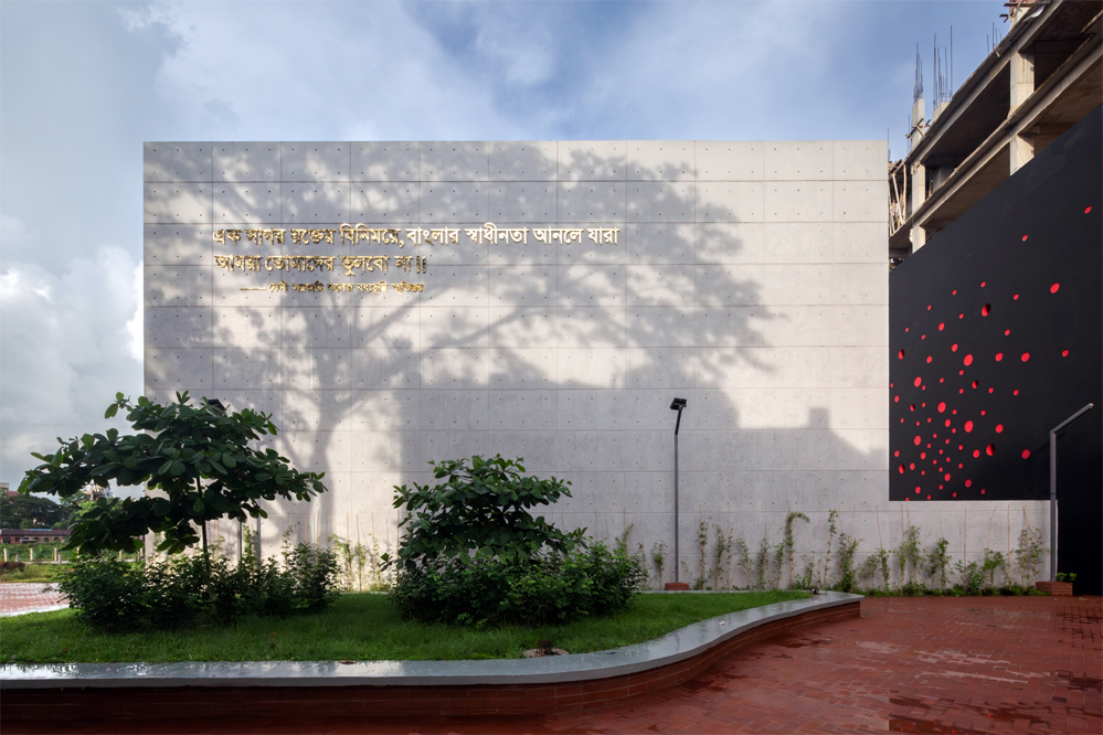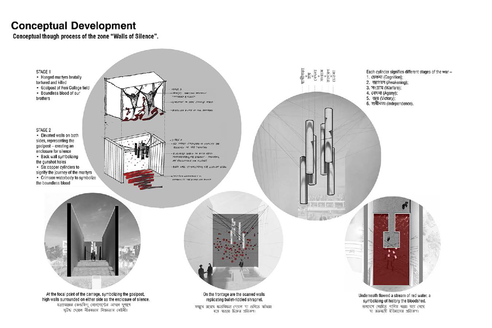 프로그램에서 요구했던 사항은 사람들 모두가 역사와 연결되어 있다는 상호 관계를 느끼게 해주는 활기찬 공간을 큐레이팅 해달라는 것이었다. 엄청난 높이의 기념비는 먼 곳에서도 많은 사람들이 볼 수 있다. 사람들은 이곳 주변의 멋진 풍경에 홀린 듯 감상한다. 건물의 보도는 학교 안뜰과 연결되어 있다. 또한, 연못 옆 산책로 와도 가까이 있다. 보행로를 따라 걸어가면 악명 높은 축구 경기장을 나타내는 40피트 높이의 두개의 벽이 주는 광대함을 느낄 수 있다. 콘크리트 파사드 왼편에는 ‘해방의 사원 계단에는 수 많은 생명의 희생이 눈물로 적혀 있다.’ 라는 문구가 황금색의 방글라데시어로 쓰여 있다.