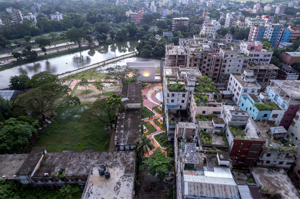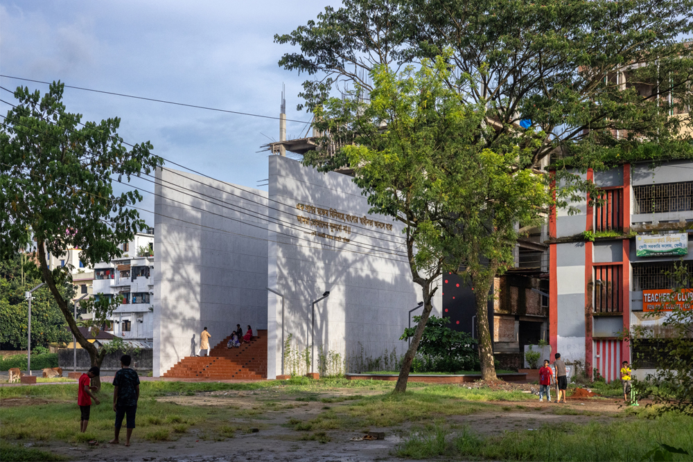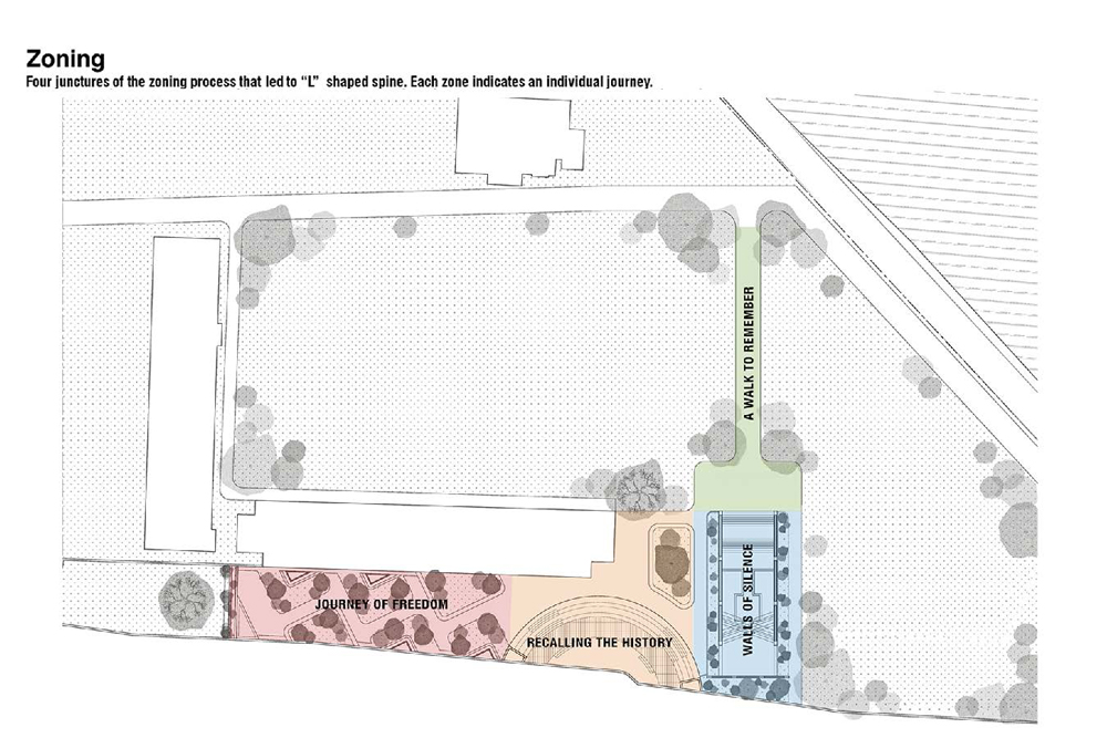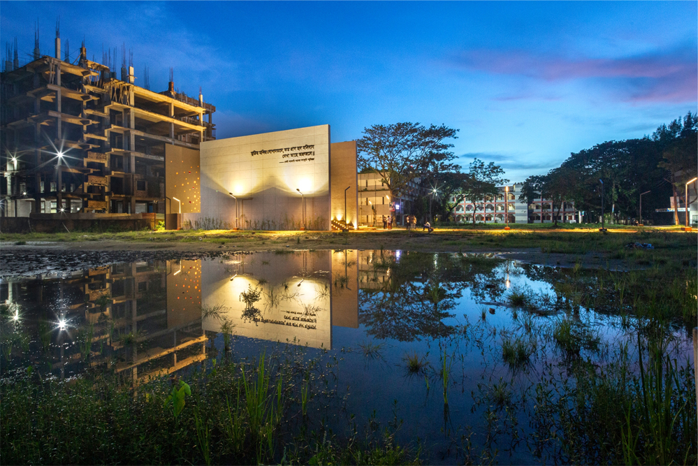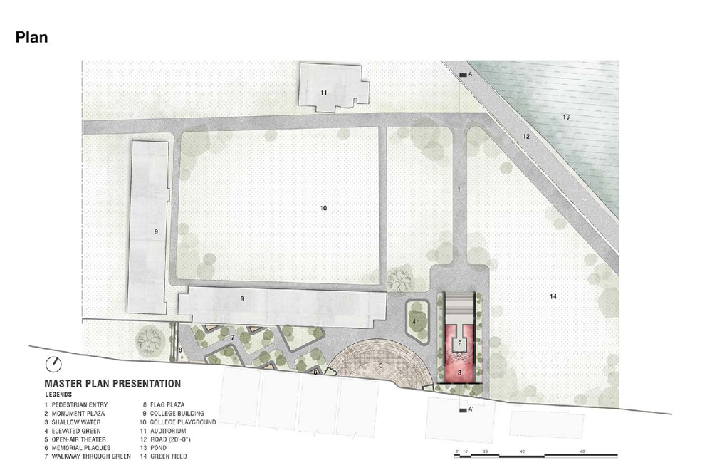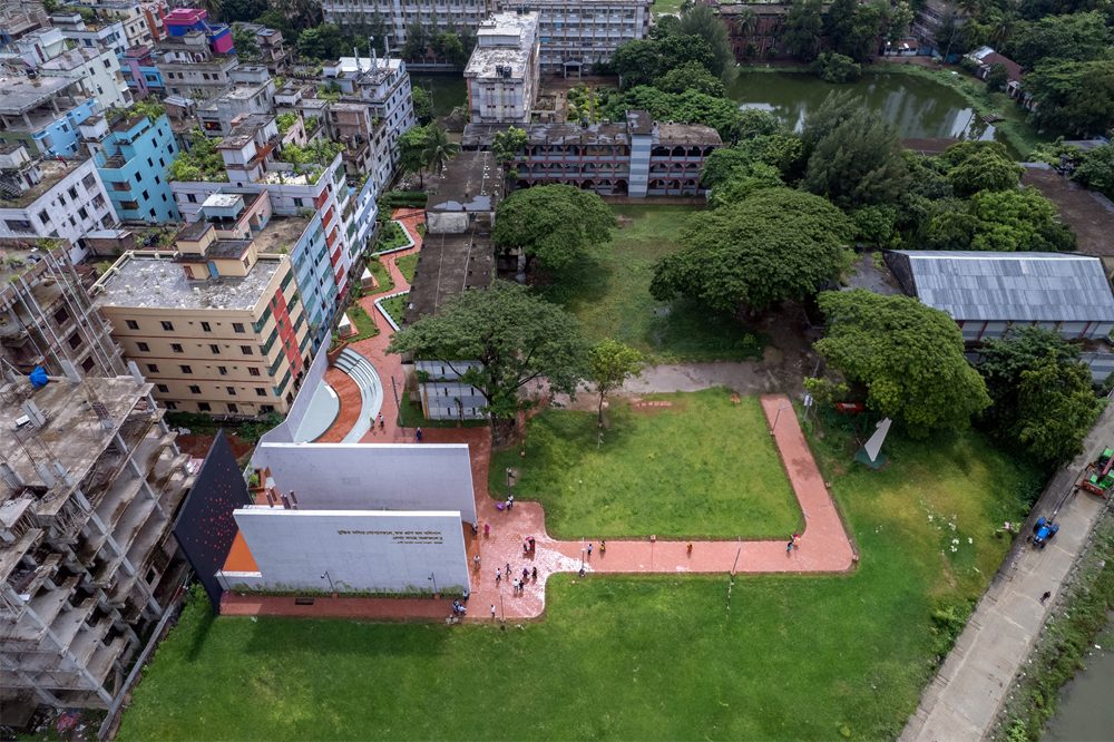 프로그램에서 요구했던 사항은 사람들 모두가 역사와 연결되어 있다는 상호 관계를 느끼게 해주는 활기찬 공간을 큐레이팅 해달라는 것이었다. 엄청난 높이의 기념비는 먼 곳에서도 많은 사람들이 볼 수 있다. 사람들은 이곳 주변의 멋진 풍경에 홀린 듯 감상한다. 건물의 보도는 학교 안뜰과 연결되어 있다. 또한, 연못 옆 산책로 와도 가까이 있다. 보행로를 따라 걸어가면 악명 높은 축구 경기장을 나타내는 40피트 높이의 두개의 벽이 주는 광대함을 느낄 수 있다. 콘크리트 파사드 왼편에는 ‘해방의 사원 계단에는 수 많은 생명의 희생이 눈물로 적혀 있다.’ 라는 문구가 황금색의 방글라데시어로 쓰여 있다.