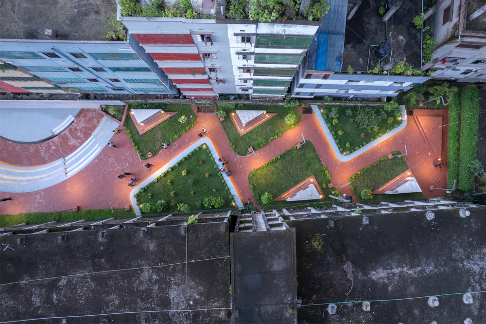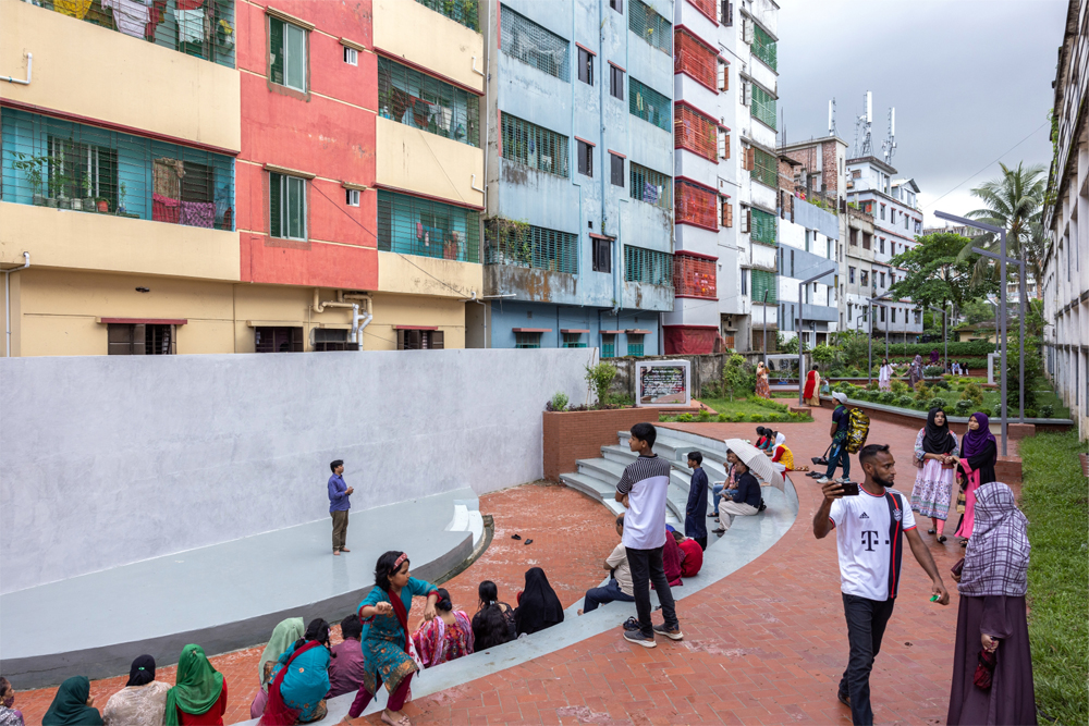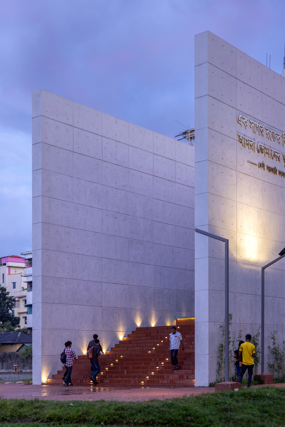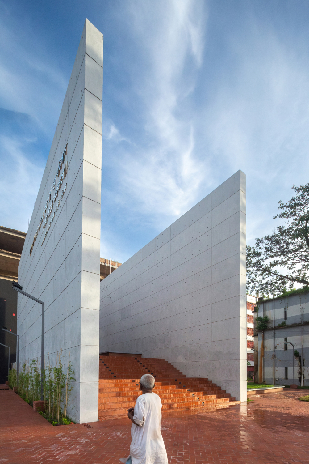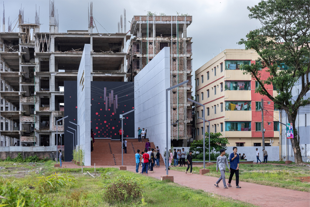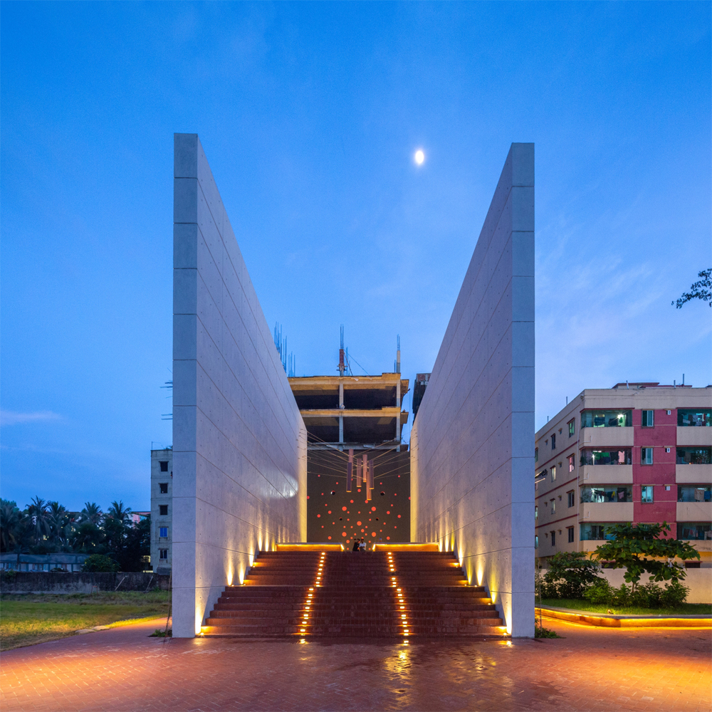 프로그램에서 요구했던 사항은 사람들 모두가 역사와 연결되어 있다는 상호 관계를 느끼게 해주는 활기찬 공간을 큐레이팅 해달라는 것이었다. 엄청난 높이의 기념비는 먼 곳에서도 많은 사람들이 볼 수 있다. 사람들은 이곳 주변의 멋진 풍경에 홀린 듯 감상한다. 건물의 보도는 학교 안뜰과 연결되어 있다. 또한, 연못 옆 산책로 와도 가까이 있다. 보행로를 따라 걸어가면 악명 높은 축구 경기장을 나타내는 40피트 높이의 두개의 벽이 주는 광대함을 느낄 수 있다. 콘크리트 파사드 왼편에는해방의 사원 계단에는 수 많은 생명의 희생이 눈물로 적혀 있다.’ 라는 문구가 황금색의 방글라데시어로 쓰여 있다.