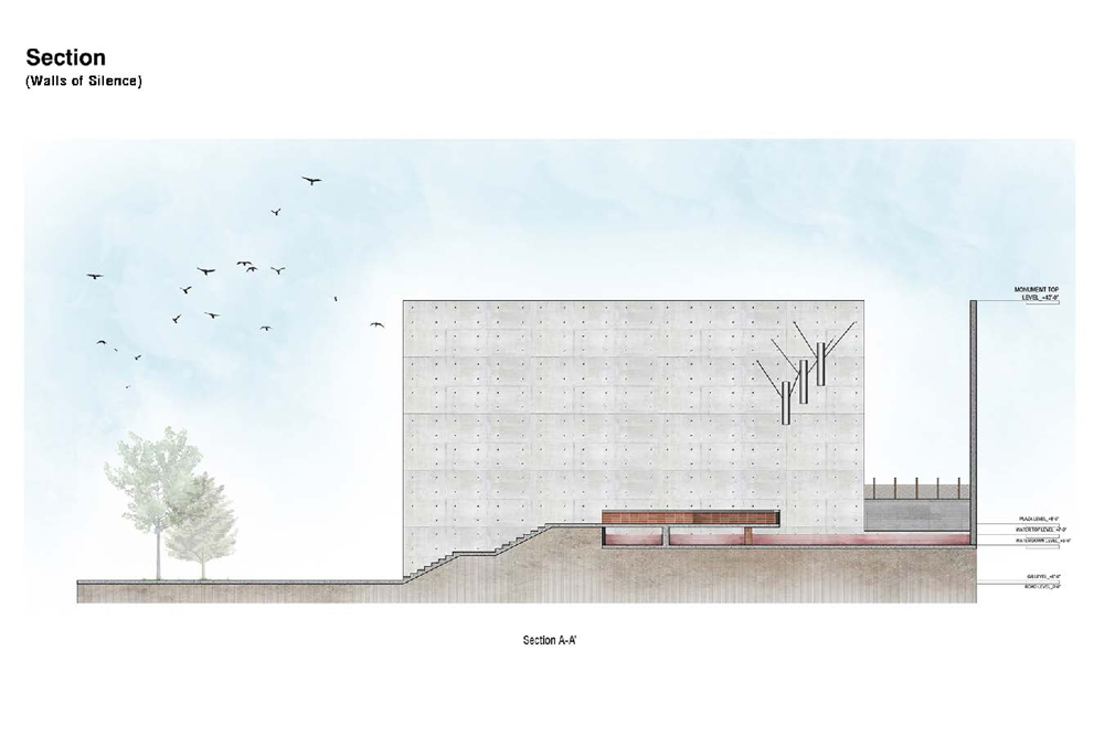 뒤쪽의 40피트 검은색 벽에는 순교자들 겪었던 총격에 의한 피처럼 붉은 펀치가 둥글게 박혀 있다. 기념비적인 광장까지 16개의 조명 계단이 줄지어 있고 그 곳에서 올려다보면 끈으로 매달린 6개의 구리 원통이 있다. 이는 페니의 불멸의 전사들의 여정을 상징하는 것이다. 각 실린더마다 전쟁에서 보여주었던 단계를 나타내고 있다. –인지, 각석, 전쟁, 고뇌, 승리-