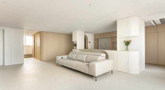 현관은 대문을 열었을 때 집 안의 분위기를 가장 먼저 마주하는 곳으로, 세밀한 디테일을 담은 화사한 베이지 톤 타일을 선택해 집 안 전체를 관통하는 안온하고 세련된 감각을 엿볼 수 있게 연출했다. 기존에 고립되어 있었던 주방은 구조 변경을 통해 집의 구심점이 되는 대면형 주방으로 변신했다. 다이닝 룸과 거실을 바라보는 주방 배치는 온 식구가 자유롭게 소통할 수 있어 가족 간의 관계를 더 가깝고 단단하게 엮는 정서적인 역할을 수행한다.