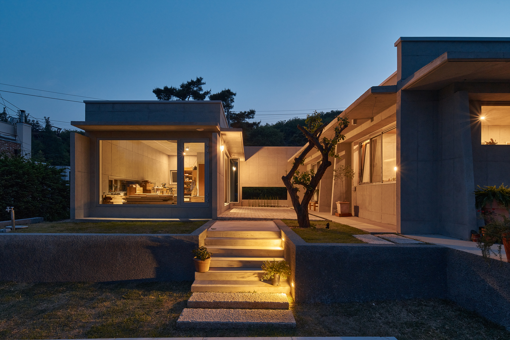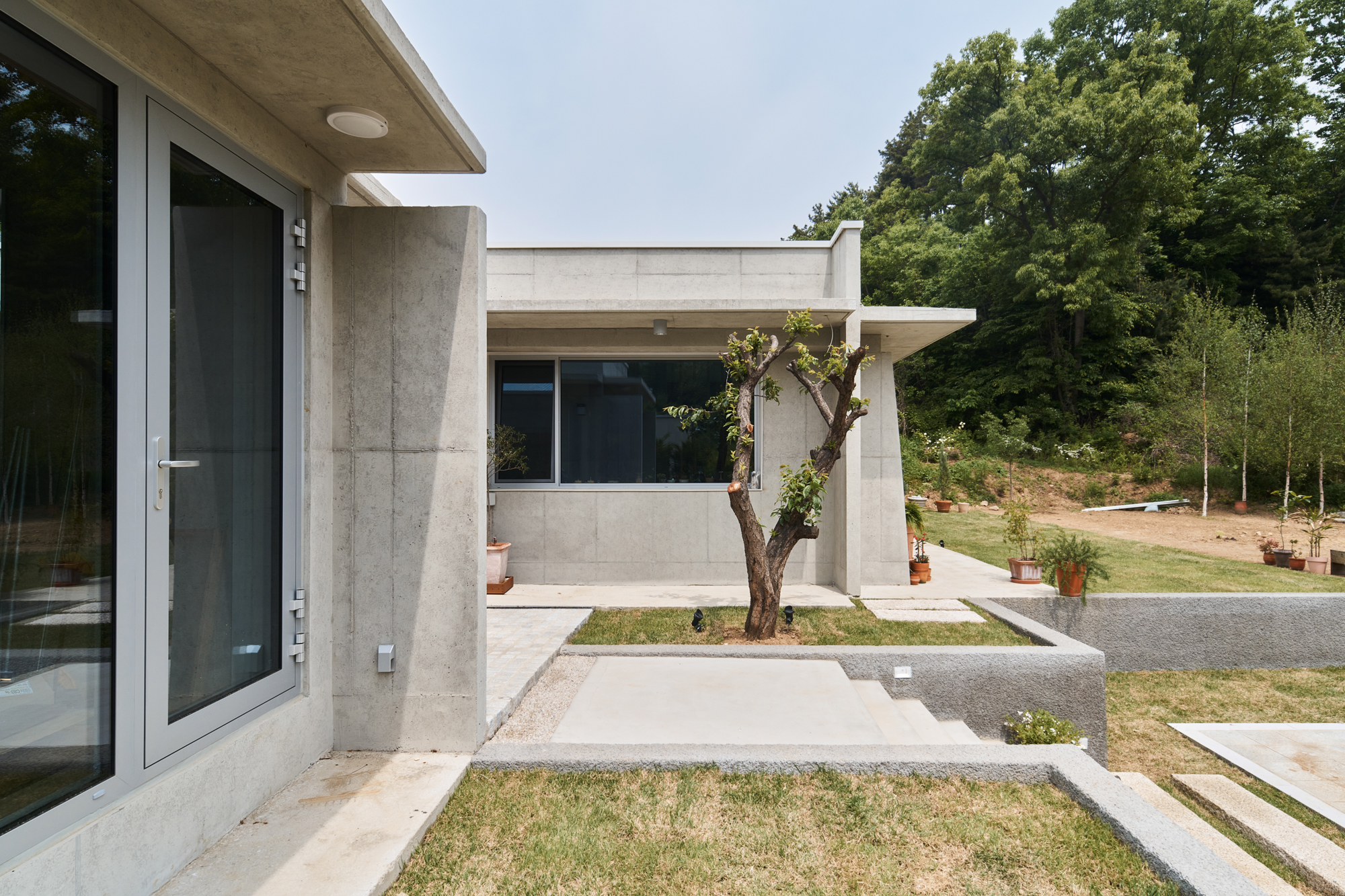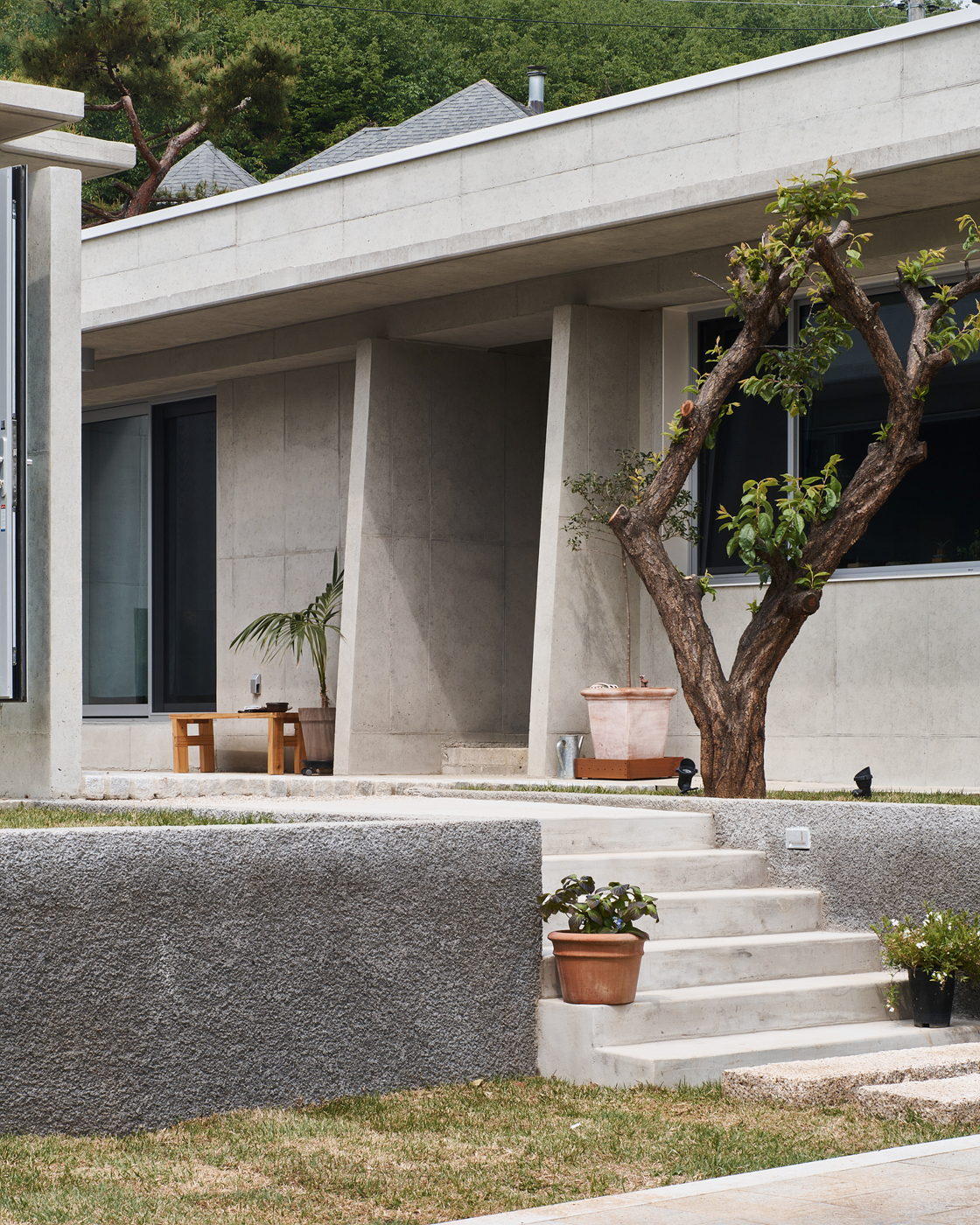 The Yeoju Seo-ga (Project to Save the Plum Tree) is a house designed with multiple levels on a unique-shaped site surrounded by both nearby and distant forests serving as a natural backdrop. The homeowner contemplated life after retirement and decided to build a house with a garden for his wife and a woodworking shop for himself. Based on these requests, two basic box-shaped forms emerged. The interior features a small courtyard, and a circular skylight in the woodworking shop harmonizes seamlessly. To complement the simplicity of the house's plan, design elements such as eaves, various columns, and combinations of different lines were employed to create multiple layers on the facade. The existing plum tree, which has been there for a long time, naturally establishes a sense of distance between the house and the shop. Low walls designed to embrace the tree, external stairs, and the main entrance yard create atmospheres within the living space. The interior and exterior are finished with exposed concrete, while cozy wooden ceilings and floors with warm tones are used to offset the cool feel. Careful attention was given to lighting and the colors of the doors. The main living areas, including the kitchen, dining room, and living room, were designed to be integrated into one space with different functions, achieved through thin partitions and columns rather than complete separation.