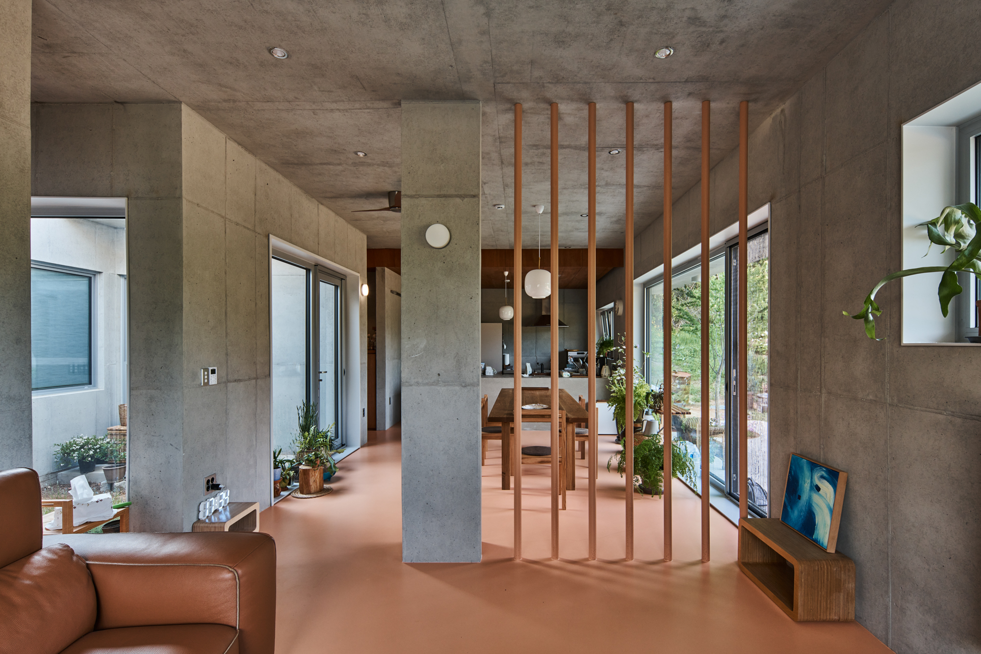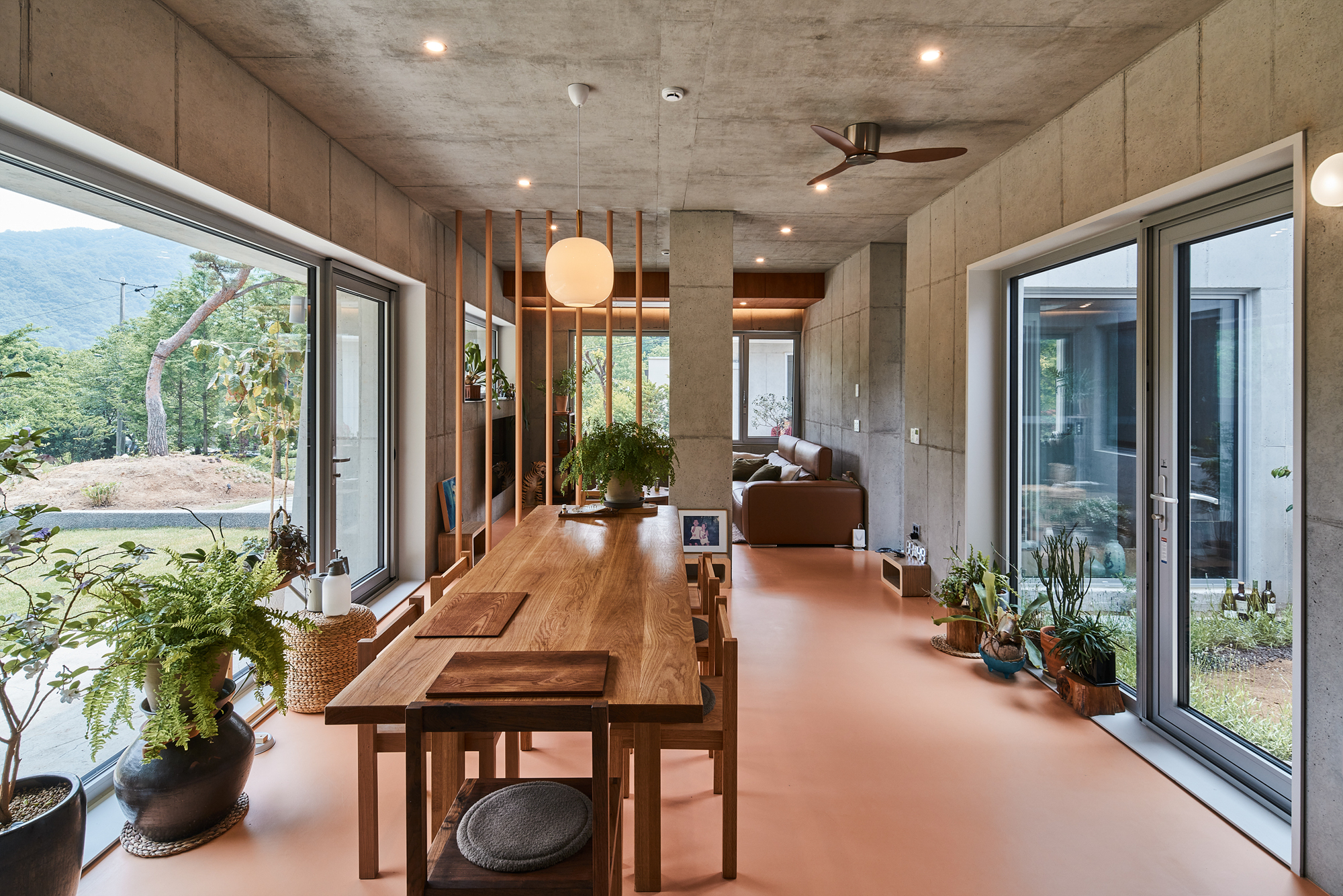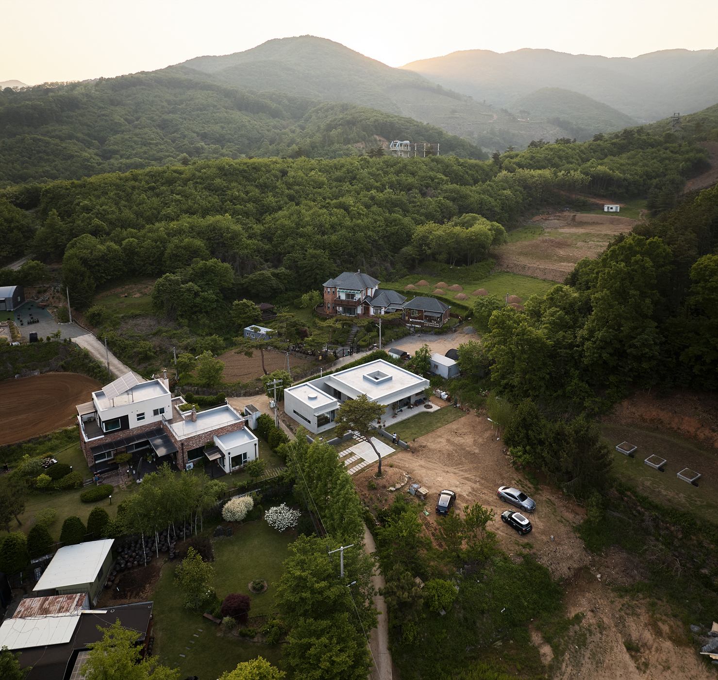 The Yeoju Seo-ga (Project to Save the Plum Tree) is a house designed with multiple levels on a unique-shaped site surrounded by both nearby and distant forests serving as a natural backdrop. The homeowner contemplated life after retirement and decided to build a house with a garden for his wife and a woodworking shop for himself. Based on these requests, two basic box-shaped forms emerged. The interior features a small courtyard, and a circular skylight in the woodworking shop harmonizes seamlessly. To complement the simplicity of the house's plan, design elements such as eaves, various columns, and combinations of different lines were employed to create multiple layers on the facade. The existing plum tree, which has been there for a long time, naturally establishes a sense of distance between the house and the shop. Low walls designed to embrace the tree, external stairs, and the main entrance yard create atmospheres within the living space. The interior and exterior are finished with exposed concrete, while cozy wooden ceilings and floors with warm tones are used to offset the cool feel. Careful attention was given to lighting and the colors of the doors. The main living areas, including the kitchen, dining room, and living room, were designed to be integrated into one space with different functions, achieved through thin partitions and columns rather than complete separation.