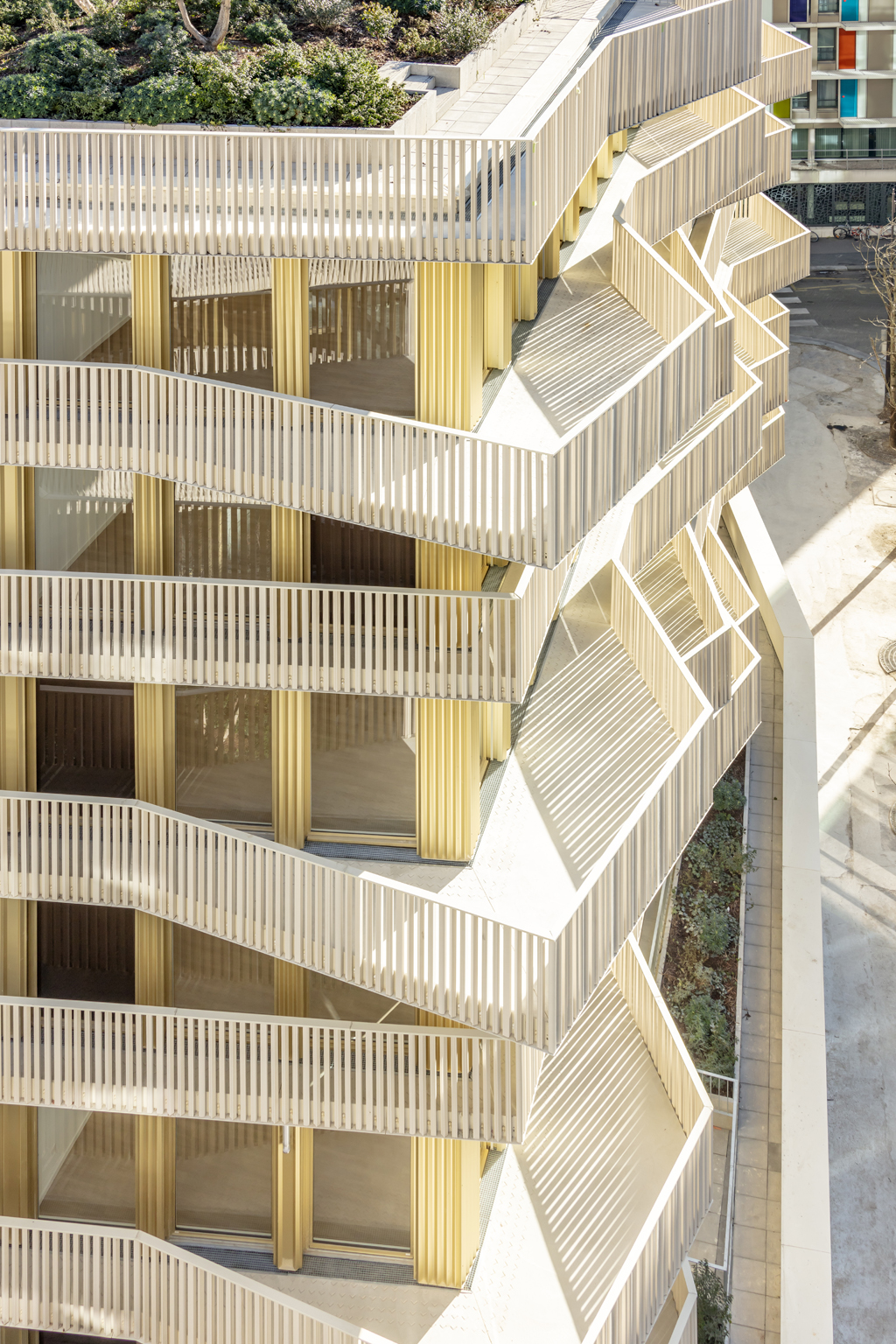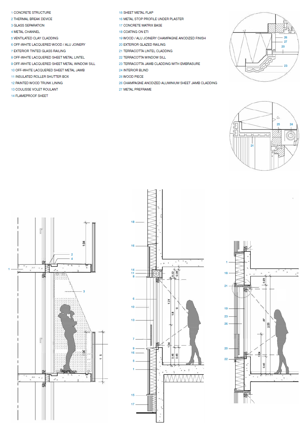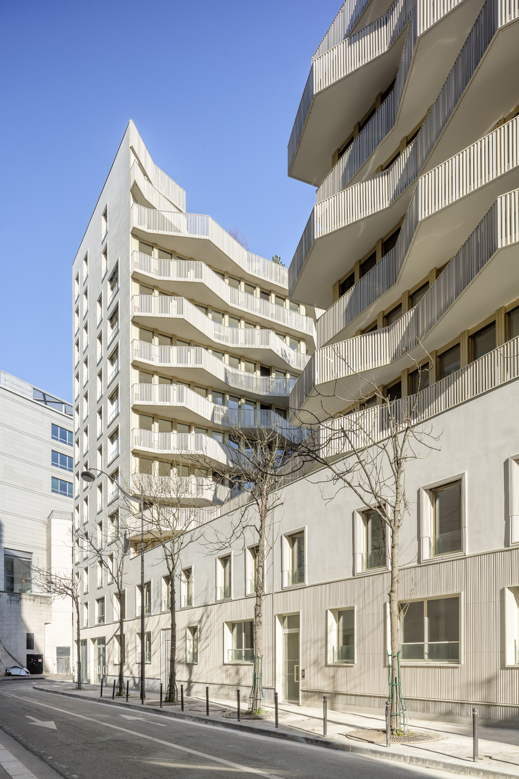 건축물의 입면은 크게 두 가지로 구분된다. 거리에서 마주치는 건축물의 정면은 깔끔하면서도, 반복적인 발코니 공간들이 입면에 드러나 볼륨의 리듬을 만든다. 반대로 블록 중심부를 향하는 건축물의 입면에는 따뜻하고 아늑한 느낌이 드는 베이지색의 큰 출입구가 있고, 발코니와 유리창이 규칙적으로 나타나는 것을 볼 수 있다. 공동주택의 중심부는 거리를 향해 열려 있으며, 다양한 식생들을 만날 수 있는 정원으로 꾸며져 있다. 건축가는 파리의 빽빽한 도시적 맥락 속에서 거주자들과 지나가는 사람들을 위한 신선하고 외딴섬 같은 휴식 공간을 만들고자 했다.