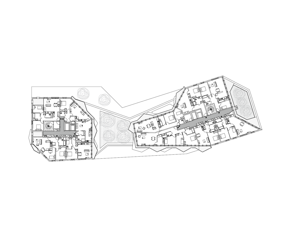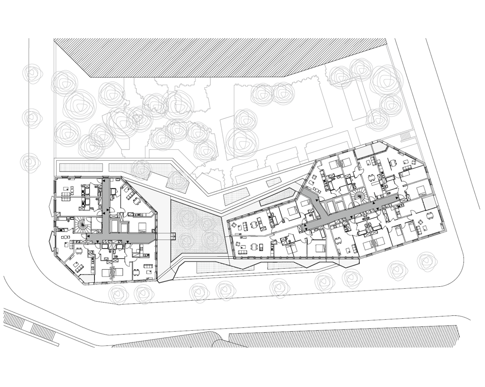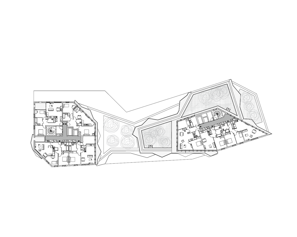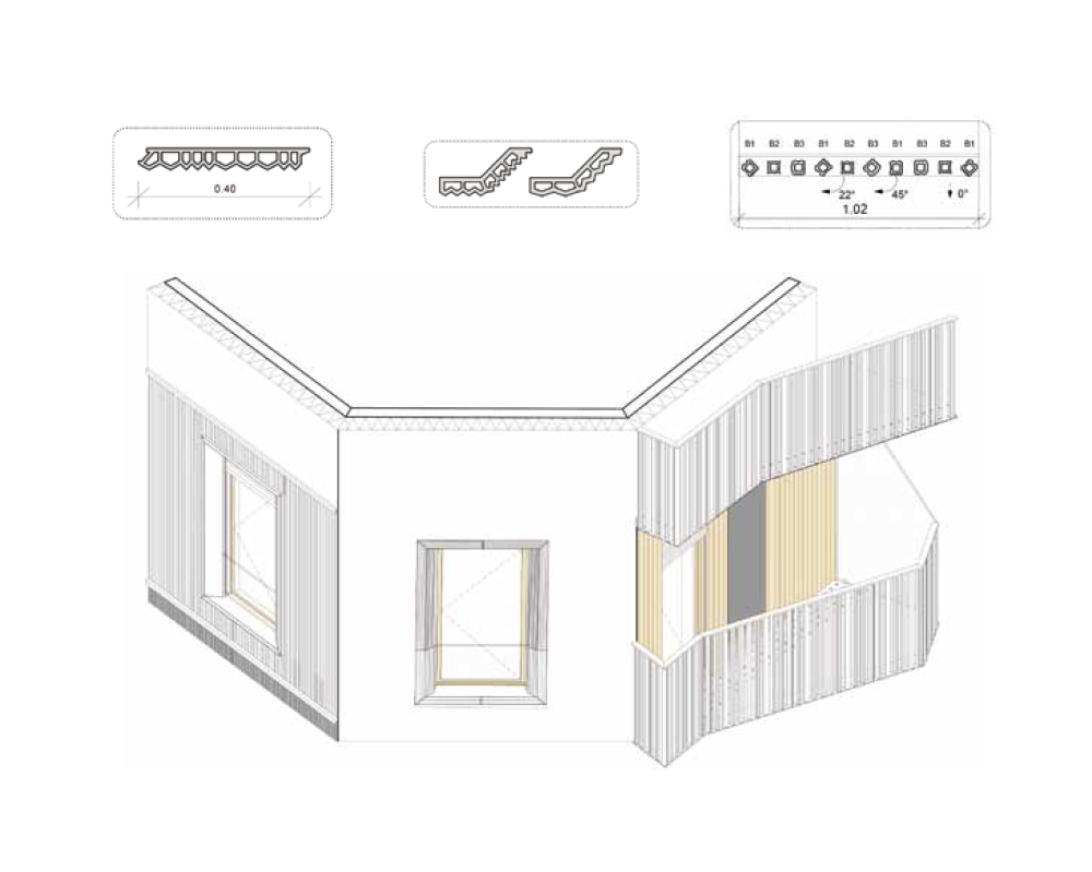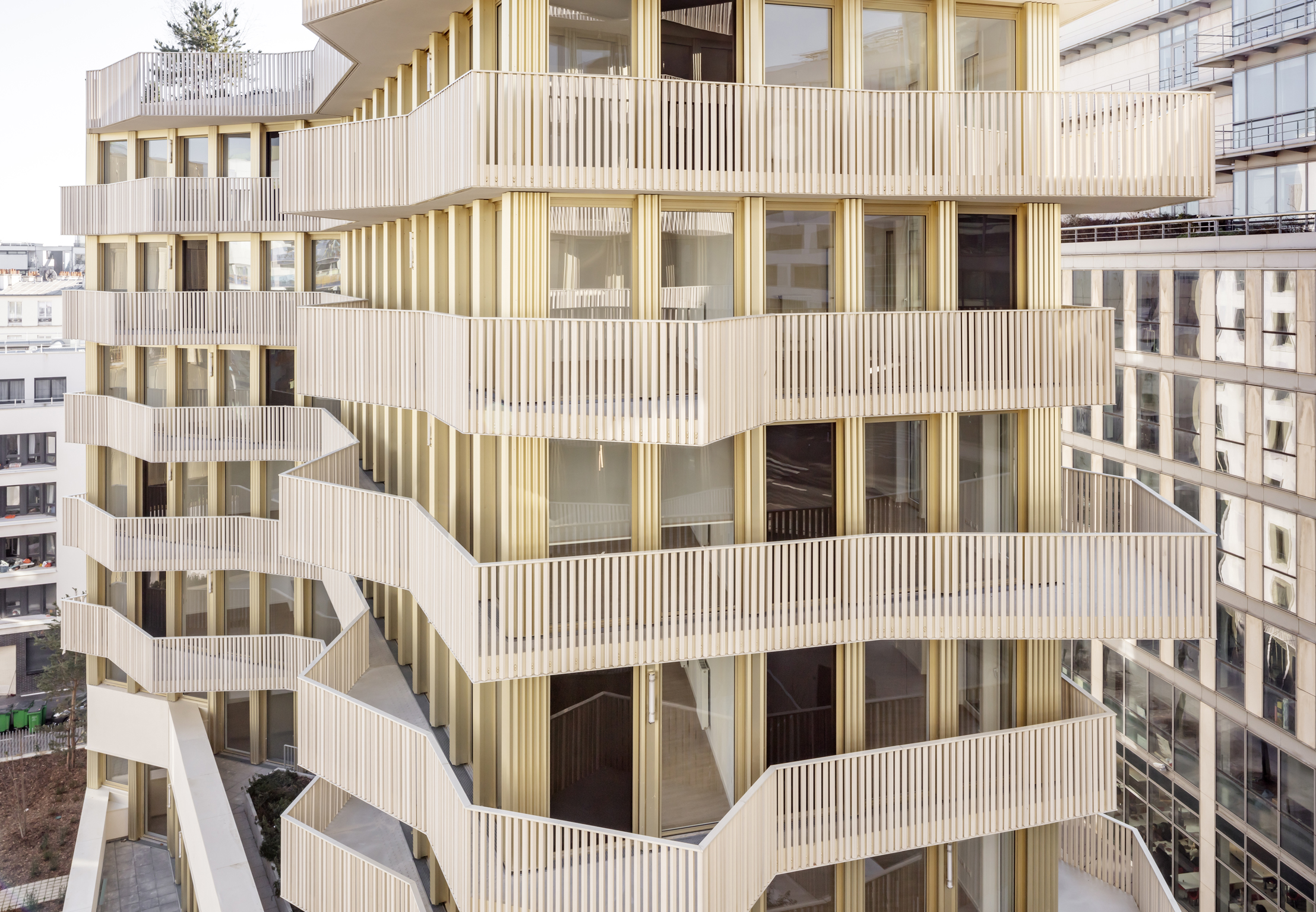 건축물의 입면은 크게 두 가지로 구분된다. 거리에서 마주치는 건축물의 정면은 깔끔하면서도, 반복적인 발코니 공간들이 입면에 드러나 볼륨의 리듬을 만든다. 반대로 블록 중심부를 향하는 건축물의 입면에는 따뜻하고 아늑한 느낌이 드는 베이지색의 큰 출입구가 있고, 발코니와 유리창이 규칙적으로 나타나는 것을 볼 수 있다. 공동주택의 중심부는 거리를 향해 열려 있으며, 다양한 식생들을 만날 수 있는 정원으로 꾸며져 있다. 건축가는 파리의 빽빽한 도시적 맥락 속에서 거주자들과 지나가는 사람들을 위한 신선하고 외딴섬 같은 휴식 공간을 만들고자 했다.