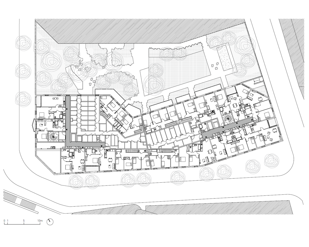 파리 오스터리츠역 남쪽에 자리 잡은 잭 풀턴 A5A2 공동주택은 이 지역의 급격하게 변화하는 도시 양상을 보여주는 건축물이다. 도시 블록 한 가운데에 거대한 몸집을 가진 이 공동주택은 상업시설과 주거시설이 같이 들어서 있다. 주거시설은 일반적인 공동주거 유닛 55가구와 사회적 약자를 위한 주거 유닛 65가구로 구성된다. 도시에서 센강을 바라볼 수 있다는 이점을 가진 주거용 건축물인 만큼 건축가는 공간 곳곳에 로지아, 발코니, 테라스를 배치하여 주거 공간 내에서 야외 공간을 만끽할 수 있도록 설계했다.