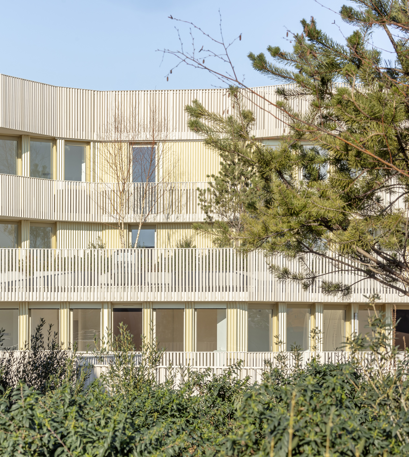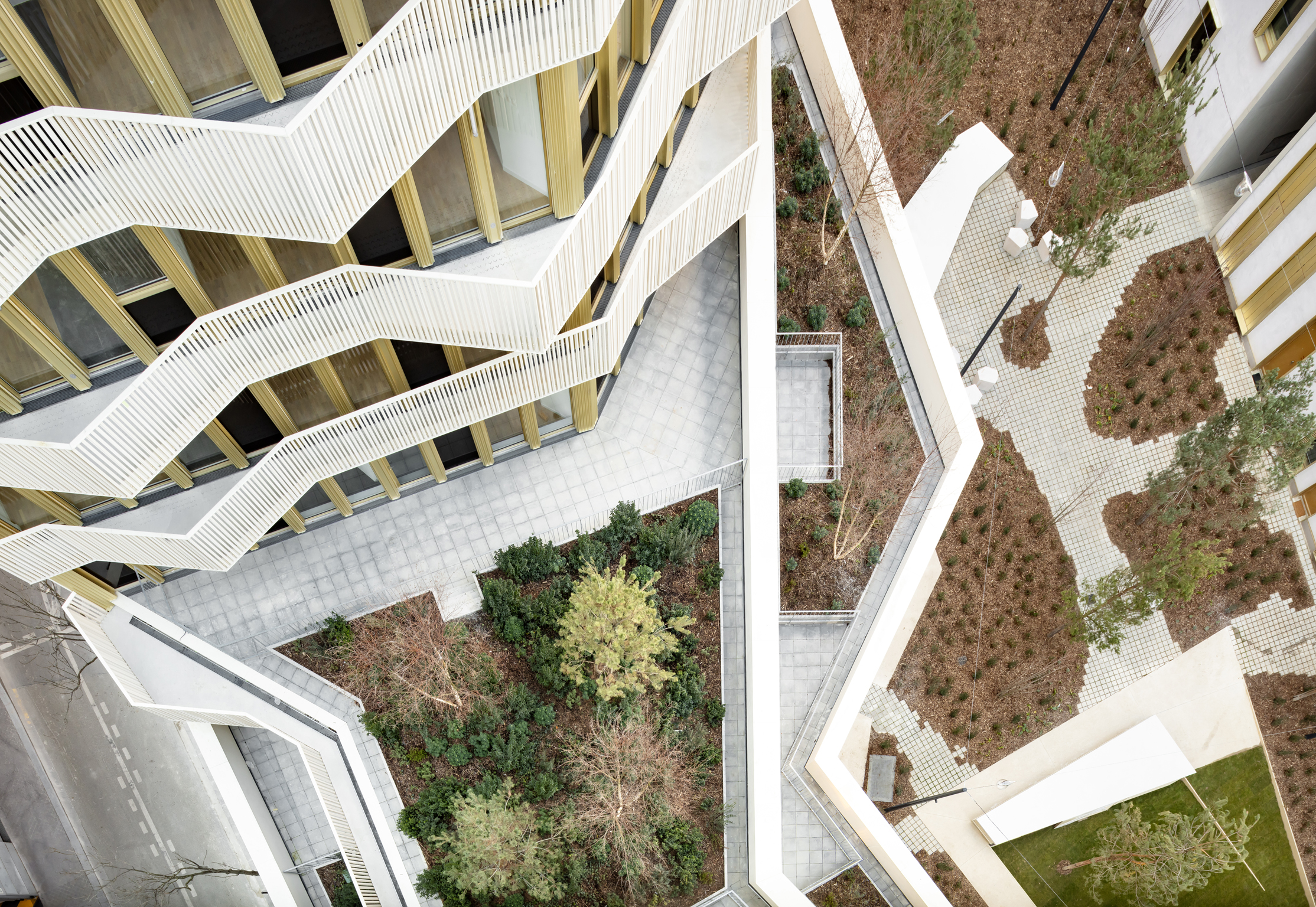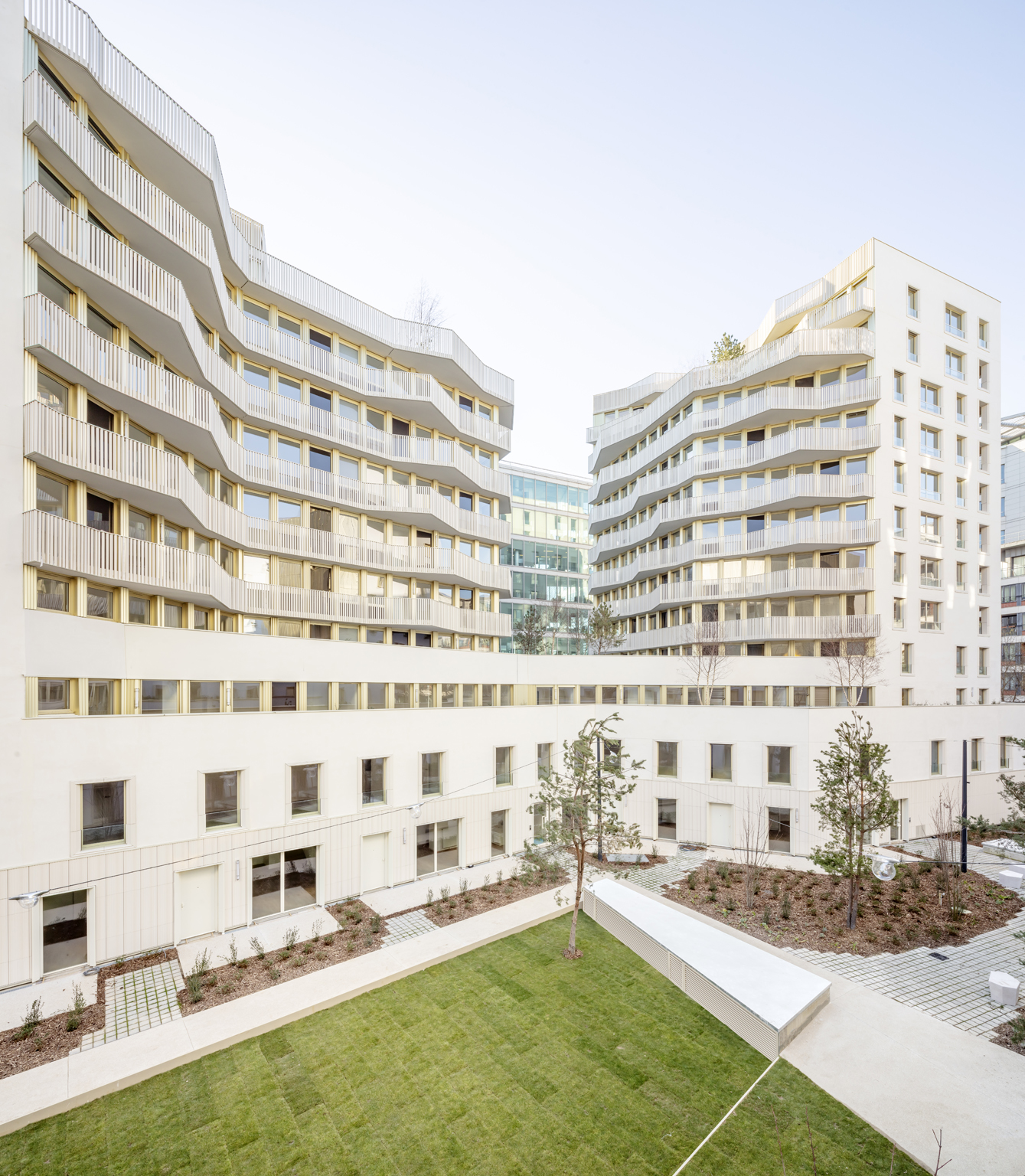 The facade of the building is divided into two distinct aspects. The front-facing facade, visible from the street, features a clean design with repetitive balconies creating a rhythmic pattern across the volume. Conversely, the facade directed towards the center of the block exhibits a warm and cozy atmosphere, characterized by a large beige entrance, balconies, and regularly placed glass windows. The central part of the residential complex is open toward the street and is adorned with a garden featuring assorted plant life. The architect created a refreshing and secluded oasis-like relaxation area for residents and passersby amidst the dense urban context of Paris.