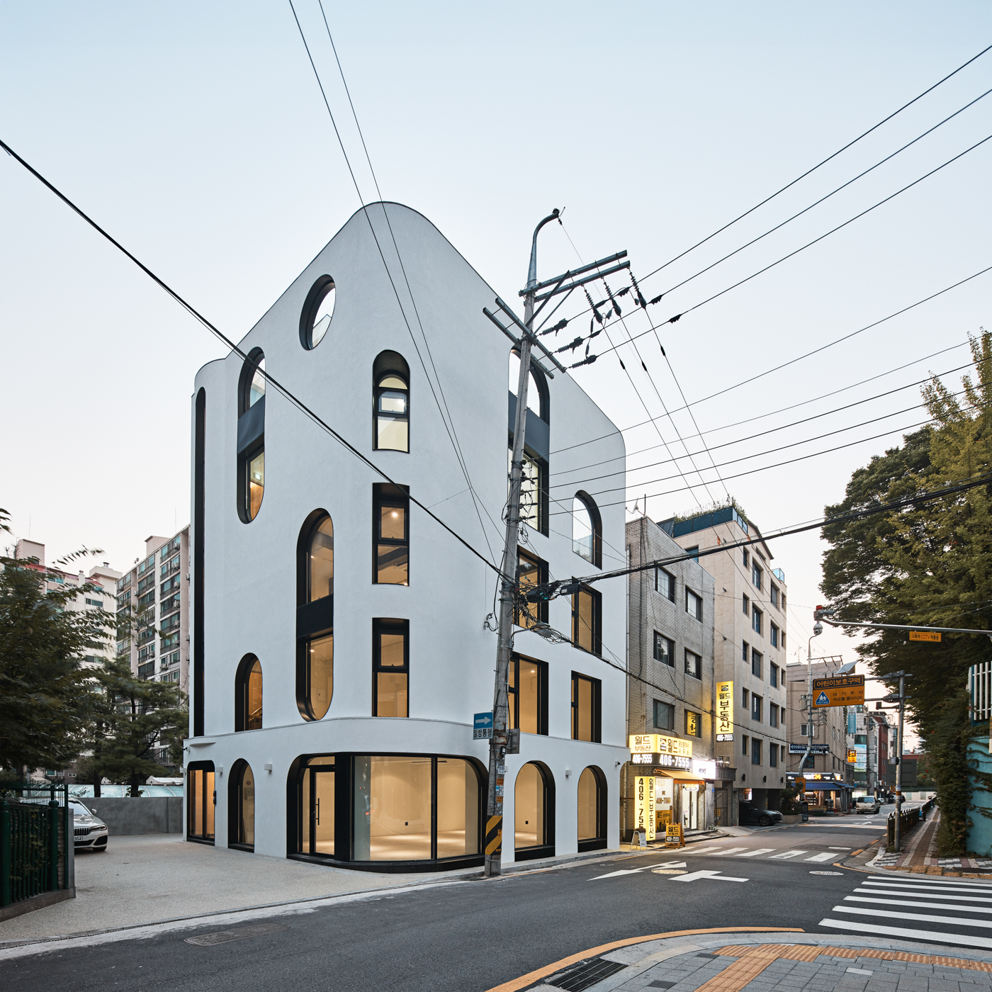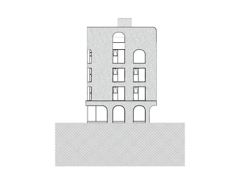 설계 초기, 건축주는 강력하게 ‘아치’형 디자인을 제시했다. 모든 입면에 아치로 된 창을 구성하길 원했다. 하지만 입면의 각각 면이 다르게 보이기 위해서는 아치만으로 모든 입면의 서로 다른 성격을 구현하는 건 무리가 있었다. 그래서 아치와 사각형의 조합을 통해 표현의 다양성을 만들기로 했다. 사각형은 강력한 구조와 안정성을 부여하고 곡선은 유연하고 유기적인 미적 감각을 더했다. 메인 입면인 남측은 아치를 높은 비율로 사용하여 메인 가로의 다른 건물들과 대비감을 강조하여 건물의 가시성을 극대화하였고 동측은 학교와 맞닿아 있지만 생활 가로의 마지막 부분과 닿아 있어 주로 사각형 창을 통해 생활 가로의 건물들과 조화를 이루면서 건물의 상층부에만 아치를 적용하여 은은한 포인트를 주었다. 이처럼 서로 다른 입면의 모습은 자칫 지루할 수 있는 평면적 건물에 입체적 성격을 부여하고 그로 인해 도시에 활력을 불어넣는 역할을 한다.