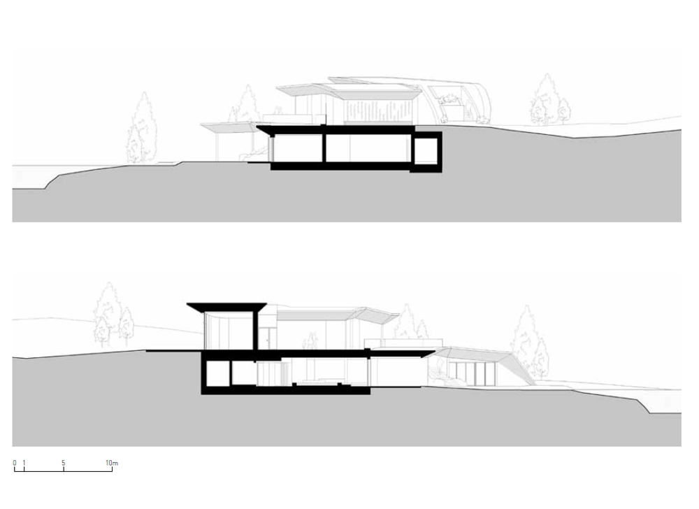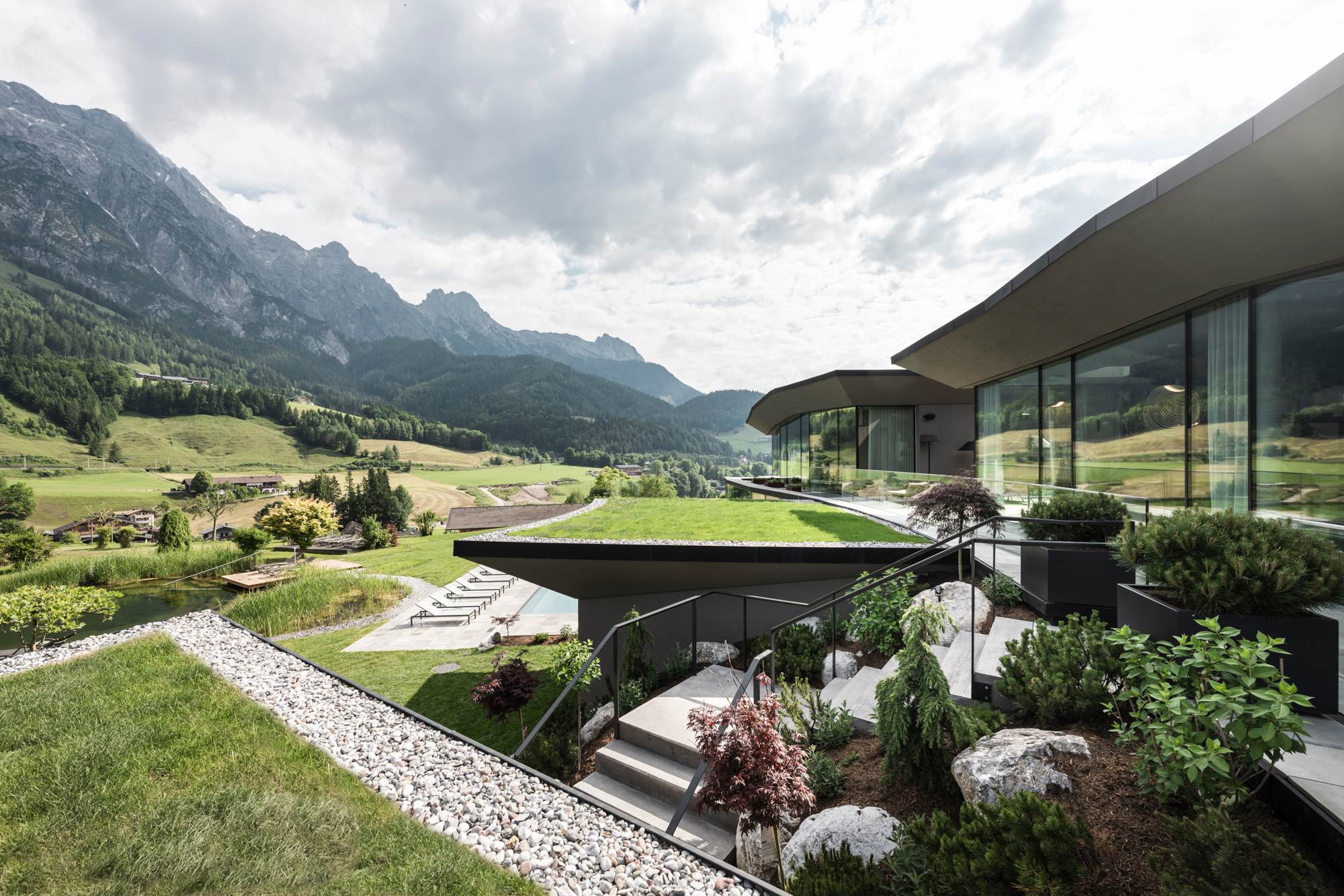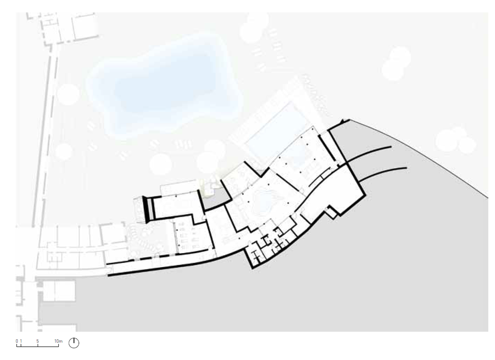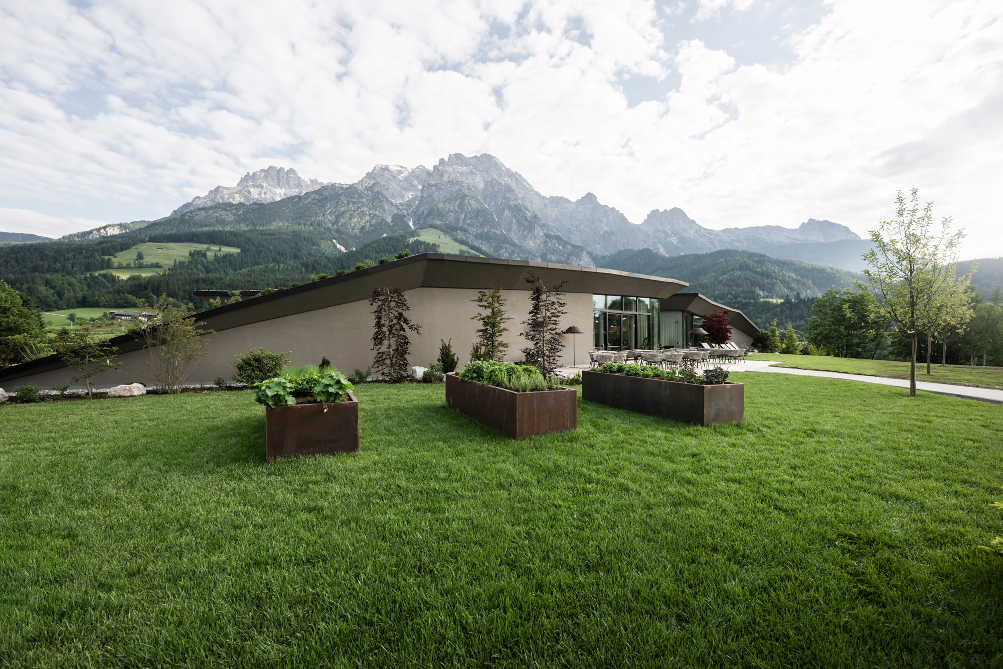 건축가는 주변의 산세가 보여주는 인상적인 풍경에 초점을 맞추어 이 리조트를 계획했다. 방문객의 수요에 따라 새로운 스파 컨셉의 공간을 제안했으며, 웰니스와 스포츠 영역이 주요 프로그램으로 포함됐다. 피트니스, 요가룸, 라운지 등이 포함된 새로운 건물은 자연 지형과 혼합하여 동심원의 열로 배치되어, 어느 방향에서 접근하든 내부의 스파, 초원, 언덕을 마주하는 각각의 색다른 뷰를 만들어 낸다. 웰니스와 숙소, 레스토랑으로 분할된 방을 연결하는 라운지에는 개방적인 독특한 벽난로, 화분과 융단을 배치하여 아늑한 곳에서 휴식을 취하며 경치를 즐길 수 있다. 상층에는 호수, 수영장, 하늘의 인상적인 전망을 바라볼 수 있는 고급스러운 레스토랑이 있다. 레스토랑과 인접한 테라스의 돌출된 지붕의 기울기는 보는 각도에 따라 풍경에 대한 인식에 강한 영향을 주며, 건축적 실루엣을 다채롭게 변화시킨다.