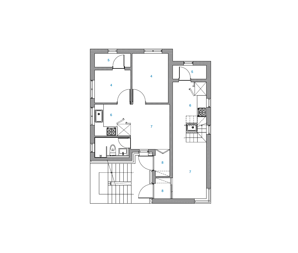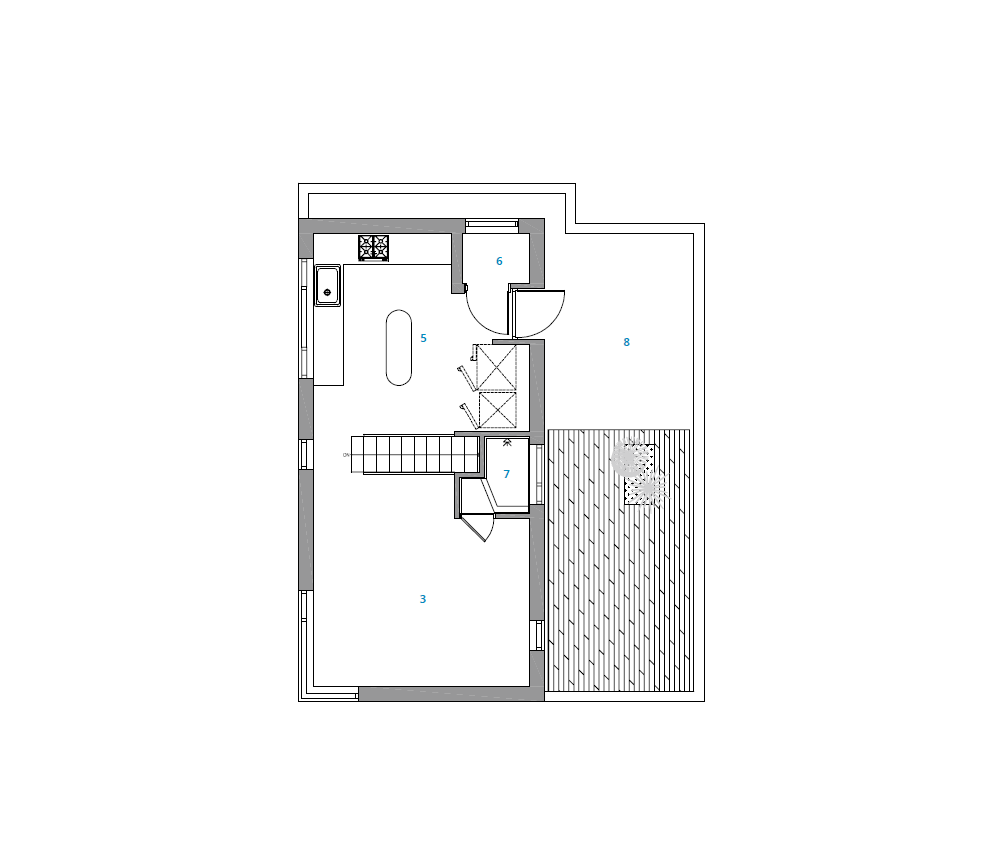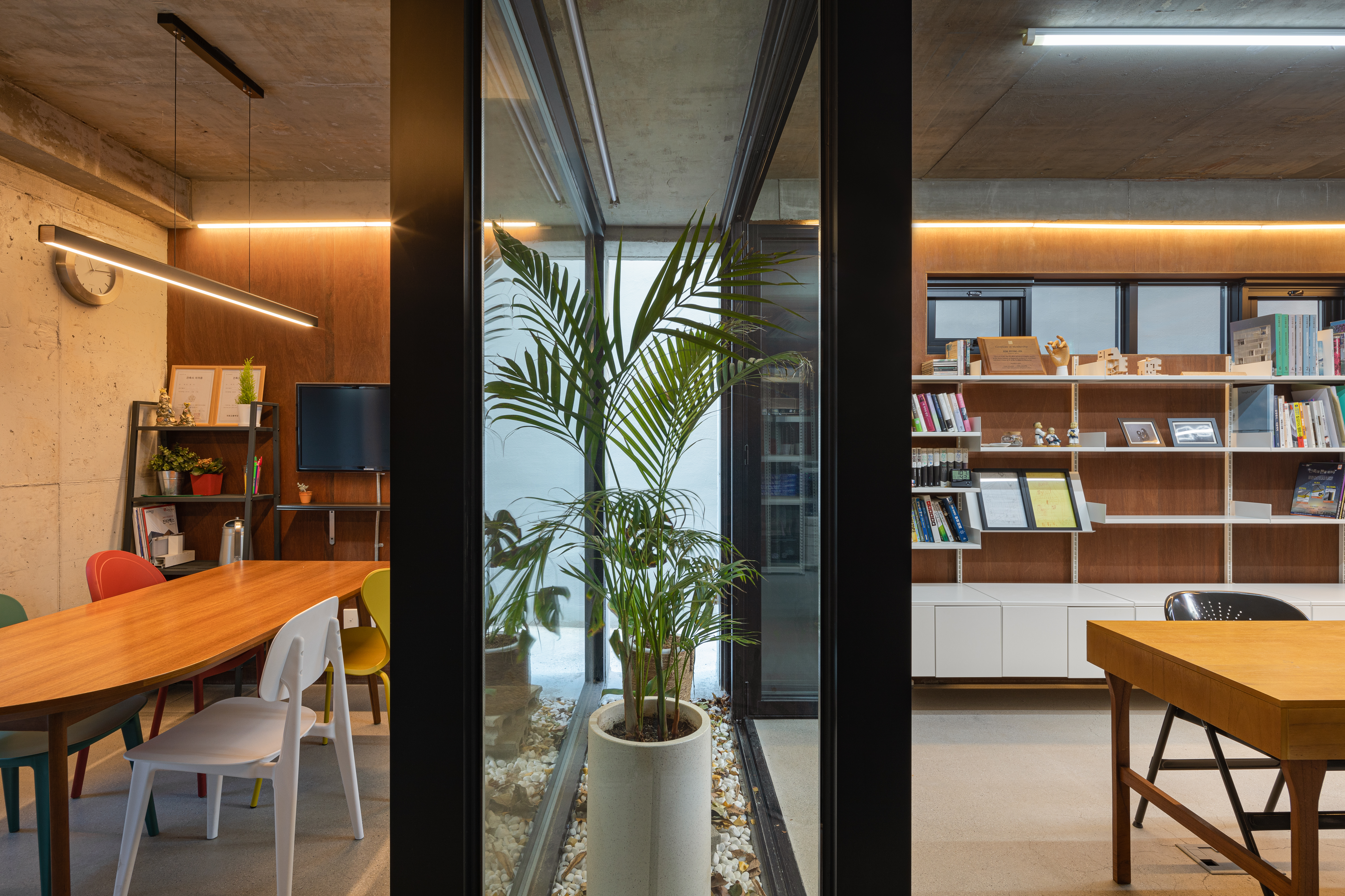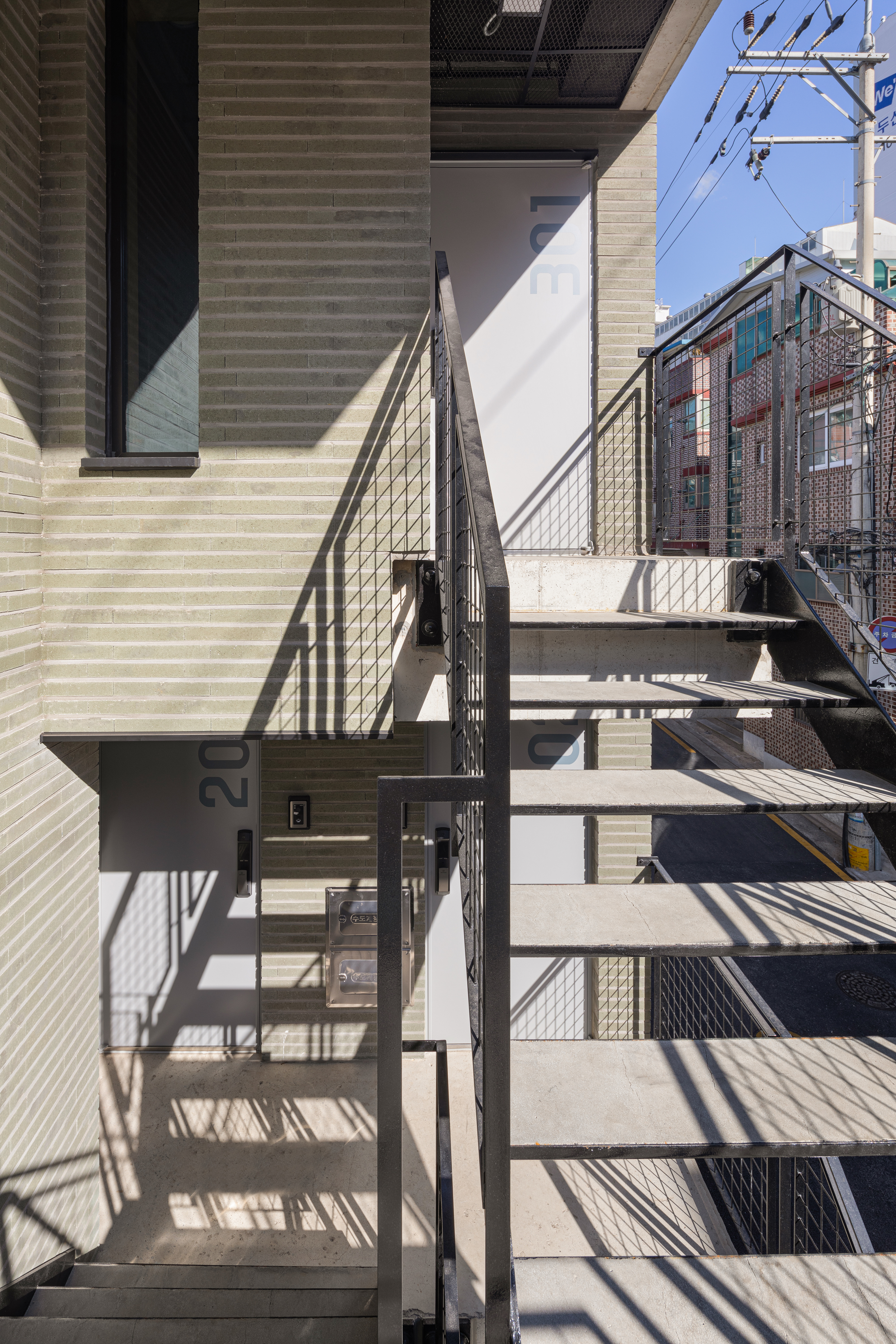 1층 근린생활시설 남쪽으로는 외부 환경 유입과 실내 환기 순환을 고려하여 슬릿한 오픈부를 만들어주었다. 그리고 마감재인 노출콘크리트와 시멘트 벽돌의 일차적인 물성을 건물 외부와 내부에서 이질감 없이 연계할 수 있도록 표현하였다. 단층의 투룸과 복층의 투룸으로 형성된 2층 임대 세대는 동네의 특성상 원룸의 수요보다는 신혼 부부나 젊은 세대의 수요가 많을 것이라 예상하였다. 건축주 세대인 3층 일부와 4층은 내부 계단을 둔 복층으로 계획하여 침실과 욕실을 콤팩트하게 3층에 계획하고, 거실과 주방과 옥상을 연계한 4층은 가족들이 온종일 머물 수 있도록 여유 있게 계획했다. 그리고 공용부는 법적인 최소의 면적을 유지하되 동네로 향한 생동감 있는 모습을 연출할 수 있도록 오픈된 철제 계단으로 계획하였다.